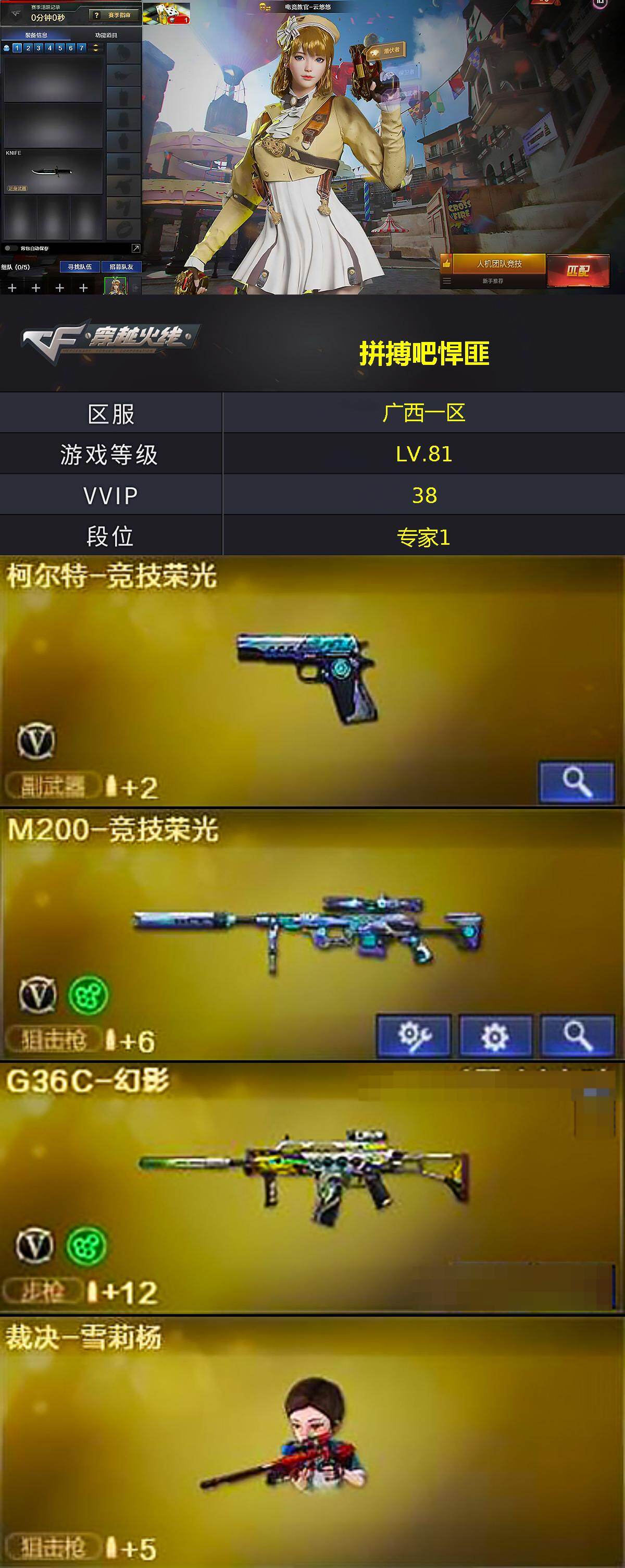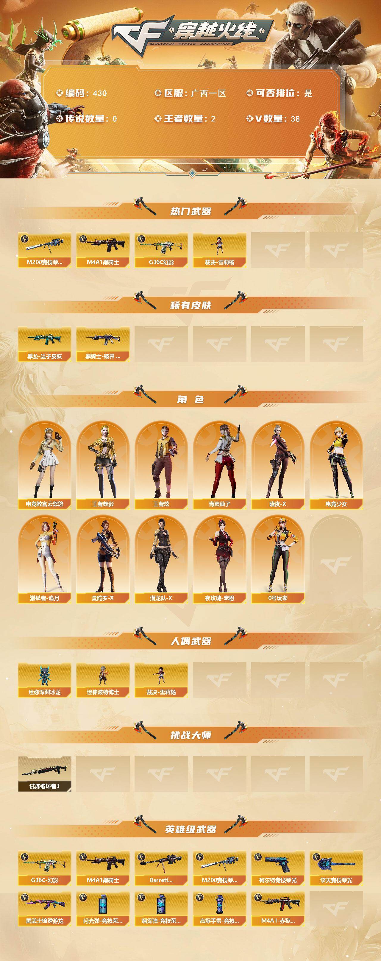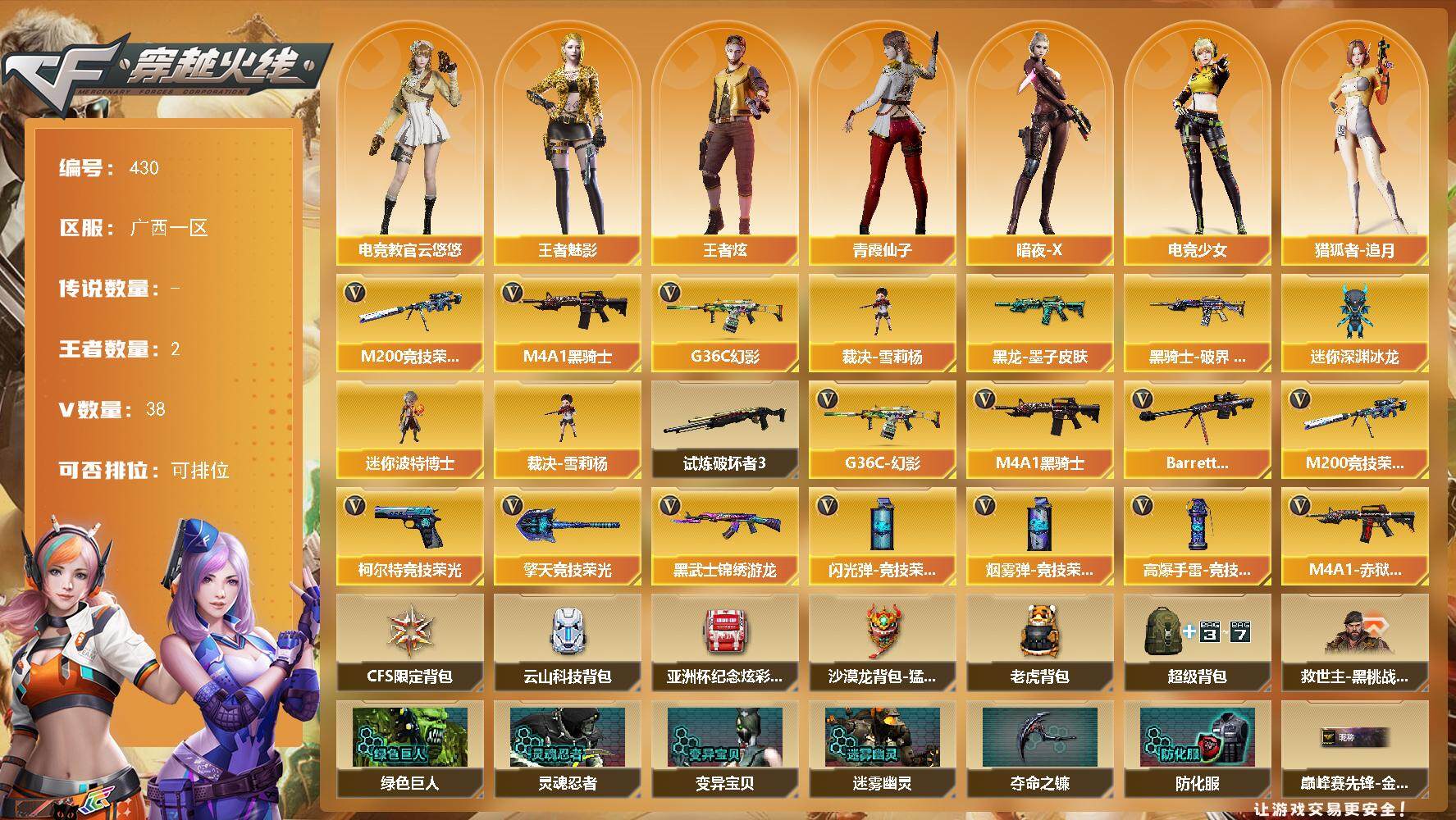 [14612943]广西一区-38V-2王者-0炫金 【热门武器】:G36C-幻影,M200-竞技荣光,M4A1-黑骑士,裁决-雪莉杨 【皮肤】:黑龙-墨子皮肤,黑骑士-破界 皮肤 【角色】:电竞教官-云悠悠,王者炫,王者-魅影,暗夜-X,电竞少女,猎狐者-追月,0号玩家,曼陀罗-X,潜龙队-X,青霞仙子,夜玫瑰-宠粉 【人偶武器】:裁决-雪莉杨,迷你深渊冰龙*2,迷你波特博士 【挑战大师】:试炼破坏者III 【英雄级武器】:M4A1-黑骑士,G36C-幻影,黑武士-锦绣游龙,Barrett-毁灭*2,M200-竞技荣光,柯尔特-竞技荣光,擎天-竞技荣光*3,高爆手雷-竞技荣光*8,闪光弹-竞技荣光*9,烟雾弹-竞技荣光*9,M4A1-赤狱骑士 【道具】:CFS限定背包,云山科技背包,亚洲杯纪念炫彩背包,沙漠龙背包-猛男专属,老虎背包,超级背包,救世主-黑桃战神,绿色巨人,灵魂忍者*2,变异宝贝,迷雾幽灵*2,夺命之镰,防化服*3,星辰流光-枪王排位,巅峰赛先锋-金色流光,流光-再燃火线,枪王排位28赛季金色流光,枪王排位29赛季金色流光,EP战队名片,EP战队喷图,防弹头盔*3,防弹衣*3,C4工具钳*3,手雷包*3 【特殊枪械】:1黑骑士