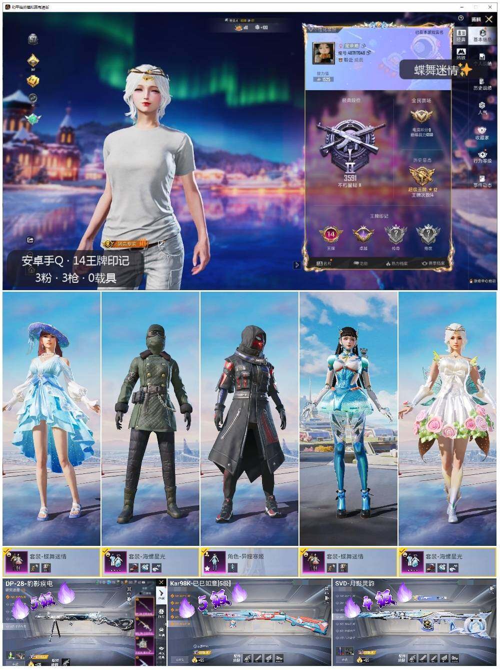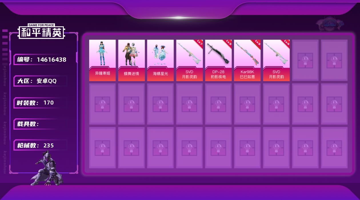 - PX_2058350- 安卓手Q-5王牌印记-2粉装-8特效枪-2载具-52070热力值-103套装-160枪皮-2卓越印记-0传奇印记 【2粉装】,雪月幻音,星之彼岸 【8特效枪】SCAR-L-锦绣绵绵-4级 M416-电玩时刻-5级 GROZA-镜光银凌-5级 AUG-暖羊咩咩-5级 M762-青锋波束-5级 Kar98K-巳巳如意-5级 Mk14-甜梦熊击-5级 UMP45-量子极限-5级