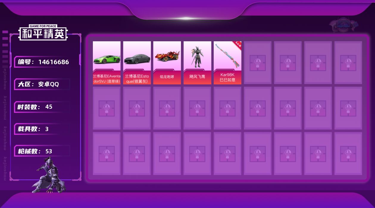[14616686]可二次【店主推荐捡漏号!可直接换绑】 安卓 手Q-1粉装-1特效枪-3载具-1粉色飞行器-1.9w热力值-1王牌印记-45套装-53枪皮【热门品类】:套装-龟仙人,套装-粉红小猪【粉色载具】:兰博基尼Aventador SVJ(翡翠绿),兰博基尼Estoque(银翼灰),焰龙咆哮【粉色套装】:粉装-飓风飞鹰【粉色枪皮等级】:Kar98K-巳巳如意(四级)【粉色飞行器】:辉耀战甲飞行器