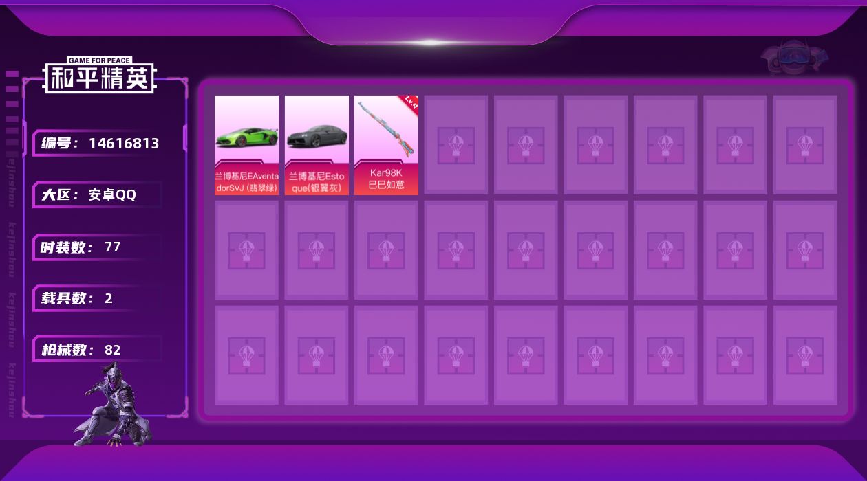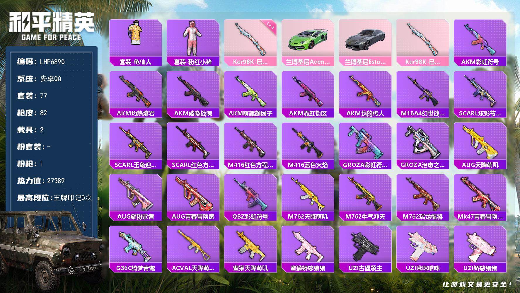 [14616813]可二次【店主推荐捡漏号!可直接换绑】 安卓 手Q-1特效枪-2载具-2.7w热力值-1王牌印记-77套装-82枪皮【热门品类】:套装-龟仙人,套装-粉红小猪【粉色载具】:兰博基尼Aventador SVJ(翡翠绿),兰博基尼Estoque(银翼灰)【粉色枪皮等级】:Kar98K-巳巳如意(四级)