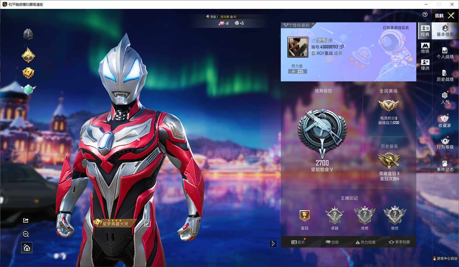 - PX_2089820-贵族等级: V5 英雄数: 121 皮肤数: 123 传说皮: 山海·炽霜斩,幻光神枪 限定皮: 游园惊梦,高山流水,五谷丰年,鸣野蒿,愿照·山河定,愿照·九州拓