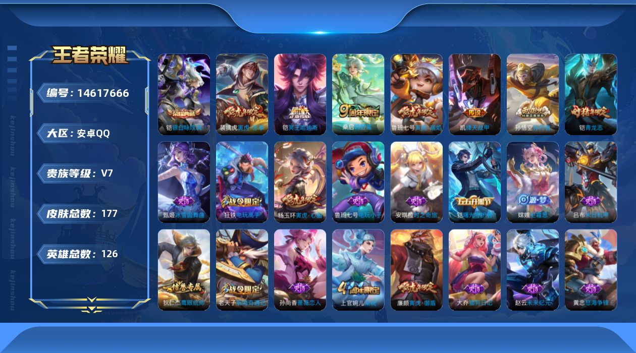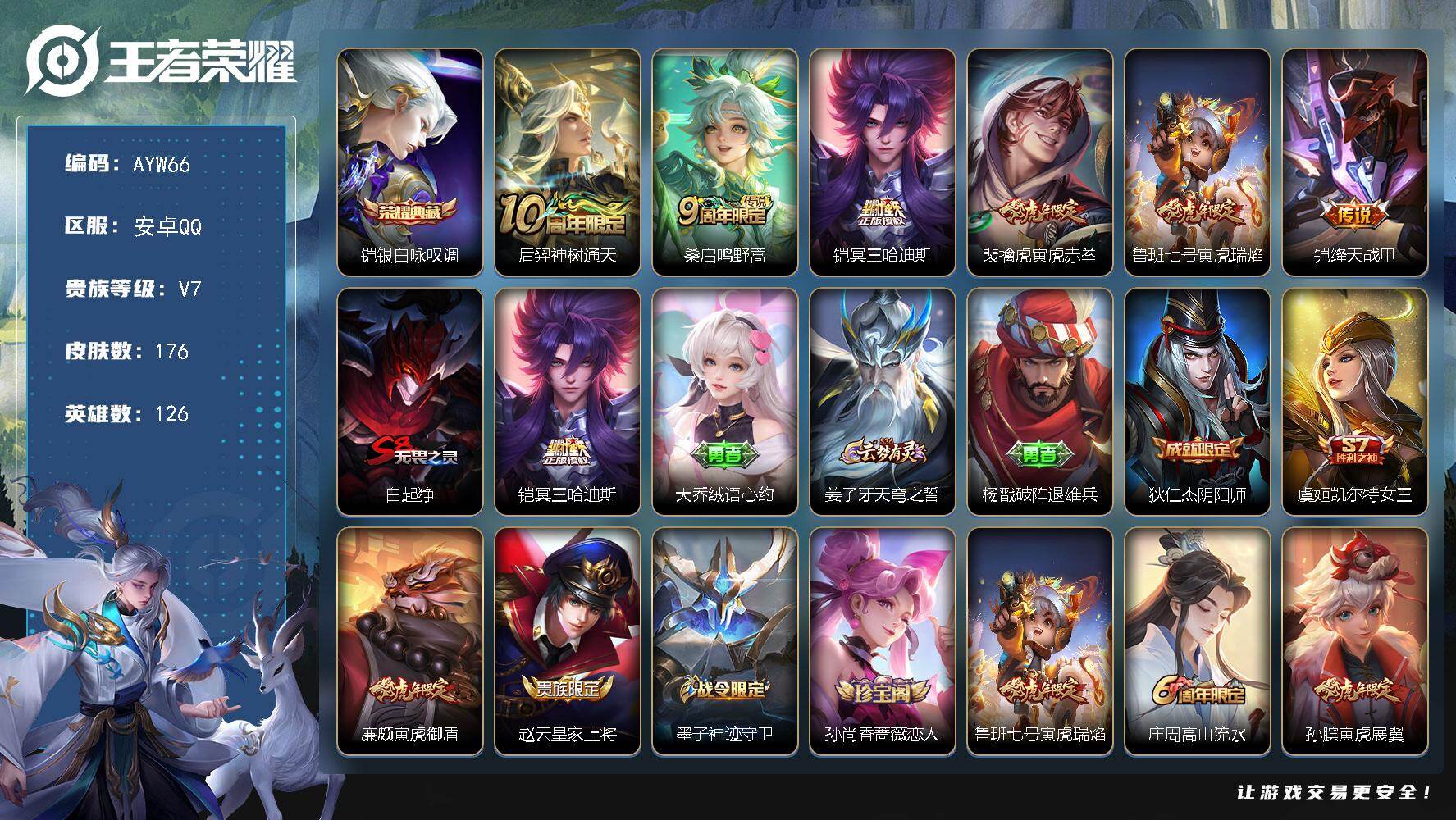 [14617666]可二次【店主推荐捡漏号!可直接换绑】安卓Q-V7-尊贵铂金III段位-126英雄-176皮肤-1典藏皮肤-6传说-35史诗 【英雄全皮】:影全皮 【荣耀典藏】:铠银白咏叹调 【传说皮肤】:后羿神树通天,桑启鸣野蒿,铠冥王哈迪斯,裴擒虎寅虎赤拳,鲁班七号寅虎瑞焰,铠绛天战甲 【限定皮肤】:白起狰,铠冥王哈迪斯,大乔绒语心约,姜子牙天穹之誓,杨戬破阵退雄兵,狄仁杰阴阳师,虞姬凯尔特女王,廉颇寅虎御盾,赵云皇家上将,墨子神迹守卫,孙尚香蔷薇恋人,鲁班七号寅虎瑞焰,庄周高山流水,孙膑寅虎展翼,扁鹊炼金王,白起夜都怪侠,芈月幻夜卜梦,曹操烛龙,狄仁杰魔术师,达摩沙漠行僧,项羽海滩派对,老夫子醍醐杖,老夫子航海奇遇记,程咬金演武夺筹,王昭君午后时光,兰陵王金庭之子,孙悟空孙行者,后羿圣弓游侠,李元芳云中旅人,钟馗驱傩正仪,杨玉环寅虎心曲,干将莫邪真爱魔法,太乙真人饕餮,黄忠火炮绅士,铠青龙志,苏烈千军破阵,弈星混沌棋,沈梦溪大漠名商,明世隐疑决卦,明世隐吟游魔法,裴擒虎寅虎赤拳,狂铁电玩高手,上官婉儿梁祝,嫦娥拒霜思,鬼谷子天穹祈灯,刘邦剑破天穹,程咬金群星魔术团,刘备异域游侠,周瑜熔金海岸 【年限皮肤】:铠青龙志,裴擒虎寅虎赤拳,孙膑寅虎展翼,鲁班七号寅虎瑞焰,杨玉环寅虎心曲,廉颇寅虎御盾 【赛季限定】:扁鹊炼金王,白起狰,曹操烛龙,达摩沙漠行僧,老夫子醍醐杖,程咬金演武夺筹,兰陵王金庭之子,李元芳云中旅人,虞姬凯尔特女王,钟馗驱傩正仪,太乙真人饕餮,苏烈千军破阵,弈星混沌棋,沈梦溪大漠名商,明世隐疑决卦,鬼谷子天穹祈灯,刘邦剑破天穹,姜子牙天穹之誓 【战令限定】:墨子神迹守卫,白起夜都怪侠,芈月幻夜卜梦,老夫子航海奇遇记,王昭君午后时光,后羿圣弓游侠,干将莫邪真爱魔法,黄忠火炮绅士,明世隐吟游魔法,狂铁电玩高手 【史诗皮肤】:鲁班七号电玩小子,赵云皇家上将,赵云未来纪元,貂蝉圣诞恋歌,甄姬冰雪圆舞曲,王昭君偶像歌手,狄仁杰魔术师,宫本武藏鬼剑武藏,孙尚香蔷薇恋人,孙尚香水果甜心,嬴政摇滚巨星,妲己魅力维加斯,吕布圣诞狂欢,吕布末日机甲,张飞乱世虎臣,铠曙光守护者,程咬金功夫厨神,孙策猫狗日记,大乔猫狗日记,铠青龙志,狄仁杰鹰眼统帅,上官婉儿梁祝,老夫子航海奇遇记,干将莫邪真爱魔法,安琪拉时之奇旅,孙悟空孙行者,庄周高山流水,嫦娥拒霜思,黄忠火炮绅士,杨玉环寅虎心曲,廉颇寅