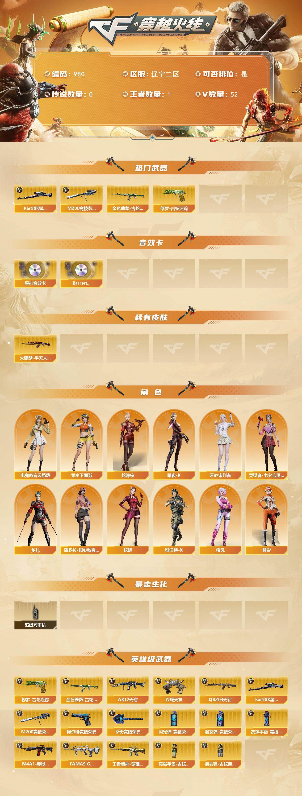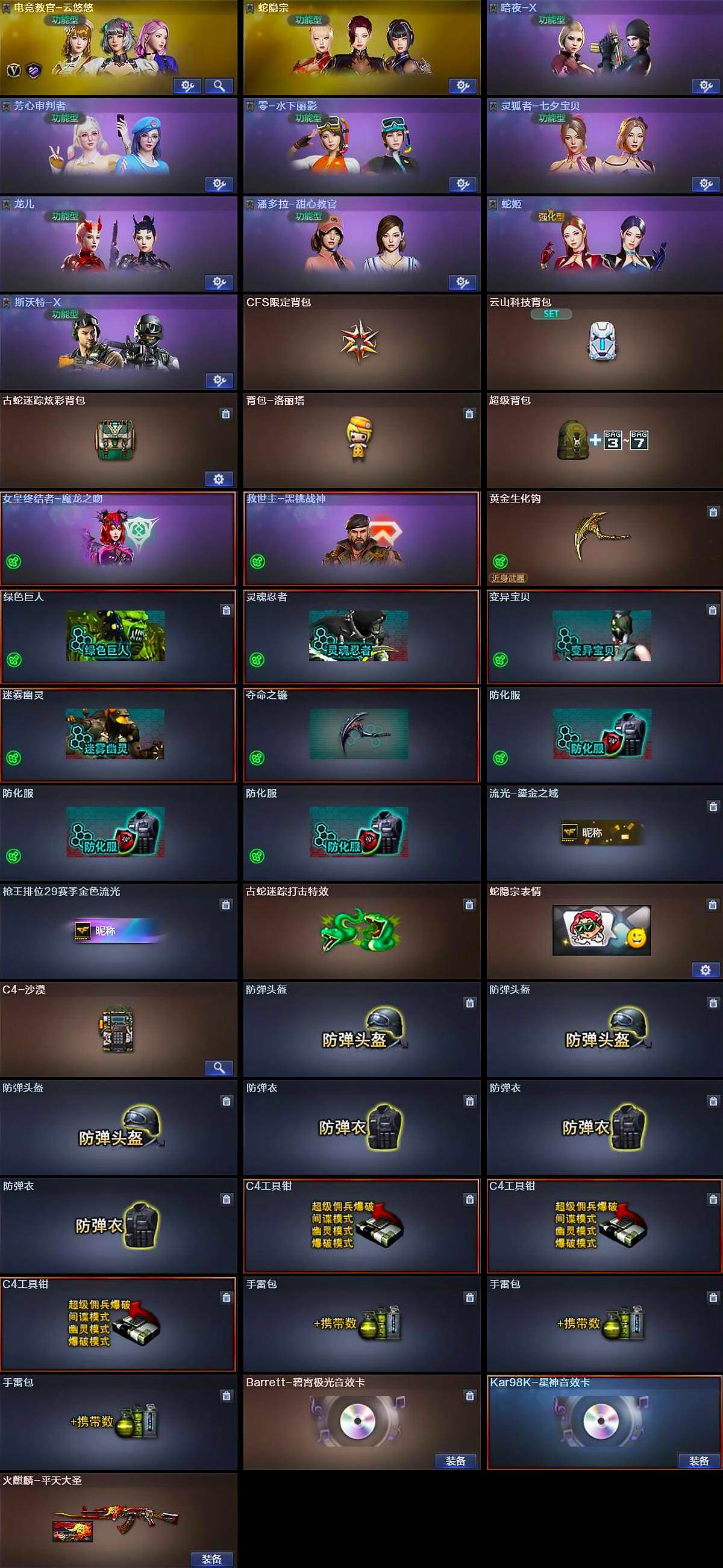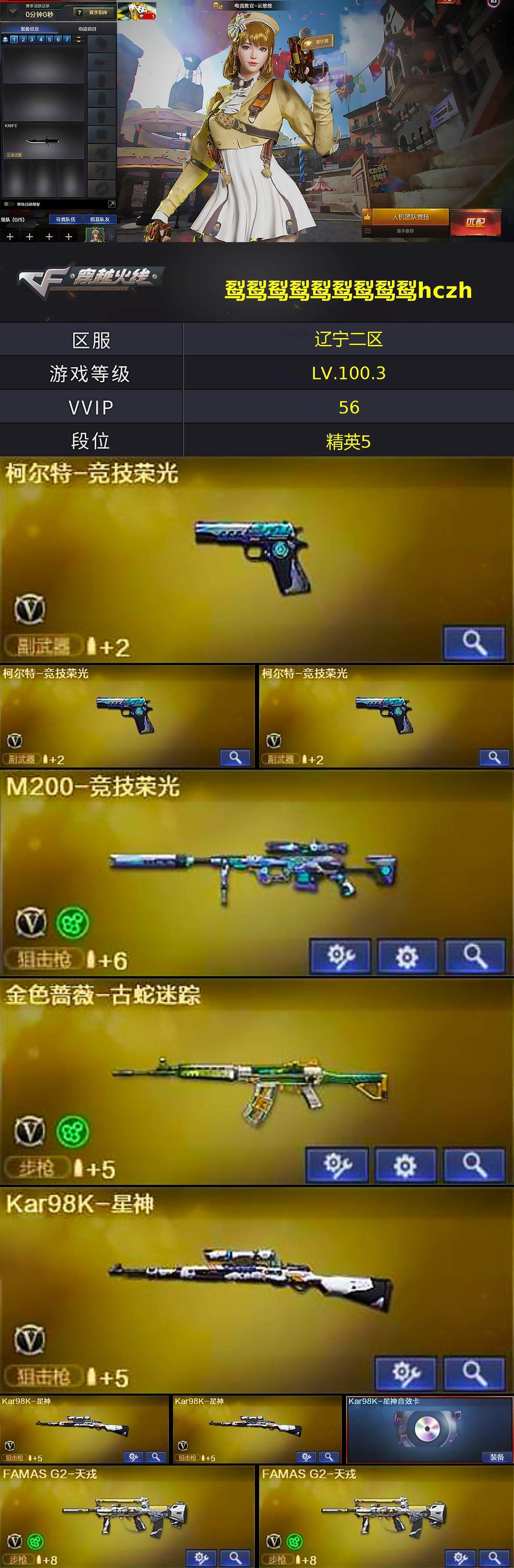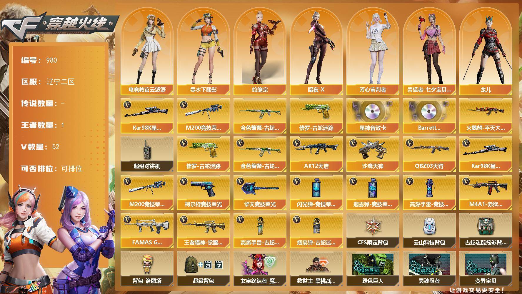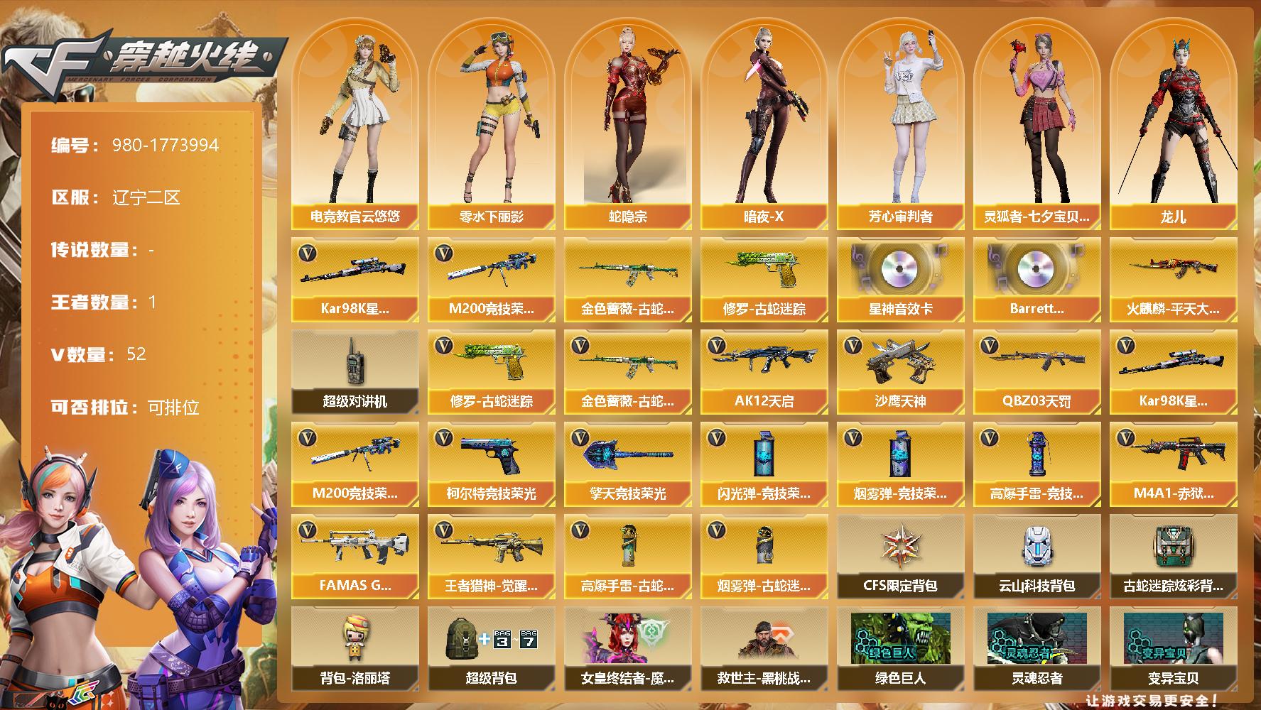 [14629972]51V/100级/元帅/1王者/1英雄/金色蔷薇-古蛇迷踪/修罗-古蛇迷踪/M200-竞技荣光/Kar98k-星神/星神音效卡/Barrett-碧霄极光音效卡/火麒麟-平天大圣/电竞教官-云悠悠/蛇隐宗/暗夜-X/芳心审判者/疾风/零-水下丽影/灵狐者-七夕宝贝/龙儿/潘多拉-甜心教官/蛇姬/斯沃特-X/智影/超级对讲机/AK12-天启/QBZ03-天罚/FAMAS G2-天戎/王者猎神-觉醒版/沙鹰-天神/柯尔特-竞技荣光/擎天-竞技荣光/高爆手雷-竞技荣光/高爆手雷-古蛇迷踪/闪光弹-竞技荣光/烟雾弹-竞技荣光/烟雾弹-古蛇迷踪/M4A1-赤狱骑士/CFS限定背包/云山科技背包/古蛇迷踪炫彩背包/背包-洛丽塔/超级背包/女皇终结者-魔龙之吻/救世主-黑桃战神/黄金生化钩/绿色巨人/灵魂忍者/变异宝贝/迷雾幽灵/夺命之镰/防化服/流光-鎏金之域/枪王排位29赛季金色流光/古蛇迷踪打击特效/蛇隐宗表情/C4-沙漠/防弹头盔/防弹衣/C4工具钳/手雷包