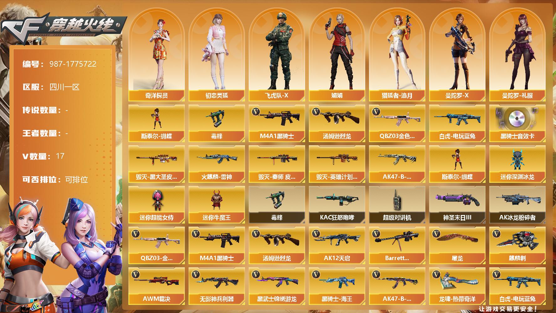 [14631070]17V/100级/元帅/QBZ03-金色蔷薇/白虎-电玩蓝兔/毒蜂/M4A1-黑骑士/汤姆逊-烈龙/斯泰尔蝴蝶/M4A1-黑骑士音效卡/火麒麟-雷神/毁灭-黑大圣皮肤/毁灭-秦师 皮肤/毁灭-英雄计划 皮肤/AK47-B-常胜将军-刘备/奇洋探员/初恋灵狐/飞虎队-X/娟娟/猎狐者-追月/曼陀罗-X/曼陀罗-礼服/潘多拉-X/潘多拉-甜心教官/斯沃特-X/兔囡囡/影武者-X/游珑儿/迷你深渊冰龙/迷你牛魔王/迷你超能女侍/KAC-狂怒咆哮/超级对讲机/AK47-冰龙粉碎者/神圣爆裂者-末日/AK12-天启/无影-神兵利器/AK47-黑武士-锦绣游龙/AK47-B-战神/黑骑士-海王/Barrett-毁灭/AWM-裁决/屠龙/麒麟刺/龙啸-热带奇洋/手雷-热带奇洋/奇洋探员-海龟背包/灵魂忍者/变异宝贝/迷雾幽灵/夺命之镰/防化服/金色流光-枪王排位/星辰流光-枪王排位/枪王排位28赛季金色流光/电玩兔兔表情/防弹头盔/防弹衣/C4工具钳/手雷包