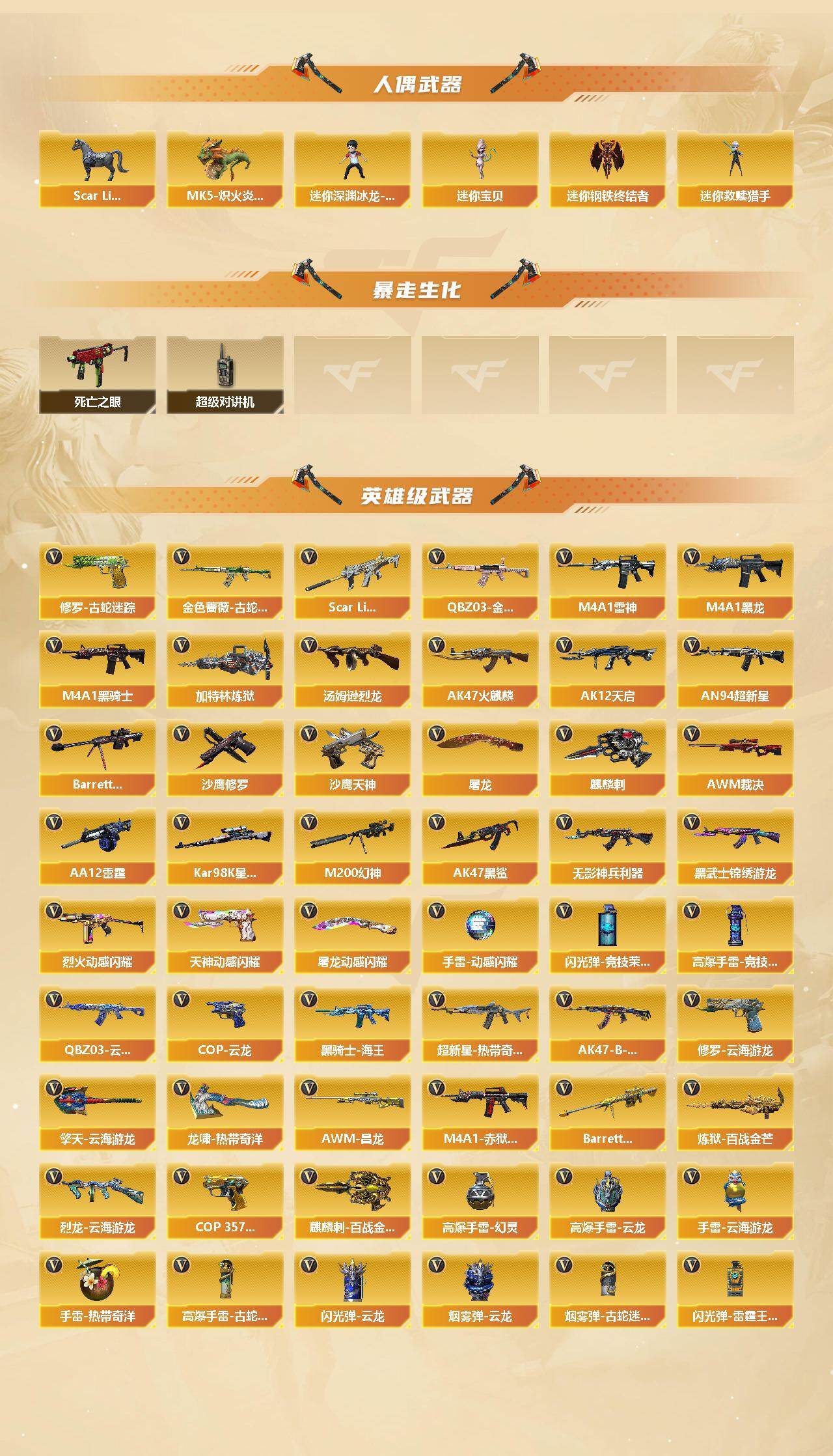【英雄级武器】:AK47-火麒麟,M4A1-黑龙,M4A1-雷神,M4A1-黑骑士,AK12-天启,AN94-超新星*2,AK47-黑鲨,Scar Light-白虎,无影-神兵利器,QBZ03-云龙,黑武士-锦绣游龙,超新星-热带