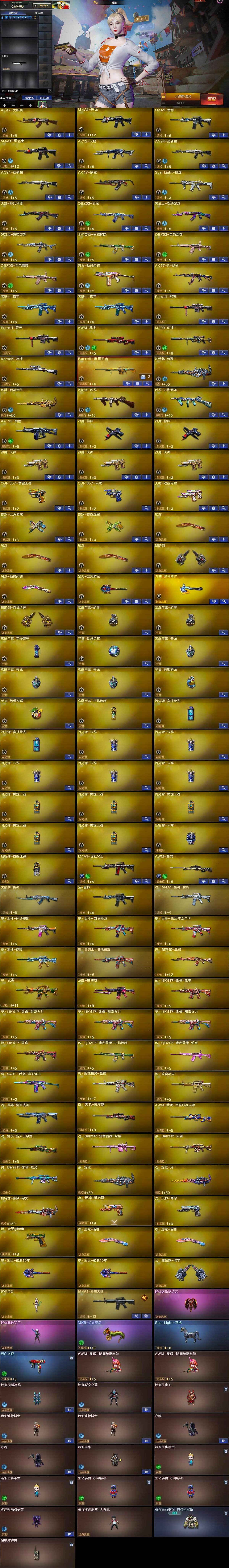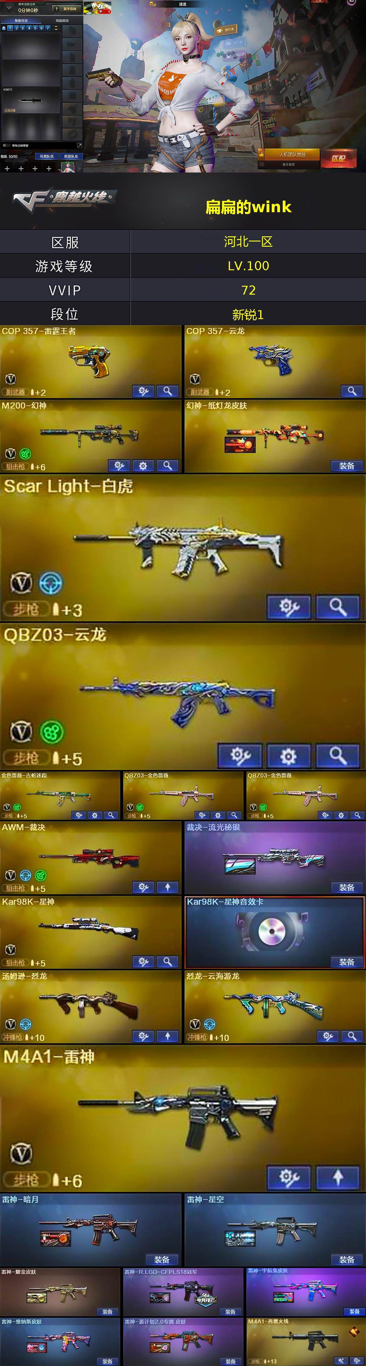 【热门武器】:QBZ03-金色蔷薇*2,Scar Light-白虎,M200-幻神,金色蔷薇-古蛇迷踪,修罗-古蛇迷踪,死亡之眼,Kar98K-星神,M4A1-黑骑士,汤姆逊-烈龙,加特林-炼狱,MK5-炽火炎龙,沙鹰-修罗*2
