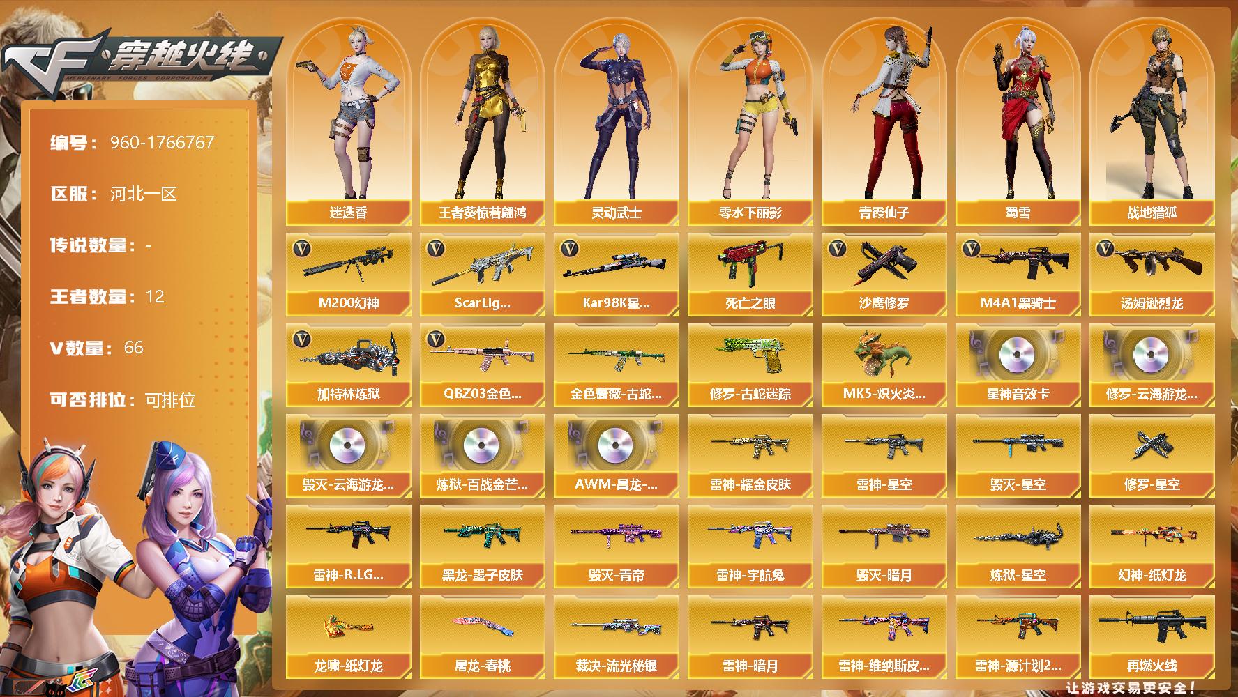 [14631732]63V/100级/元帅/12王者/3英雄/QBZ03-金色蔷薇/Scar Light-白虎/M200-幻神/金色蔷薇-古蛇迷踪/修罗-古蛇迷踪/死亡之眼/Kar98k-星神/M4A1-黑骑士/汤姆逊-烈龙/加特林-炼狱/MK5-炽火炎龙/沙鹰-修罗/修罗-云海游龙音效卡/Barrett-毁灭-云海游龙音效卡/星神音效卡/炼狱-百战金芒-庆典舞曲音效卡/AWM-昌龙-怀旧音效卡/幻神-纸灯龙皮肤/裁决-流光秘银/雷神-暗月/雷神-星空/雷神-耀金皮肤/雷神-R.LGD-CFPLS18冠军/雷神-宇航兔/雷神-维纳斯皮肤/雷神-源计划2.0专属 皮肤/M4A1-再燃火线/火麒麟-雷神/毁灭-暗月/毁灭-星空/毁灭-青帝/毁灭-百城浙江 皮肤/毁灭-秦师 皮肤/毁灭-英雄计划 皮肤/M4A1-千变-孔明皮肤/黑龙-墨子皮肤/黑骑士-破界 皮肤/黑武士-典韦皮肤/战神-粉色甜心皮肤/战神-流金岁月皮肤/炼狱-星空/炼狱-玩具枪皮肤/修罗-星空/屠龙-星耀 皮肤/屠龙-春桃/屠龙-破浪逐光 皮肤/龙啸-纸灯龙皮肤/龙啸-蛇姬 皮肤/轻型军用手斧-再燃火线/麒麟刺-月皮肤/迷迭香/战地猎狐/王者葵-惊若翩鸿/蛇隐宗/奇洋探员/乔伊教练/云海玲珑/暗夜-X/电竞少女/芳心审判者/飞虎队-X/虎妞/嘉年华灵狐/娟娟/兰-海滩派对/猎狐者-追月/0号玩家/灵动武士/零-水下丽影/灵狐者-X/灵狐者-黄金海岸/麻雀/曼陀罗-X/娜塔莉娅/潘多拉-X/邱刚敖/青霞仙子/蛇姬/斯沃特-X/蜀雪/夜玫瑰-宠粉/樱-战斗天使/游珑儿/迷你宝贝/迷你钢铁终结者/迷你救赎猎手/Scar Light-马枪/AWM-灵狐-15周年嘉年华/迷你深渊冰龙/迷你裂空之翼/迷你牛魔王/迷你波特博士/夺魂/迷你牛牛/迷你生化手雷/生化手雷-机甲核心/深渊终结者手雷/迷你深渊冰龙-王绿豆/迷你巨石泰坦-魔花研究所/灵狐娃娃手雷/超级对讲机/AK47-火麒麟/M4A1-黑龙/M4A1-雷神/AK12-天启/AN94-超新星/AK47-黑鲨/无影-神兵利器/QBZ03-云龙/AK47-黑武士-锦绣游龙/超新星-热带奇洋/烈火-动感闪耀/AK47-B-战神/黑骑士-海王/Barrett-毁灭/AWM-裁决/Barrett-雷霆王者-觉醒版/炼狱-百战金芒/烈龙-云海游龙/AA-12-雷霆/沙鹰-天神/COP 357-