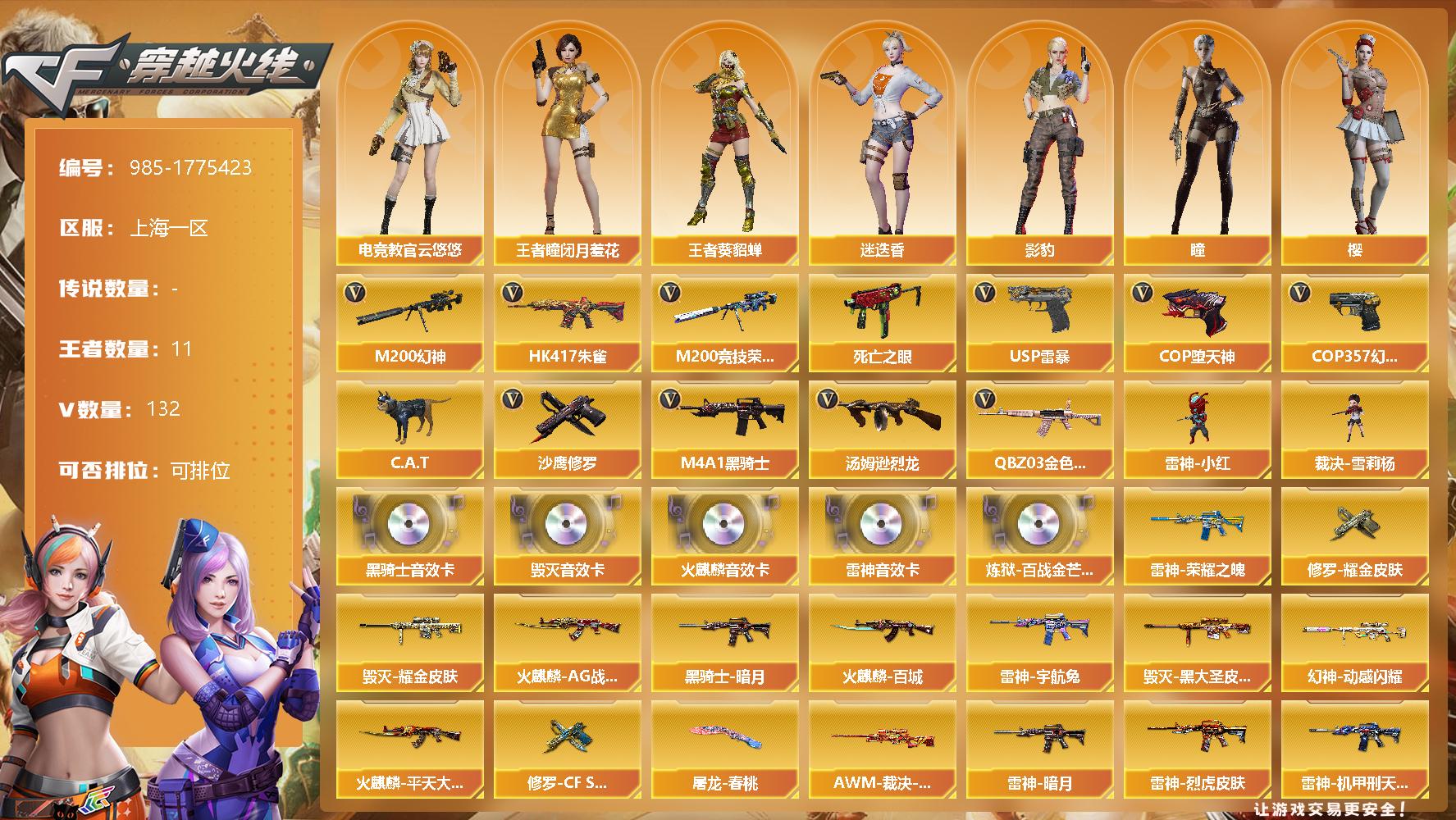 [14631934]121V/102级/荣耀元首/11王者/11英雄/QBZ03-金色蔷薇/HK417-朱雀/M200-幻神/M200-竞技荣光/死亡之眼/C.A.T/M4A1-黑骑士/汤姆逊-烈龙/雷神-小红/裁决-雪莉杨/USP雷暴/COP-堕天神/COP 357-幻灵/沙鹰-修罗/AK47-火麒麟音效卡/M4A1-雷神音效卡/M4A1-黑骑士音效卡/Barrett-毁灭音效卡/炼狱-百战金芒-庆典舞曲音效卡/幻神动感闪耀/幻神-电竞之星 皮肤/AWM-裁决-凤灵皮肤/裁决-胜者为王 皮肤/雷神-暗月/雷神荣耀之魄/雷神-烈虎皮肤/雷神-机甲刑天皮肤/雷神-宇航兔/雷神-源计划2.0专属 皮肤/M4A1-再燃火线/火麒麟-AG战队皮肤/火麒麟-平天大圣/火麒麟-百城/毁灭耀金皮肤/毁灭-黑大圣皮肤/M4A1-千变-孔明皮肤/黑龙-能量核心/黑龙-暗月/黑骑士-暗月/战神-粉色甜心皮肤/战神-紫绶金章皮肤/战神-流金岁月皮肤/AK47-B-常胜将军-曹操/AK47-B-常胜将军-孙权/极光-能量核心/炼狱-玩具枪皮肤/沙鹰-修罗-CF STAR/修罗-能量核心/修罗耀金皮肤/屠龙-春桃/屠龙-巅峰荣耀 皮肤/轻型军用手斧-再燃火线/龙啸-青青莓果 皮肤/麒麟刺-萌杀皮肤/零/葵/樱/瞳/迷迭香/凌霄/影豹/电竞教官-云悠悠/审判者/王者-瞳-闭月羞花/王者-葵-貂蝉/修道士/北极狐-X/电竞少女/芳心审判者/飞虎队-X/风暴女/虎妞/娟娟/兰-新年限定/猎狐者-追月/0号玩家/零-水下丽影/灵狐-花神/灵狐者-X/灵狐者-黄金海岸/灵狐者-七夕宝贝/龙儿/龙儿-小淘气/麻雀/曼陀罗-X/曼陀罗-礼服/萌儿/潘多拉-X/潘多拉-甜心教官/潜龙队-X/邱刚敖/青霞仙子/蜀雪/铁骑荣耀/兔囡囡/新娜塔莎/雪莉杨/雪莉杨-摸金校尉/夜玫瑰-幻能朋克/夜玫瑰-宠粉/樱-战斗天使/影武者-X/游珑儿/巴雷特-零-水下丽影/海滩汪汪-巴雷特/M37-葵/迷你深渊冰龙/迷你牛魔王/生化手雷-机甲核心/深渊终结者手雷/闪光弹-小乔/闪光弹-貂蝉/高爆手雷-大乔/迷你艾比/超级对讲机/神圣爆裂者/AK47-冰龙粉碎者/冰龙粉碎者-白马银枪/激光毁灭者III-白马银枪/激光毁灭者/机甲撕裂者/试炼破坏者/KAC-圣炎切割者/神圣爆裂者-末日/阐释者/AK47-火麒麟/M4A1-黑龙/M4A1-雷神/AK