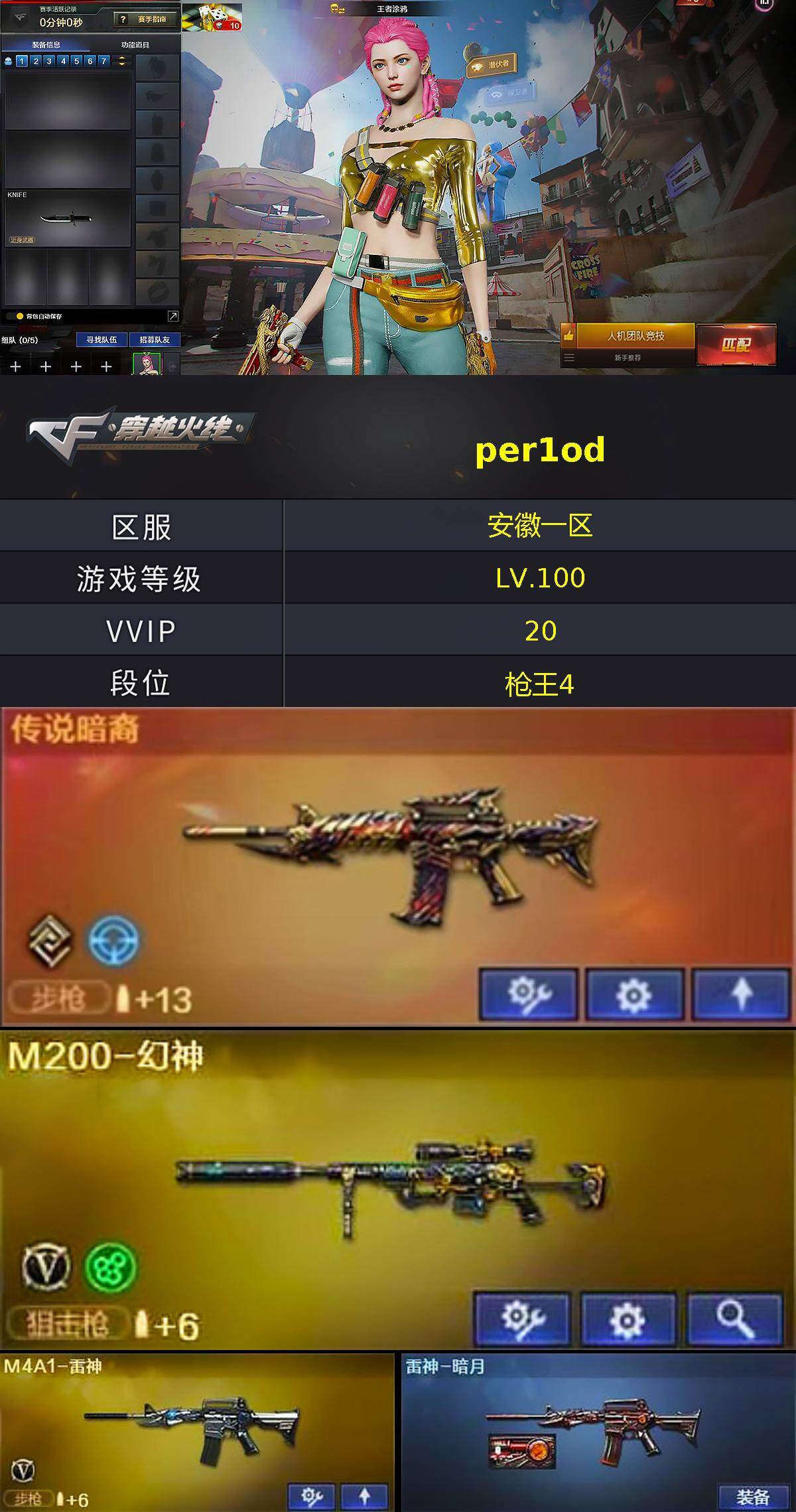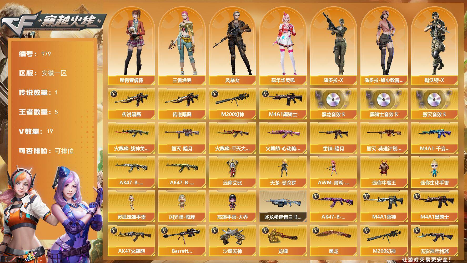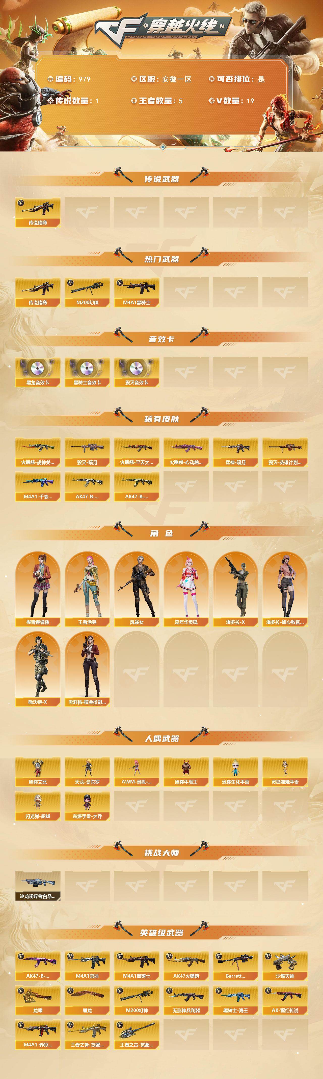 [14632100]安徽一区-19V-5王者-0炫金 【传说武器】:传说暗裔 【热门武器】:传说暗裔,M200-幻神,M4A1-黑骑士 【音效卡】:M4A1-黑龙音效卡,M4A1-黑骑士音效卡,Barrett-毁灭音效卡 【皮肤】:雷神-暗月,火麒麟-战神关羽,火麒麟-平天大圣,火麒麟-心动糖果,毁灭-暗月,毁灭-英雄计划 皮肤,M4A1-千变-孔明皮肤,AK47-B-常胜将军-刘备,AK47-B-常胜将军-孙权*2 【角色】:王者涂鸦,风暴女,嘉年华灵狐,潘多拉-X,潘多拉-甜心教官,斯沃特-X,雪莉杨-摸金校尉,樱-青春偶像 【人偶武器】:天龙-曼陀罗,AWM-灵狐-15周年嘉年华,迷你牛魔王,迷你生化手雷,闪光弹-貂蝉,高爆手雷-大乔,迷你艾比,灵狐娃娃手雷 【挑战大师】:冰龙粉碎者-白马银枪 【英雄级武器】:AK47-火麒麟*2,M4A1-雷神,M4A1-黑骑士,无影-神兵利器,王者之势-觉醒版,AK-47-猩红传说,黑骑士-海王,AK47-B-常胜将军,Barrett-毁灭,M200-幻神,沙鹰-天神,屠龙,龙啸,王者之击-觉醒版*2,M4A1-赤狱骑士 【道具】:云山科技背包,超级背包,女皇终结者-魔龙之吻,救世主-黑桃战神,绿色巨人,灵魂忍者,变异宝贝,迷雾幽灵,生化弹匣,夺命之镰,防化服*3,金色流光-枪王排位*2,星辰流光-枪王排位,流光-再燃火线,枪王排位28赛季金色流光,枪王排位29赛季金色流光,EP战队名片,防弹头盔*5,防弹衣*5,C4工具钳*5,手雷包*5 【特殊枪械】:1黑骑士