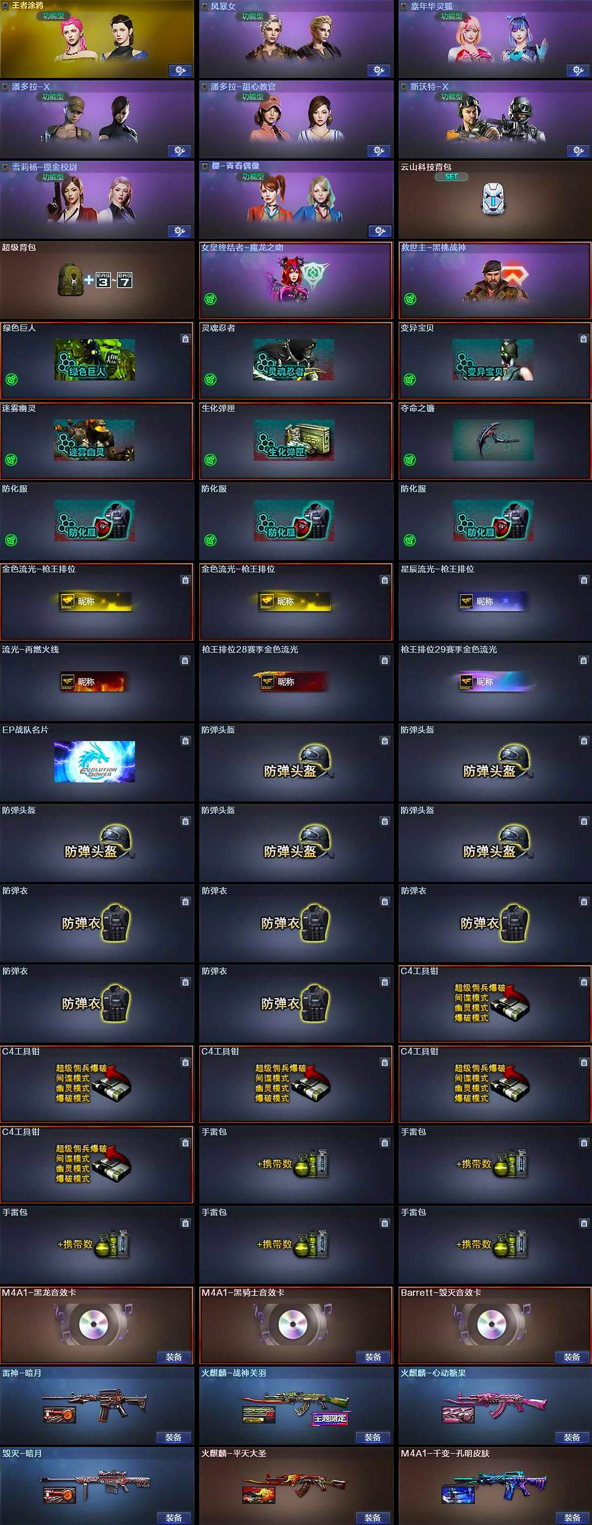 【道具】:云山科技背包,超级背包,女皇终结者-魔龙之吻,救世主-黑桃战神,绿色巨人,灵魂忍者,变异宝贝,迷雾幽灵,生化弹匣,夺命之镰,防化服*3,金色流光-枪王排位*2,星辰流光-枪王排位,流光-再燃火线,枪王排位28赛季金色流光,枪王排位29赛季金色流光,EP战队名片,防弹头盔*5,防弹衣*5,C4工具钳*5,手雷包*5