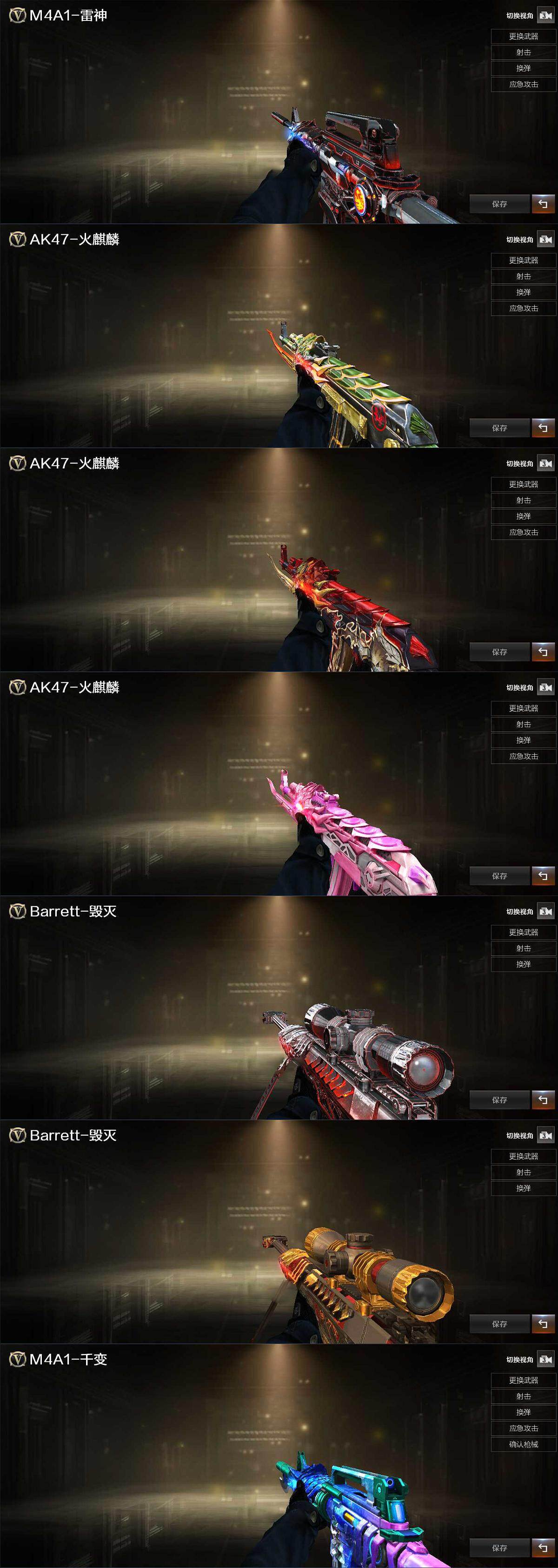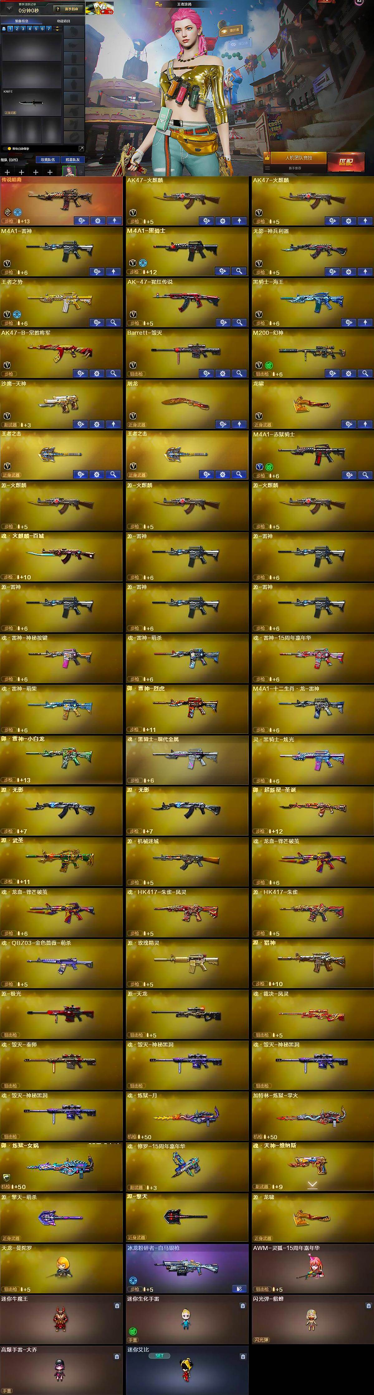 【英雄级武器】:AK47-火麒麟*2,M4A1-雷神,M4A1-黑骑士,无影-神兵利器,王者之势-觉醒版,AK-47-猩红传说,黑骑士-海王,AK47-B-常胜将军,Barrett-毁灭,M200-幻神,沙鹰-天神,屠龙,龙啸,王者之击-觉醒版*2,M4A1-赤狱骑士