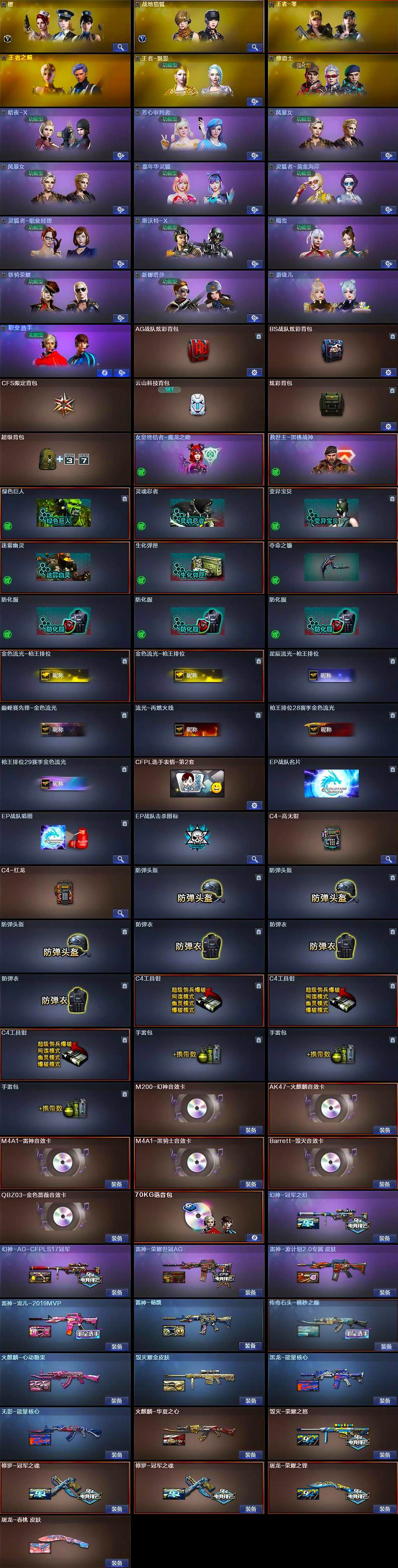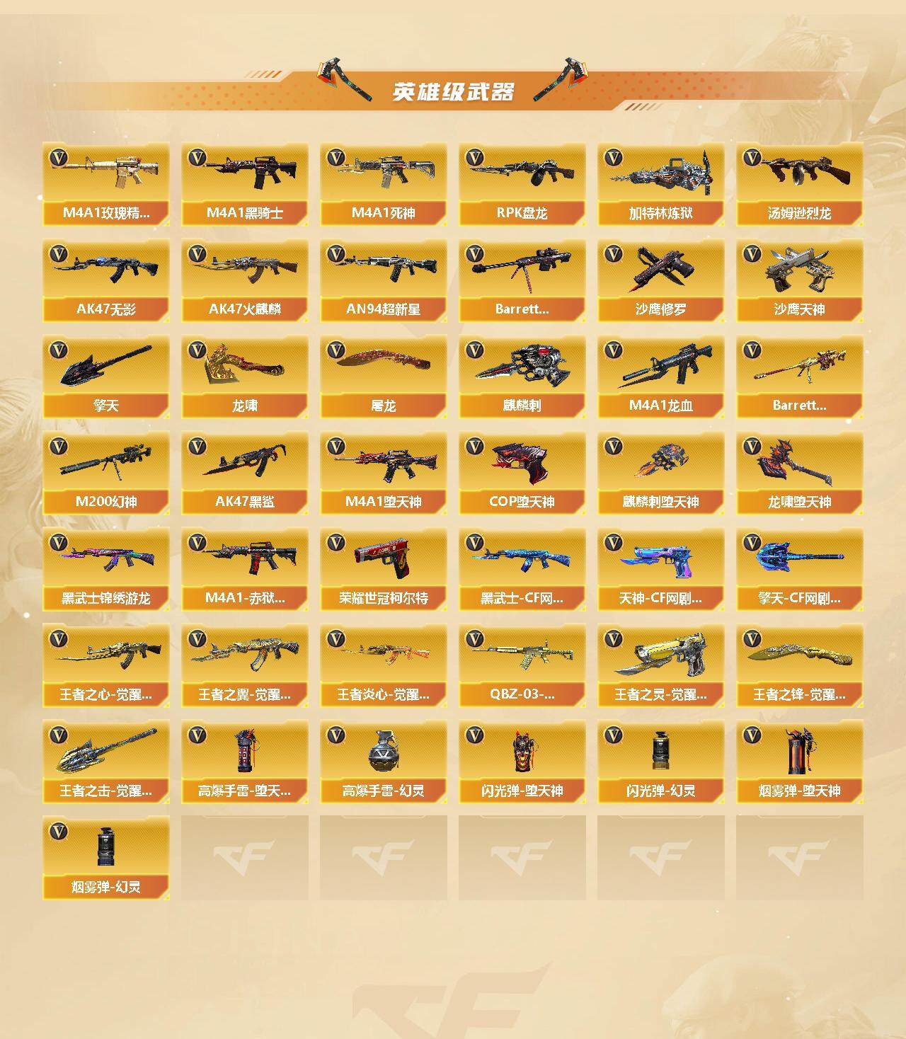 【英雄级武器】:AK47-火麒麟*2,M4A1-雷神,M4A1-黑骑士,AK47-无影,M4A1-死神,AN94-超新星,AK47-黑鲨,M4A1-龙血,M4A1-青龙,M4A1-堕天神,Scar Light-白虎,黑武士-锦绣游龙,M4A1-玫瑰精灵,QBZ03-金色蔷薇,王者之心-觉醒版,王者之翼-觉醒版,王者炎心-觉醒版,AK47-B-常胜将军,QBZ-03-王者蔷薇-觉醒版,黑武士-CF网剧冠军,Barrett-毁灭*3,M200-幻神,Barrett-朱雀,Barrett-金色蔷薇*2,RPK-盘龙*6,加特林-炼狱*3,汤姆逊-烈龙*6,沙鹰-修罗*2,沙鹰-天神*3,COP-堕天神,荣