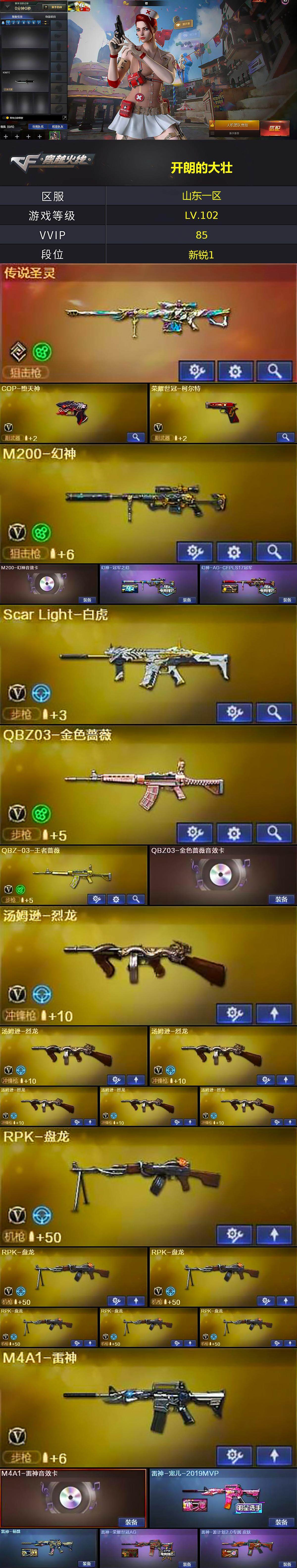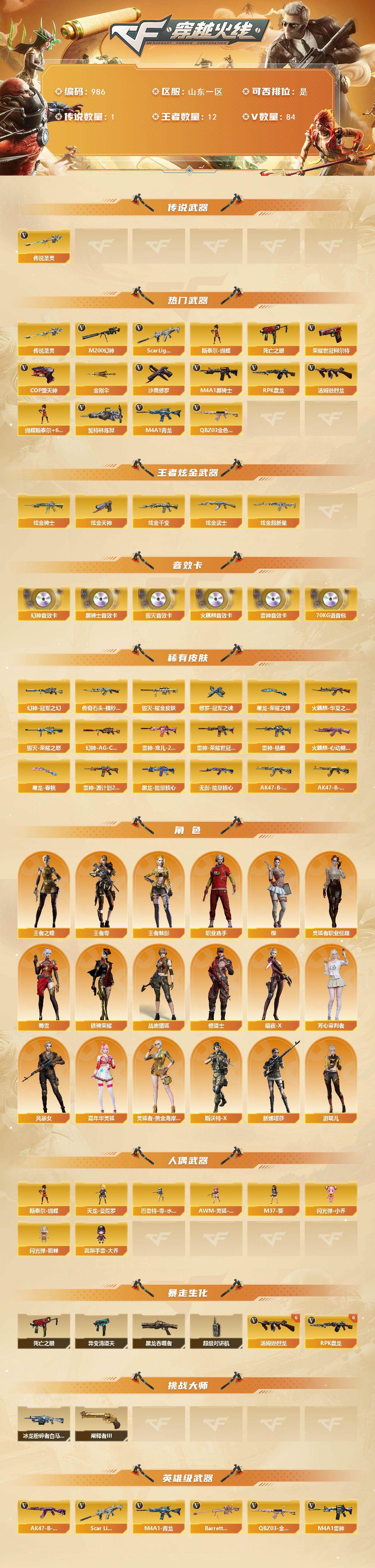 [14635082]山东一区-84V-12王者-5炫金 【传说武器】:传说圣灵 【热门武器】:传说圣灵,QBZ03-金色蔷薇,Scar Light-白虎,M4A1-青龙,M200-幻神,死亡之眼*2,荣耀世冠-柯尔特,M4A1-黑骑士,汤姆逊-烈龙*6,RPK-盘龙*6,加特林-炼狱*3,斯泰尔-蝴蝶,COP-堕天神,沙鹰-修罗*2,金刚伞 【王者炫金武器】:炫金骑士,炫金千变,炫金武士,炫金超新星,炫金天神 【音效卡】:M200-幻神音效卡,AK47-火麒麟音效卡,M4A1-雷神音效卡,M4A1-黑骑士音效卡,Barrett-毁灭音效卡,70KG语音包 【皮肤】:幻神-冠军之幻,幻神-AG-CFPLS17冠军,雷神-宠儿-2019MVP,雷神-杨戬,雷神-荣耀世冠AG,雷神-源计划2.0专属 皮肤,火麒麟-华夏之心,传奇石头-横秒之巅,火麒麟-心动糖果,毁灭-荣耀之怒,毁灭耀金皮肤,黑龙-能量核心,无影-能量核心,AK47-B-常胜将军-刘备,AK47-B-常胜将军-孙权,修罗-冠军之魂*2,屠龙-荣耀之锋,屠龙-春桃 皮肤 【角色】:樱,战地猎狐,王者-零,王者之瞳,王者-魅影,修道士,暗夜-X,芳心审判者,风暴女*2,嘉年华灵狐,灵狐者-黄金海岸,灵狐者-职业经理,斯沃特-X,蜀雪,铁骑荣耀,新娜塔莎,游珑儿,职业选手 【人偶武器】:天龙-曼陀罗,斯泰尔-蝴蝶,巴雷特-零-水下丽影,AWM-灵狐-15周年嘉年华,M37-葵,闪光弹-小乔,闪光弹-貂蝉,高爆手雷-大乔 【暴走生化】:异变清道夫,黑龙吞噬者,死亡之眼*2,超级对讲机 【挑战大师】:冰龙粉碎者-白马银枪*2,阐释者III 【英雄级武器】:AK47-火麒麟*2,M4A1-雷神,M4A1-黑骑士,AK47-无影,M4A1-死神,AN94-超新星,AK47-黑鲨,M4A1-龙血,M4A1-青龙,M4A1-堕天神,Scar Light-白虎,黑武士-锦绣游龙,M4A1-玫瑰精灵,QBZ03-金色蔷薇,王者之心-觉醒版,王者之翼-觉醒版,王者炎心-觉醒版,AK47-B-常胜将军,QBZ-03-王者蔷薇-觉醒版,黑武士-CF网剧冠军,Barrett-毁灭*3,M200-幻神,Barrett-朱雀,Barrett-金色蔷薇*2,RPK-盘龙*6,加特林-炼狱*3,汤姆逊-烈龙*6,沙鹰-修罗*2,沙鹰-天神*3,COP-堕天神,荣