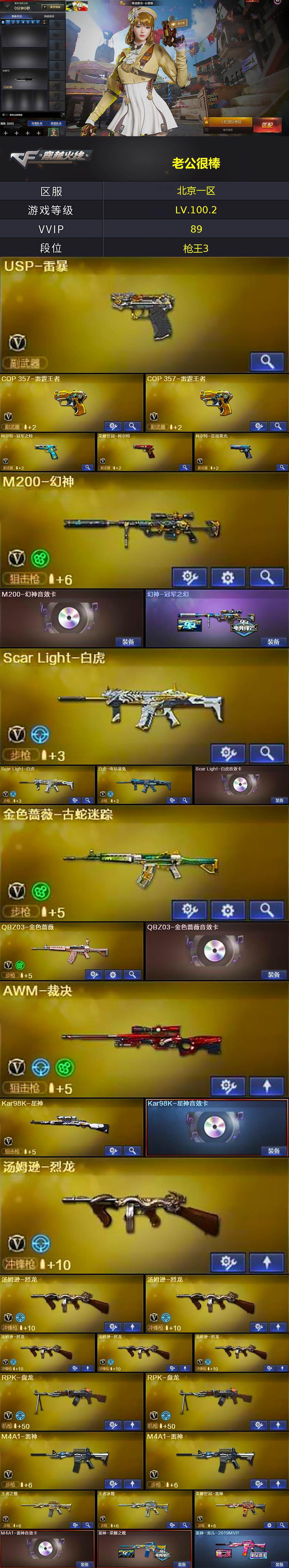 - [14666659]34V/102级/荣耀元首/3王者/4英雄/QBZ03-金色蔷薇/M14EBR-玄武/M200-幻神/金色蔷薇-古蛇迷踪/修罗-古蛇迷踪/白虎-电玩蓝兔/Kar98k-星神/金色小号/COP 357-幻灵/M200-幻神音效卡/炼狱-百战金芒-庆典舞曲音效卡/幻神-Heartshot/幻神-电竞之星 皮肤/金色蔷薇-Heartshot/雷神-暗月/雷神-宇航兔/M4A1-再燃火线/雷神-神秘按键 皮肤/火麒麟-白虎/轻型军用手斧-再燃火线/电竞教官-云悠悠/战地猎狐/王者樱-热浪之夏/蛇隐宗/奇洋探员/云海玲珑/暗夜-X/电竞少女/芳心审判者/飞虎队-X/0号玩家/灵狐者-X/灵狐者-黄金海岸/麻雀/曼陀罗-礼服/娜塔莉娅/潘多拉-X/潘多拉-甜心教官/潜龙队-X/蛇姬/铁骑荣耀/维纳斯/新娜塔莎/雪莉杨-摸金校尉/夜玫瑰-宠粉/樱-战斗天使/游珑儿/AWM-灵狐-15周年嘉年华/夺魂/迷你牛牛/生化手雷-机甲核心/迷你艾比/灵狐娃娃手雷/超级对讲机/激光毁灭者III-白马银枪/试炼破坏者/神圣爆裂者-末日/AK47-火麒麟/M4A1-雷神/无影-神兵利器/AK47-黑武士-锦绣游龙/超新星-热带奇洋/王者风神-觉醒版/炼狱-百战金芒/炼狱-悦蓝-觉醒版/AA-12-雷霆/沙鹰-天神/幻灵之锋/龙啸-热带奇洋/麒麟刺-百战金芒/高爆手雷-幻灵/手雷-云海游龙/手雷-热带奇洋/高爆手雷-古蛇迷踪/闪光弹-幻灵/闪光弹-云龙/烟雾弹-幻灵/烟雾弹-古蛇迷踪/M4A1-赤狱骑士/AWM-昌龙/CFS限定背包/云山科技背包/亚洲杯纪念炫彩背包/古蛇迷踪炫彩背包/奇洋探员-海龟背包/女皇终结者-背包/热带奇洋炫彩背包/百战金芒炫彩背包/背包-洛丽塔/超级背包/女皇终结者-魔龙之吻/救世主-黑桃战神/黄金生化钩/绿色巨人/灵魂忍者/变异宝贝/迷雾幽灵/生化弹匣/夺命之镰/防化服/金色流光-枪王排位/星辰流光-枪王排位/流光-鎏金之域/流光-再燃火线/枪王排位28赛季金色流光/语音特效-盛典烟火/古蛇迷踪打击特效/蛇隐宗表情/萌萌小葵表情/热带奇洋表情/EP战队名片/EP战队喷图/防弹头盔/防弹衣/C4工具钳/手雷包