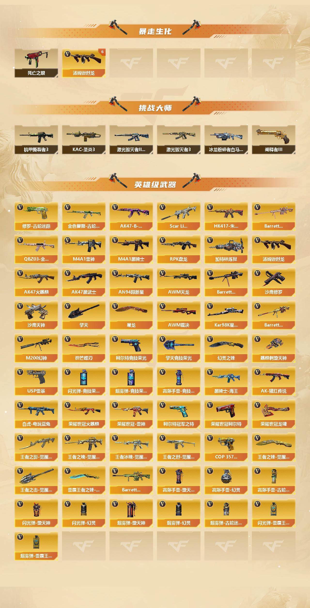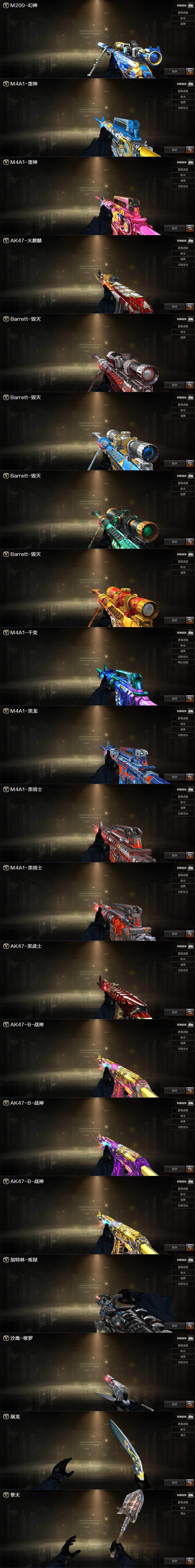 【英雄级武器】:AK47-火麒麟,M4A1-雷神*2,M4A1-黑骑士*2,AK47-黑武士,AN94-超新星,HK417-朱雀,Scar Light-白虎*2,金色蔷薇-古蛇迷踪,QBZ