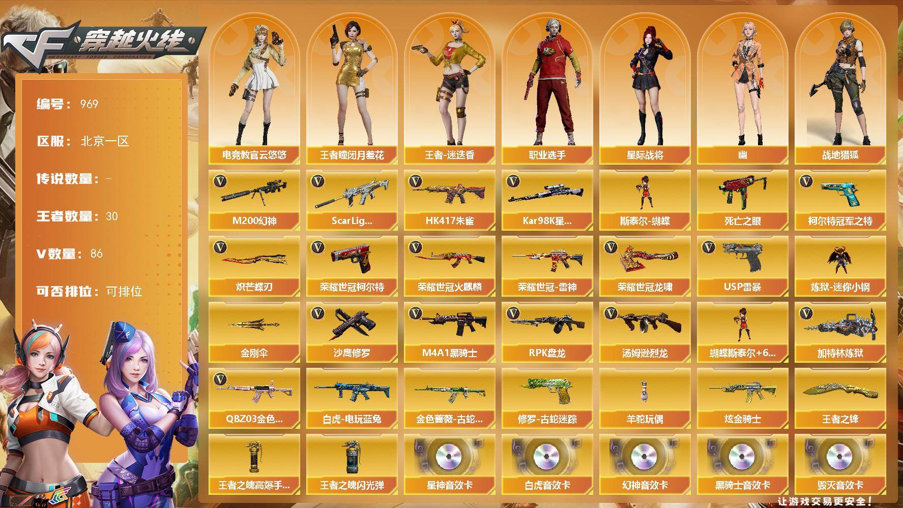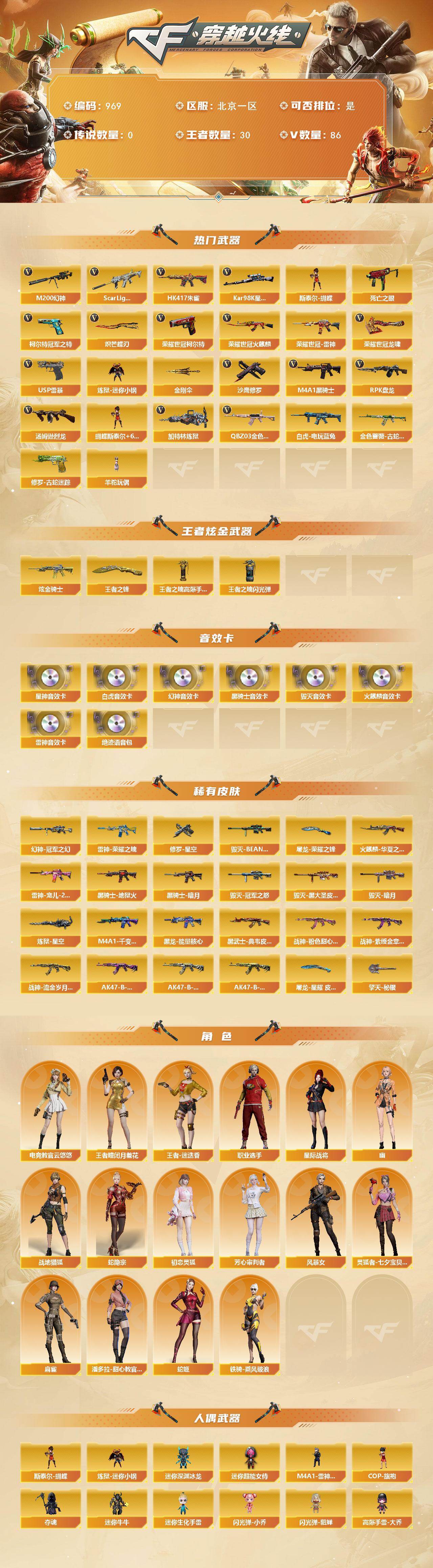[14635244]北京一区-86V-30王者-2炫金 【热门武器】:QBZ03-金色蔷薇,Scar Light-白虎*2,HK417-朱雀,M200-幻神,金色蔷薇-古蛇迷踪,修罗-古蛇迷踪,死亡之眼,荣耀世冠-火麒麟,荣耀世冠-雷神,白虎-电玩蓝兔,柯尔特-冠军之特,荣耀世冠-柯尔特,Kar98K-星神,炼狱-迷你小钢,M4A1-黑骑士*2,汤姆逊-烈龙*6,RPK-盘龙*2,加特林-炼狱*2,斯泰尔-蝴蝶,羊驼玩偶*2,USP-雷暴,沙鹰-修罗*3,炽芒蝶刃*2,荣耀世冠-龙啸,金刚伞 【王者炫金武器】:王者之锋,炫金骑士*2,王者之魄高爆手雷*2,王者之魄闪光弹*2 【音效卡】:M200-幻神音效卡,AK47-火麒麟音效卡,M4A1-雷神音效卡,M4A1-黑骑士音效卡,Barrett-毁灭音效卡,Scar Light-白虎音效卡,绝迹语音包,Kar98K-星神音效卡 【皮肤】:幻神-冠军之幻,雷神-荣耀之魄,雷神-宠儿-2019MVP,火麒麟-华夏之心,毁灭-暗月,毁灭-冠军之怒,毁灭-BEAN-2020MVP,毁灭-黑大圣皮肤,M4A1-千变-孔明皮肤,黑龙-能量核心,黑骑士-暗月,黑骑士-地狱火,黑武士-典韦皮肤,战神-粉色甜心皮肤*3,战神-紫绶金章皮肤*2,战神-流金岁月皮肤,AK47-B-常胜将军-曹操,AK47-B-常胜将军-刘备*2,AK47-B-常胜将军-孙权,炼狱-星空,修罗-星空,屠龙-荣耀之锋,屠龙-星耀 皮肤,擎天-秘银 【角色】:电竞教官-云悠悠,星际战将,战地猎狐,王者-瞳-闭月羞花,王者-迷迭香,蛇隐宗,初恋灵狐,芳心审判者,风暴女,灵狐者-七夕宝贝,麻雀,潘多拉-甜心教官,蛇姬,铁骑-乘风破浪,幽,职业选手 【人偶武器】:M4A1-雷神-精英刀锋,炼狱-迷你小钢,斯泰尔-蝴蝶,COP-旗袍,迷你深渊冰龙*5,夺魂,迷你牛牛,迷你生化手雷,闪光弹-小乔,闪光弹-貂蝉,高爆手雷-大乔,迷你超能女侍 【暴走生化】:死亡之眼 【挑战大师】:冰龙粉碎者-白马银枪*2,激光毁灭者III-白马银枪,激光毁灭者III,机甲撕裂者III,KAC-圣炎切割者III,阐释者III 【英雄级武器】:AK47-火麒麟,M4A1-雷神*2,M4A1-黑骑士*2,AK47-黑武士,AN94-超新星,HK417-朱雀,Scar Light-白虎*2,金色蔷薇-古蛇迷踪,QBZ