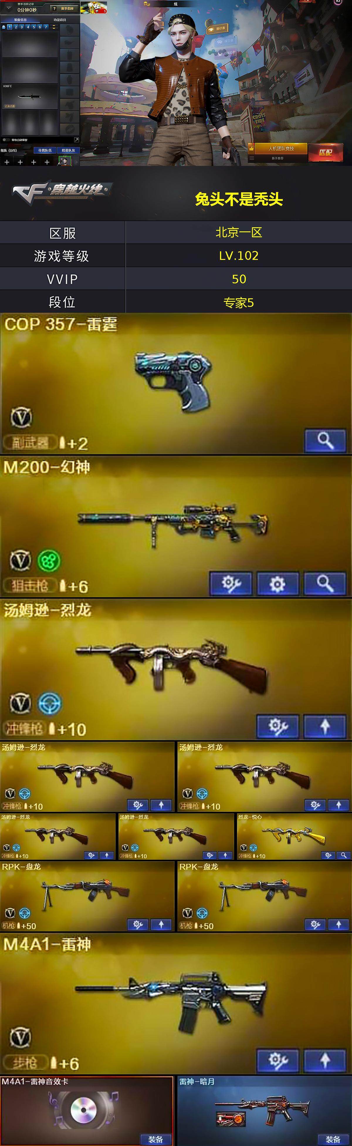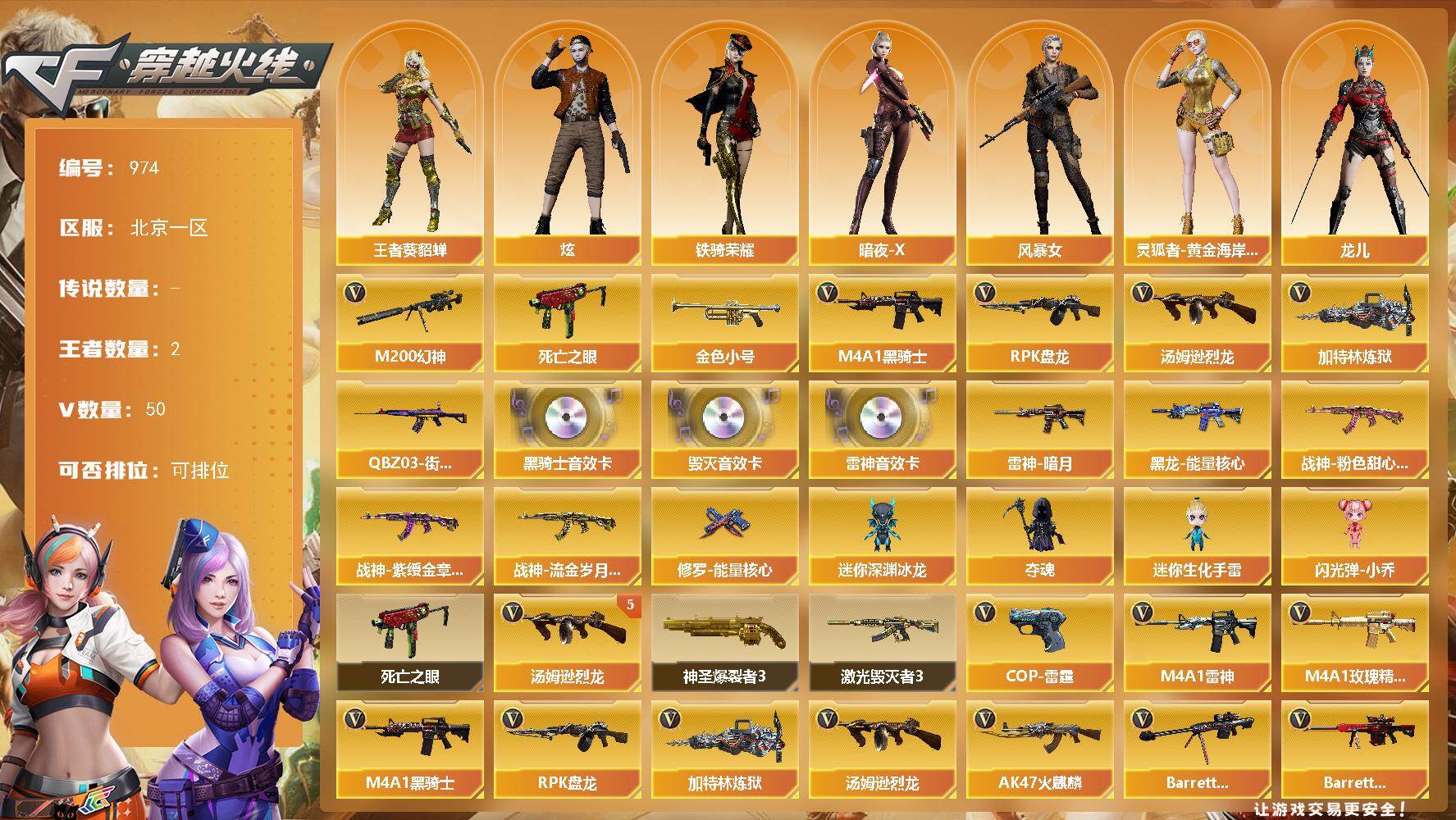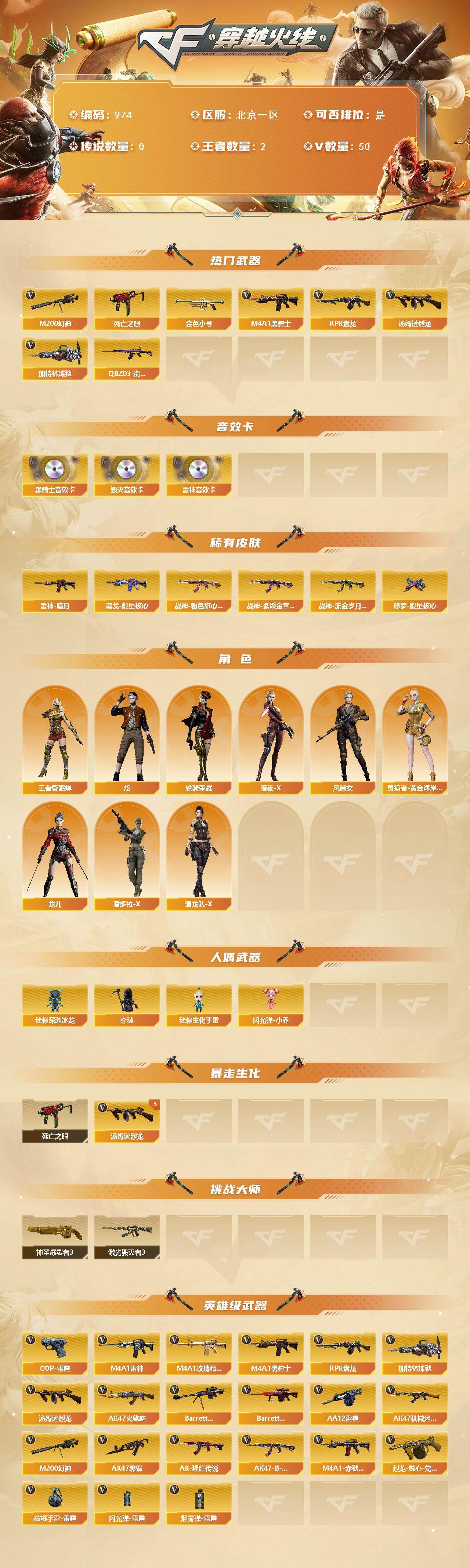 [14635434]北京一区-50V-2王者-0炫金 【热门武器】:M200-幻神,死亡之眼,QBZ03-街机,金色小号,M4A1-黑骑士,汤姆逊-烈龙*5,RPK-盘龙*2,加特林-炼狱*2 【音效卡】:M4A1-雷神音效卡,M4A1-黑骑士音效卡,Barrett-毁灭音效卡 【皮肤】:雷神-暗月,黑龙-能量核心,战神-粉色甜心皮肤*3,战神-紫绶金章皮肤*5,战神-流金岁月皮肤*6,修罗-能量核心 【角色】:炫,王者-葵-貂蝉,暗夜-X,风暴女,灵狐者-黄金海岸,龙儿,潘多拉-X,潜龙队-X,铁骑荣耀 【人偶武器】:迷你深渊冰龙,夺魂,迷你生化手雷,闪光弹-小乔 【暴走生化】:死亡之眼 【挑战大师】:神圣爆裂者III,激光毁灭者III 【英雄级武器】:AK47-火麒麟,M4A1-雷神,M4A1-黑骑士,AK47-机械迷城,AK47-黑鲨,M4A1-玫瑰精灵,AK-47-猩红传说*11,AK47-B-战神,Barrett-毁灭,Barrett-极光,M200-幻神,RPK-盘龙*2,加特林-炼狱*2,汤姆逊-烈龙*5,烈龙-悦心-觉醒版,AA-12-雷霆,COP-雷霆,高爆手雷-雷霆*5,闪光弹-雷霆*5,烟雾弹-雷霆*5,M4A1-赤狱骑士 【道具】:炫彩背包,超级背包,救世主-黑桃战神,绿色巨人,灵魂忍者,变异宝贝,迷雾幽灵,夺命之镰,防化服*2,流光-再燃火线,枪王排位29赛季金色流光,防弹头盔*4,防弹衣*3,C4工具钳*3,手雷包*3 【特殊枪械】:1黑骑士,5烈龙,2盘龙,2炼狱