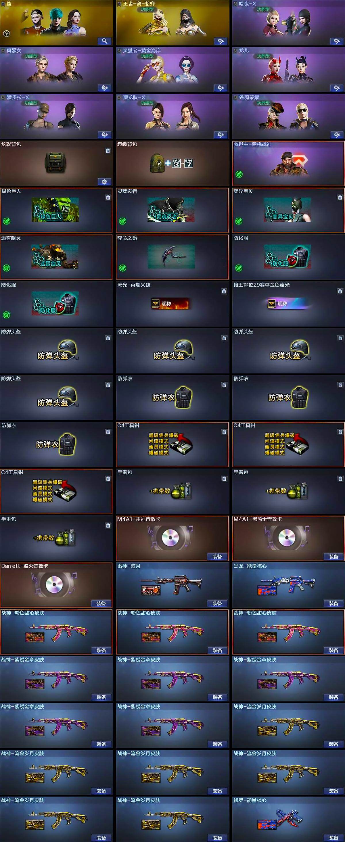 【道具】:炫彩背包,超级背包,救世主-黑桃战神,绿色巨人,灵魂忍者,变异宝贝,迷雾幽灵,夺命之镰,防化服*2,流光-再燃火线,枪王排位29赛季金色流光,防弹头盔*4,防弹衣*3,C4工具钳*3,手雷包*3