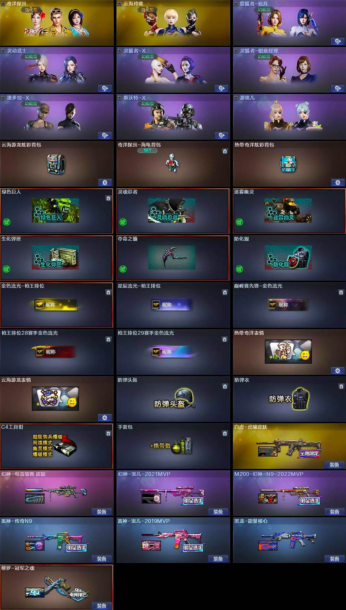 【道具】:云海游龙炫彩背包,奇洋探员-海龟背包,热带奇洋炫彩背包,绿色巨人,灵魂忍者,迷雾幽灵,生化弹匣,夺命之镰,防化服,金色流光-枪王排位,星辰流光-枪王排位,巅峰赛先锋-金色流光,枪王排位28赛季金色流光,枪王排位29赛季金色流光,热带奇洋表情,云海游龙表情,防弹头盔,防弹衣,C4工具钳,手雷包