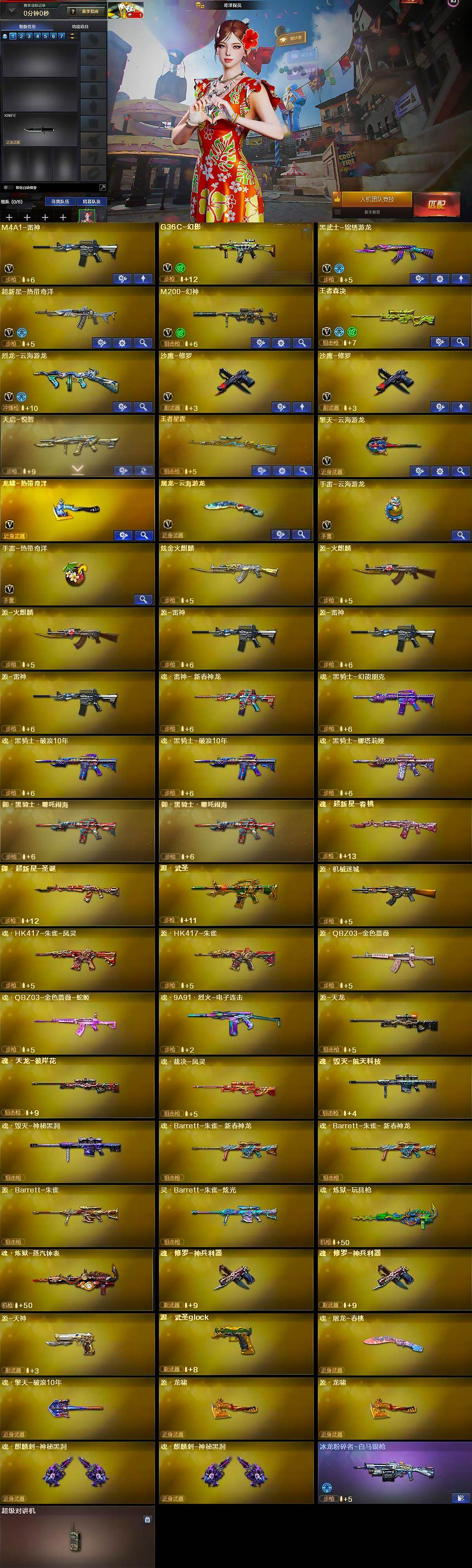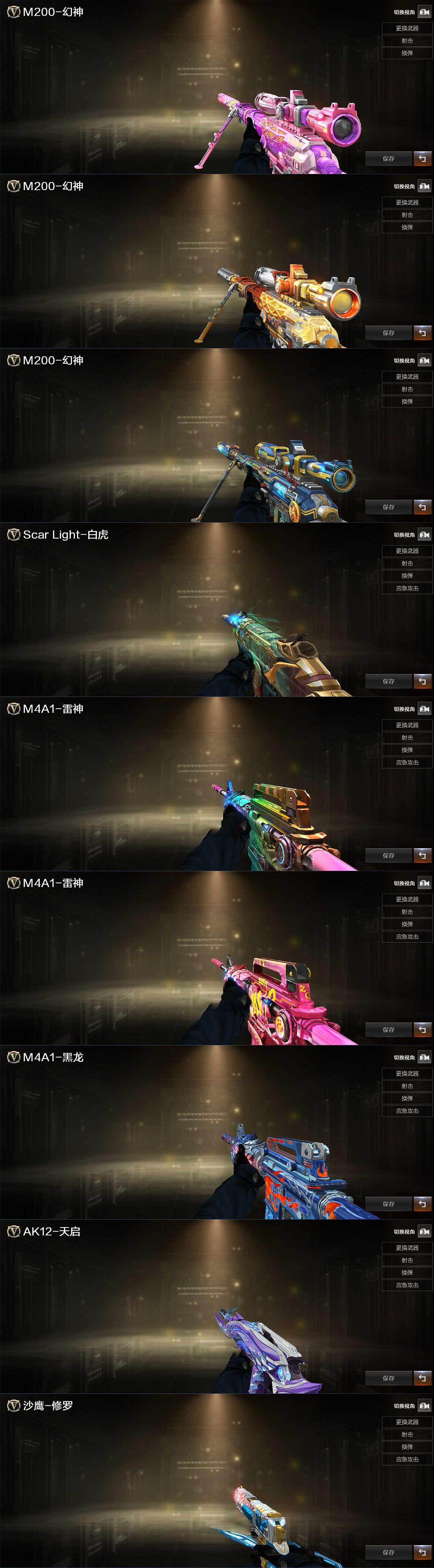 【英雄级武器】:M4A1-雷神,G36C-幻影,黑武士-锦绣游龙,超新星-热带奇洋,M200-幻神,王者森决-觉醒版,烈龙-云海游龙,沙鹰-修罗*2,擎天-云海游龙,龙啸-热带奇洋,屠龙-云海游龙,手雷-云海游龙,手雷-热带奇洋