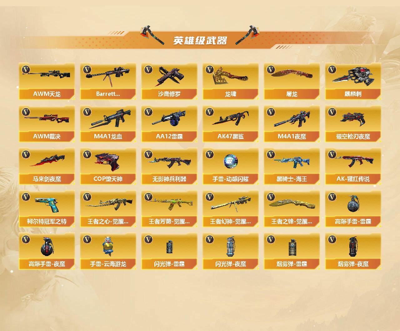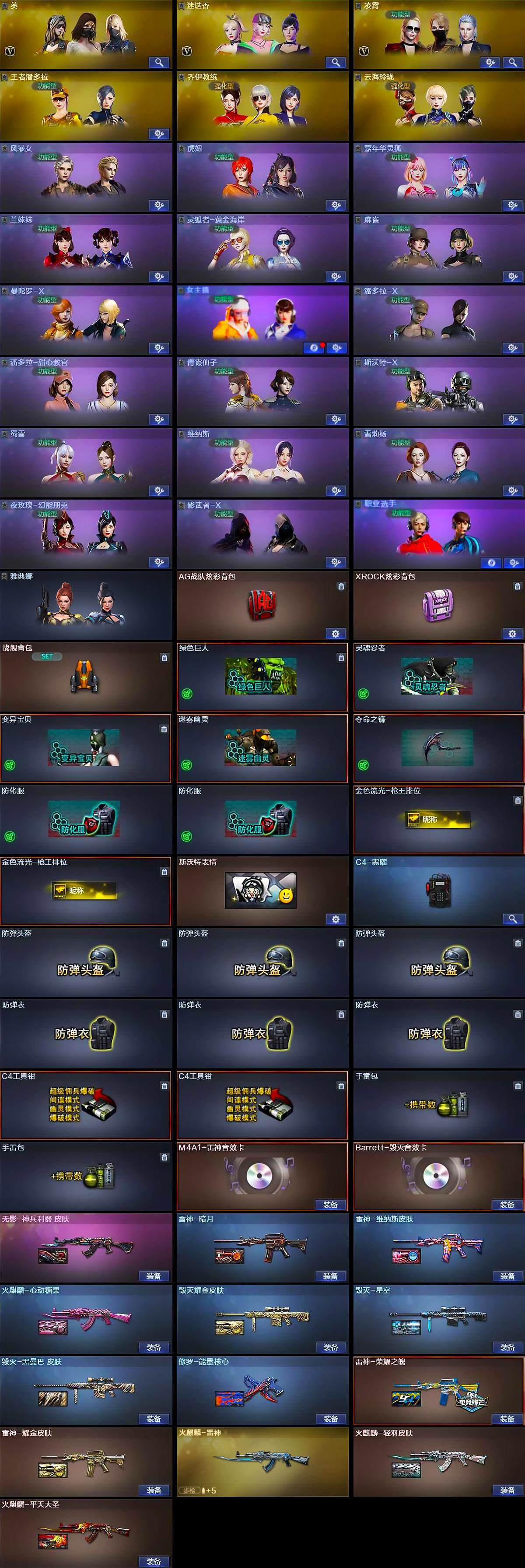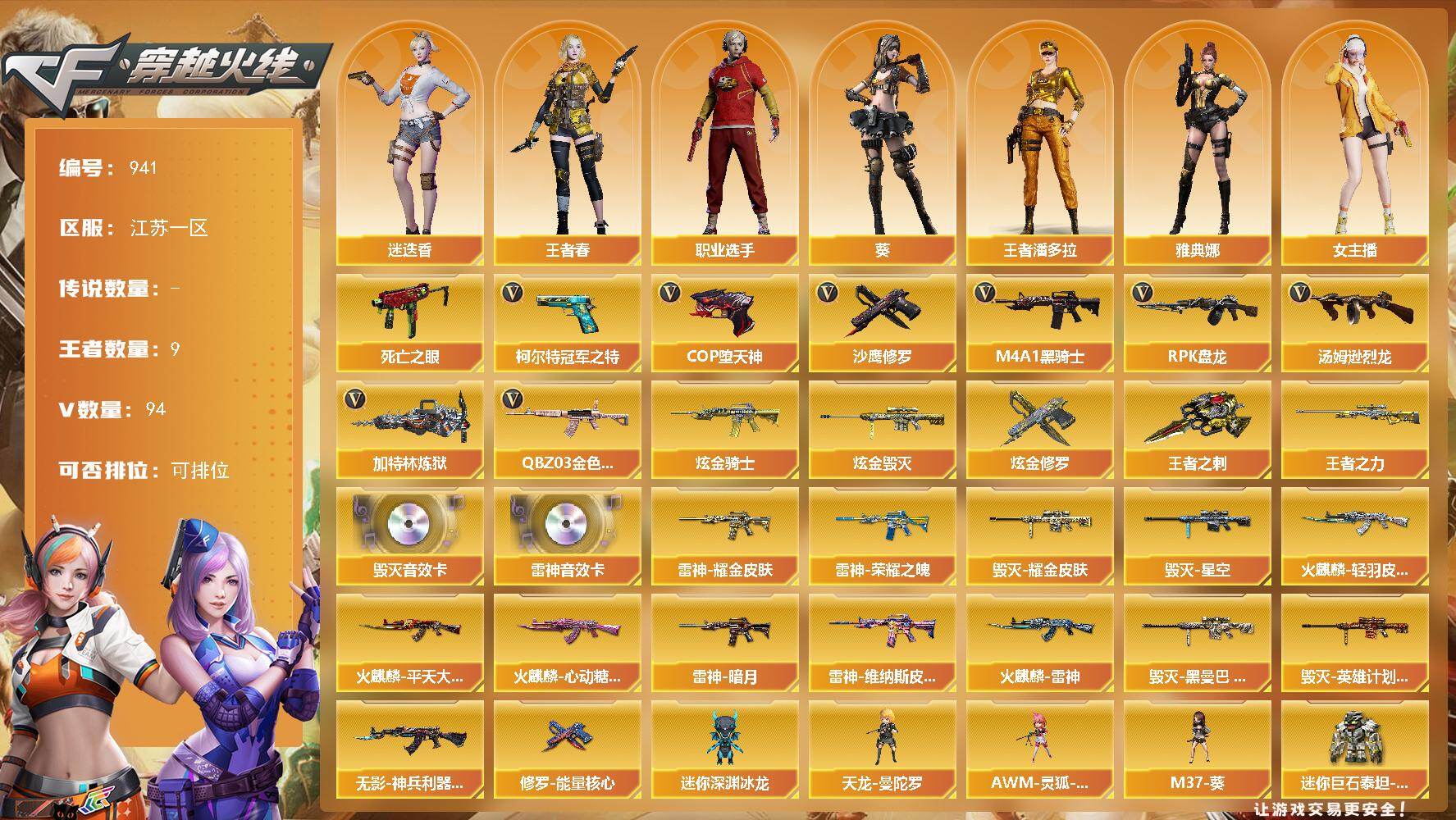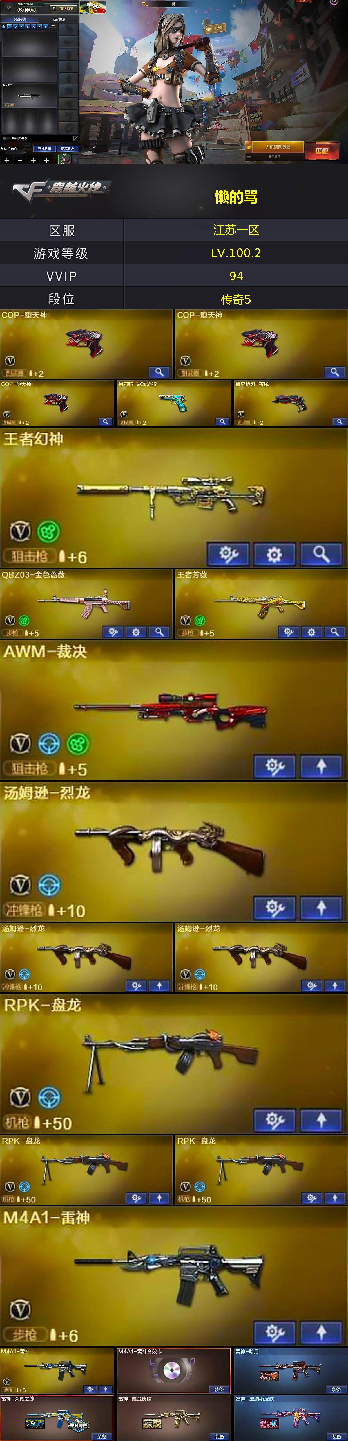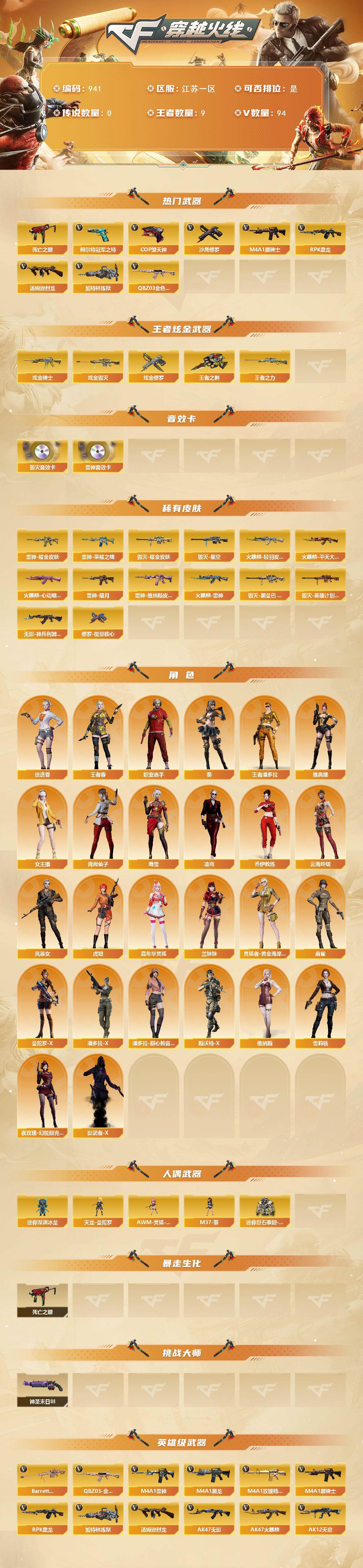 [14637300]91V/100级/元帅/9王者/4炫金/3英雄/QBZ03-金色蔷薇/死亡之眼/柯尔特-冠军之特/M4A1-黑骑士/汤姆逊-烈龙/RPK-盘龙/加特林-炼狱/COP-堕天神/沙鹰-修罗/王者之力/王者之刺/炫金黑骑士/炫金毁灭/炫金修罗/M4A1-雷神音效卡/Barrett-毁灭音效卡/雷神-暗月/雷神荣耀之魄/雷神-耀金皮肤/雷神-维纳斯皮肤/火麒麟-雷神/火麒麟-轻羽皮肤/火麒麟-平天大圣/火麒麟-心动糖果/毁灭耀金皮肤/毁灭-星空/毁灭-黑曼巴 皮肤/毁灭-英雄计划 皮肤/无影-神兵利器 皮肤/修罗-能量核心/葵/迷迭香/凌霄/王者春/王者潘多拉/乔伊教练/云海玲珑/风暴女/虎妞/嘉年华灵狐/兰妹妹/灵狐者-黄金海岸/麻雀/曼陀罗-X/女主播/潘多拉-X/潘多拉-甜心教官/青霞仙子/斯沃特-X/蜀雪/维纳斯/雪莉杨/夜玫瑰-幻能朋克/影武者-X/职业选手/雅典娜/天龙-曼陀罗/AWM-灵狐-15周年嘉年华/M37-葵/迷你深渊冰龙/迷你巨石泰坦-魔花研究所/神圣爆裂者-末日/AK47-火麒麟/M4A1-黑龙/M4A1-雷神/AK47-无影/AK12-天启/AK47-黑鲨/M4A1-龙血/M4A1-夜魔/无影-神兵利器/M4A1-玫瑰精灵/王者之心-觉醒版/AK-47-猩红传说/黑骑士-海王/王者芳薇-觉醒版/AWM-天龙/Barrett-毁灭/AWM-裁决/Barrett-金色蔷薇/王者幻神-觉醒版/AA-12-雷霆/破空枪刃-夜魔/屠龙/龙啸/马来剑夜魔/麒麟刺/王者之锋-觉醒版/高爆手雷-雷霆/高爆手雷-夜魔/手雷-动感闪耀/手雷-云海游龙/闪光弹-雷霆/闪光弹-夜魔/烟雾弹-雷霆/烟雾弹-夜魔/AG战队炫彩背包/XROCK炫彩背包/战舰背包/绿色巨人/灵魂忍者/变异宝贝/迷雾幽灵/夺命之镰/防化服/金色流光-枪王排位/斯沃特表情/C4-黑曜/防弹头盔/防弹衣/C4工具钳/手雷包