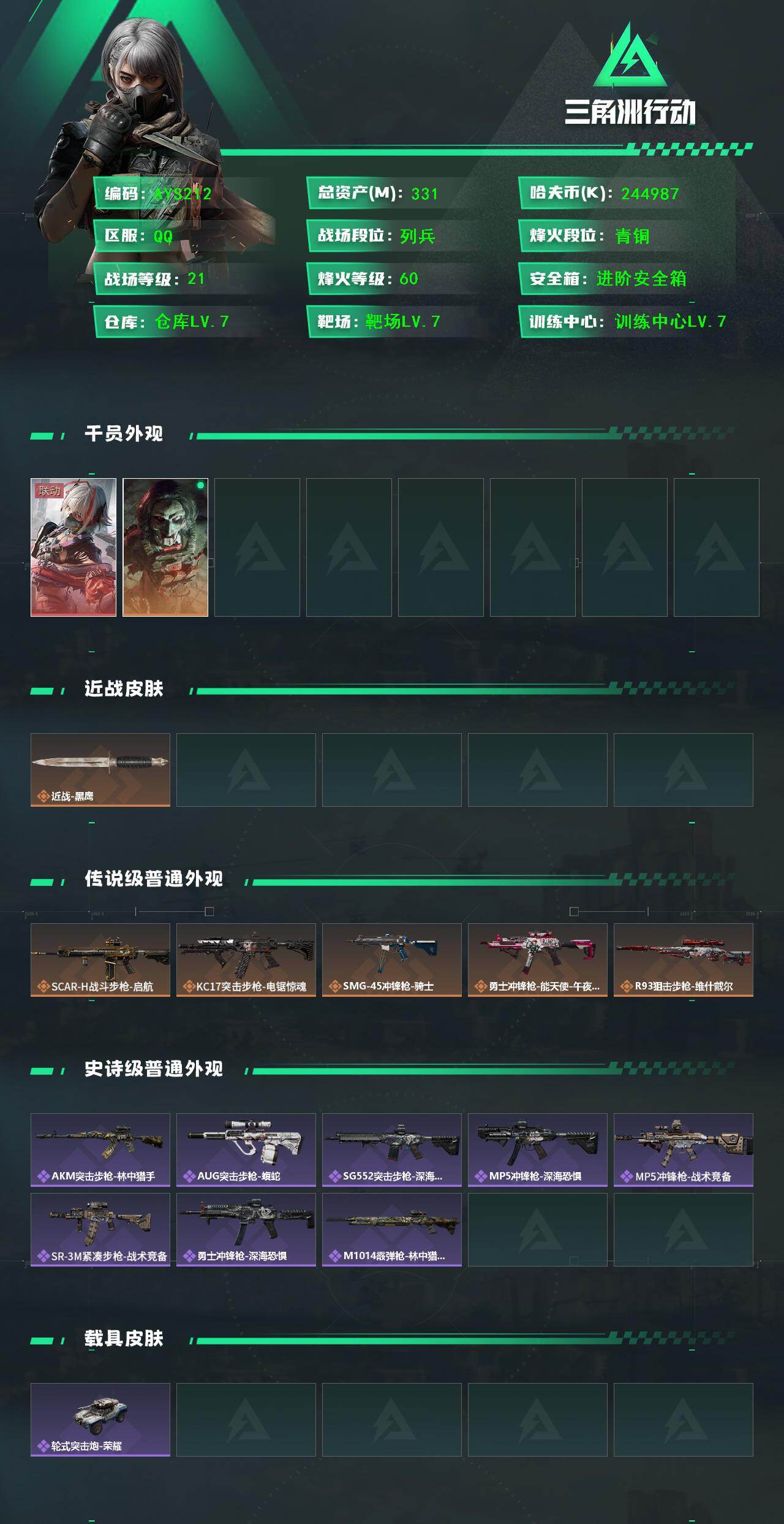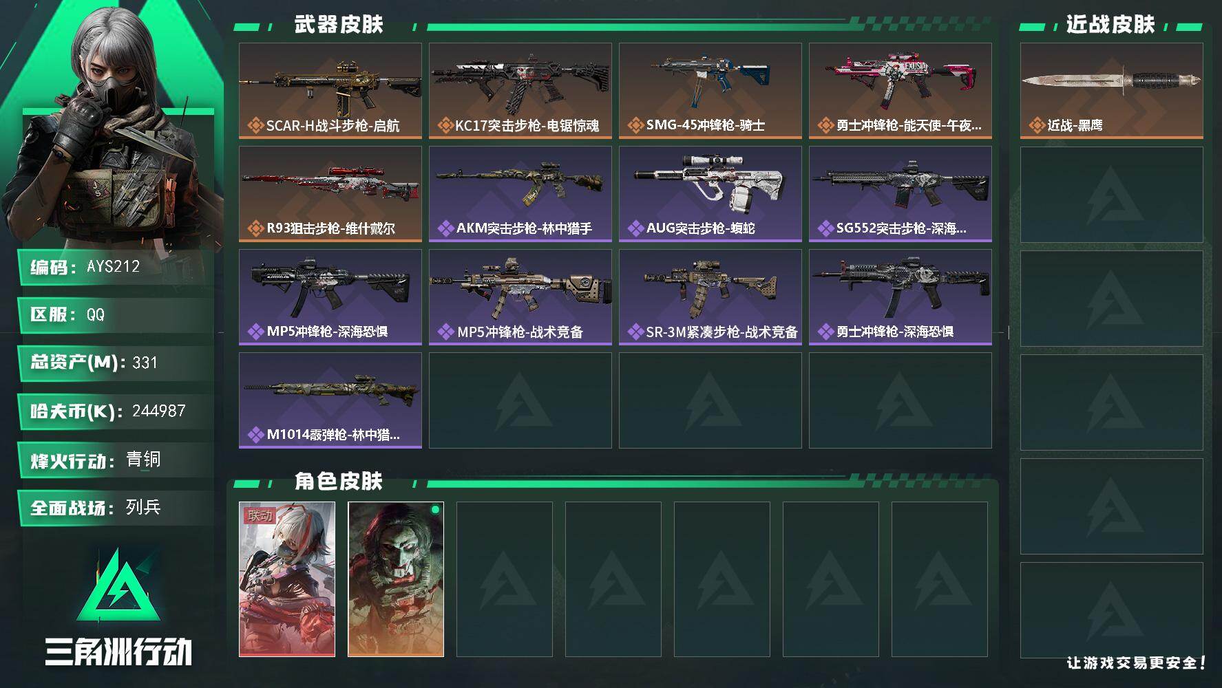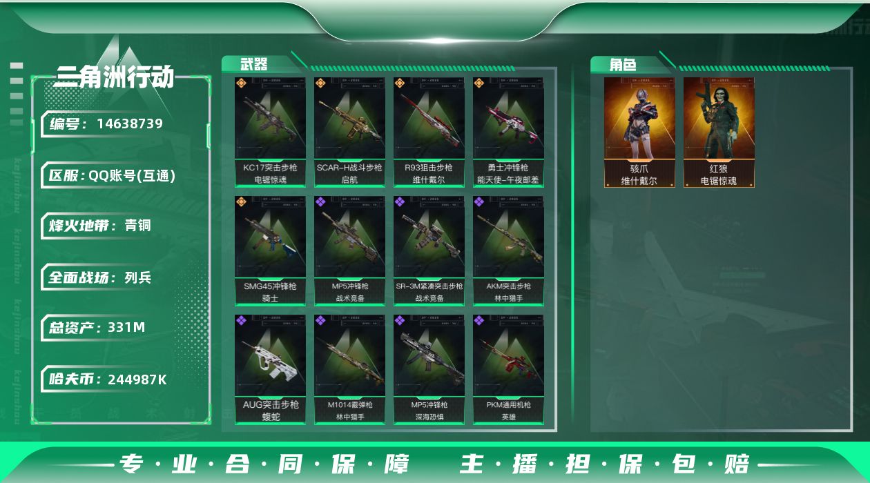 [14638739]【店主推荐捡漏号!可直接换绑】244987k哈伏币-307m流动资产-60烽火等级-青铜-21战场等级-列兵 资产331【干员外观】:骇爪-维什戴尔,红狼-电锯惊魂 【近战皮肤】:近战-黑鹰 【传说外观】:SCAR-H战斗步枪-启航,KC17突击步枪-电锯惊魂,SMG-45冲锋枪-骑士,勇士冲锋枪-能天使-午夜邮差,R93狙击步枪-维什戴尔 【史诗外观】:AKM突击步枪-林中猎手,AUG突击步枪-蝮蛇,SG552突击步枪-深海恐惧,MP5冲锋枪-深海恐惧,MP5冲锋枪-战术竞备,SR-3M紧凑突击步枪-战术竞备,勇士冲锋枪-深海恐惧,M1014霰弹枪-林中猎手 【稀有外观】:M4A1突击步枪-零点,AKS-74U突击步枪-前沿科技,ASh-12战斗步枪-星链科技,ASh-12战斗步枪-哈夫克航天,K416突击步枪-碳纤维,M7战斗步枪-捣蛋鬼,AK-12突击步枪-零点,SCAR-H战斗步枪-荣耀列队,PTR-32突击步枪-天网,腾龙突击步枪-冰天雪地,MP5冲锋枪-弄臣,MP5冲锋枪-哈夫克卫队,P90冲锋枪-街头涂鸦,P90冲锋枪-黄昏,Vector冲锋枪-行动开启,UZI冲锋枪-亚特兰蒂斯,SMG-45-行动开启,SMG-45冲锋枪-幻影结构,MP7冲锋枪-幻影结构,M1014霰弹枪-幻影结构,PKM通用机枪-英雄,M249轻机枪-毛鲁斯之力,QJB201轻机枪-哈夫克卫队,Mini-14射手步枪-荣耀列队,SVD狙击步枪-战术行动,SKS射手步枪-弄臣,SR-25射手步枪-蜂窝科技,G18-星链科技,G18-哈夫克航天 【普通外观】:UZI冲锋枪-蛇纹涂装,M4A1突击步枪-粉色涂装,M4A1突击步枪-高雅黑,M4A1突击步枪-海色,QBZ95-1突击步枪-高雅黑,QBZ95-1突击步枪-海浪,QBZ95-1突击步枪-海色,K416突击步枪-几何迷彩,K416突击步枪-高雅黑,M16A4突击步枪-高雅黑,AUG突击步枪-浅蓝涂装,M7战斗步枪-红色涂装,SG552突击步枪-浅蓝涂装,AK-12突击步枪-冰川,AK-12突击步枪-落花,SCAR-H战斗步枪-红色涂装,SCAR-H战斗步枪-数码迷彩,G3战斗步枪-高雅黑,MP5冲锋枪-安全工作,MP5冲锋枪-海色,P90冲锋枪-安全工作,Vector冲锋枪-几何迷彩,UZI冲锋枪-海色,QCQ171冲锋枪-