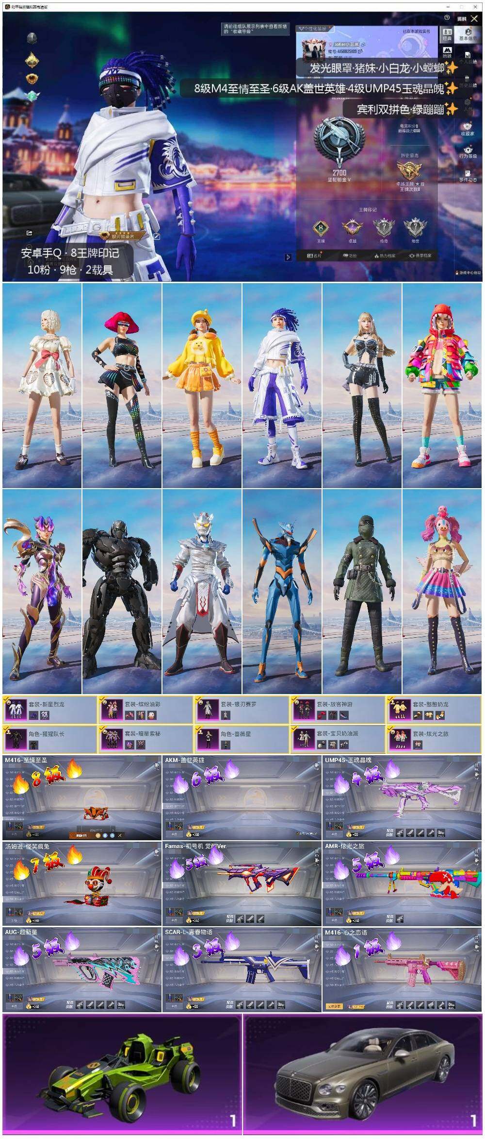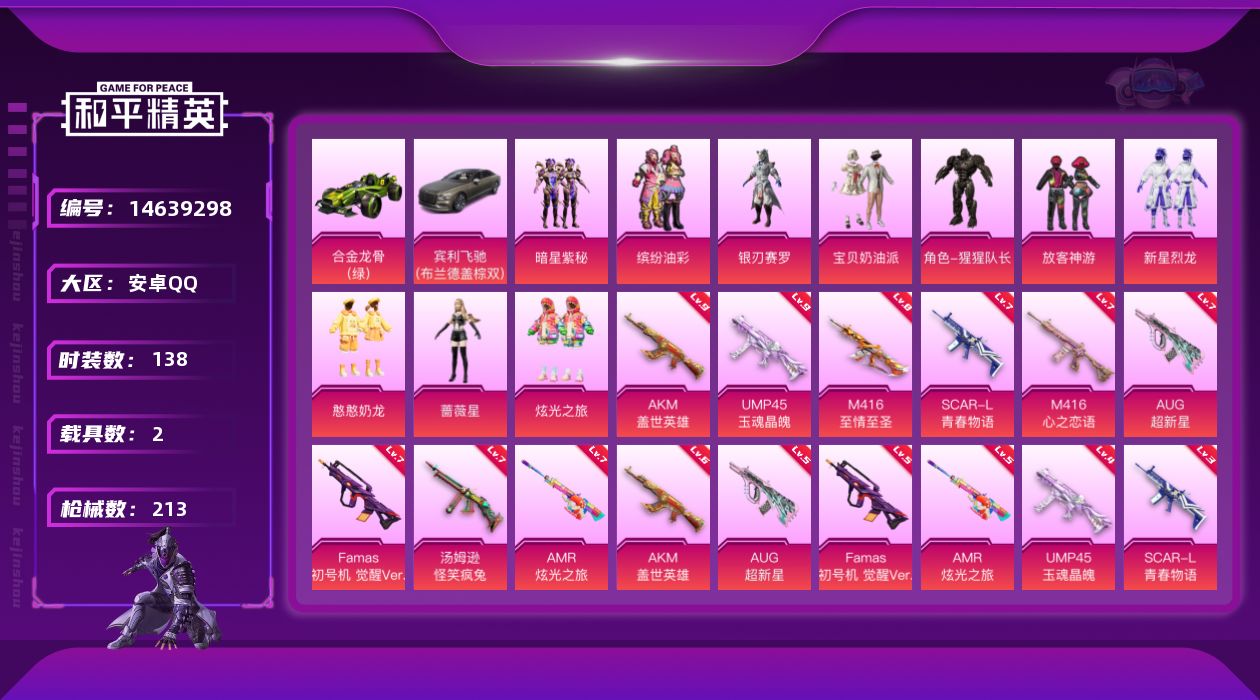 [14639298]可二次【店主推荐捡漏号!可直接换绑】/素材身法号 安卓 手Q-10粉装-9特效枪-2载具-1粉色飞行器-6.8w热力值-8王牌印记-138套装-213枪皮【热门品类】:粉装-缤纷油彩,套装-龟仙人,角色-Mark.06【粉色载具】:宾利飞驰(布罗德盖棕双色),合金龙骨(绿)【粉色套装】:粉装-宝贝奶油派,粉装-缤纷油彩,粉装-放客神游,粉装-新星烈龙,粉装-银刃赛罗,粉装-暗星紫秘,角色-猩猩队长,粉装-炫光之旅,角色-蔷薇星,粉装-憨憨奶龙【粉色枪皮等级】:AKM-盖世英雄(六级),SCAR-L-青春物语(三级),M416-心之恋语(一级),M416-至情至圣(八级),AUG-超新星(五级),Famas-初号机 觉醒Ver.(五级),UMP45-玉魂晶魄(四级),汤姆逊-怪笑疯兔(七级),AMR-炫光之旅(五级)【粉色飞行器】:超新星飞行器