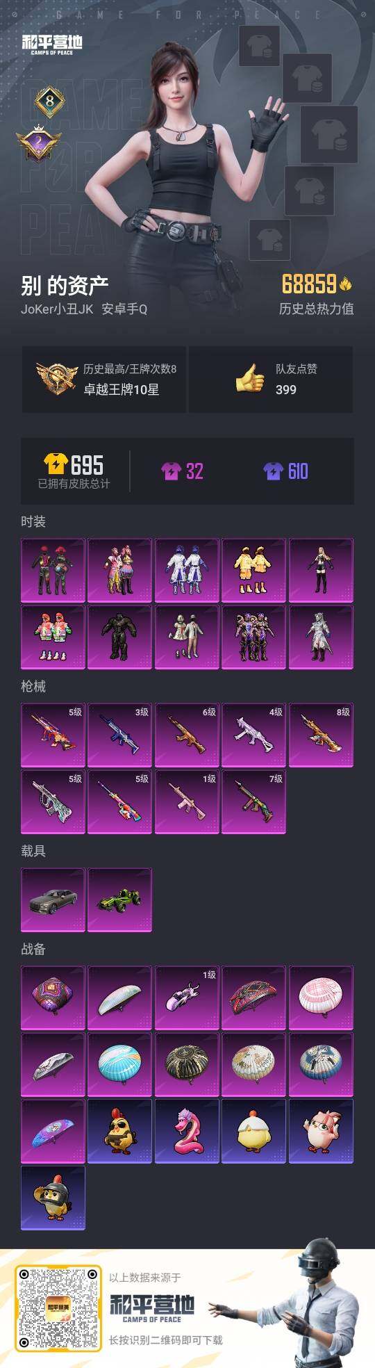 - PX_2066779- 苹果手Q-14王牌印记-9粉装-2特效枪-3载具-89773热力值-191套装-263枪皮-1卓越印记-1传奇印记 【9粉装】,洛天依,智耀战神,草莓生巧,暗星紫秘,精灵娃娃,向日葵,女娲灵识,彩虹鹿灵,山涧鹿灵 【2特效枪】SCAR-L-梦幻火箭-7级 Kar98K-伏魔团-5级 【4稀有紫装】,浪漫天命,雪山精英,迅捷狂鲨,暗夜魅影, 【3稀有载具】,迈凯伦塞纳(冷萃