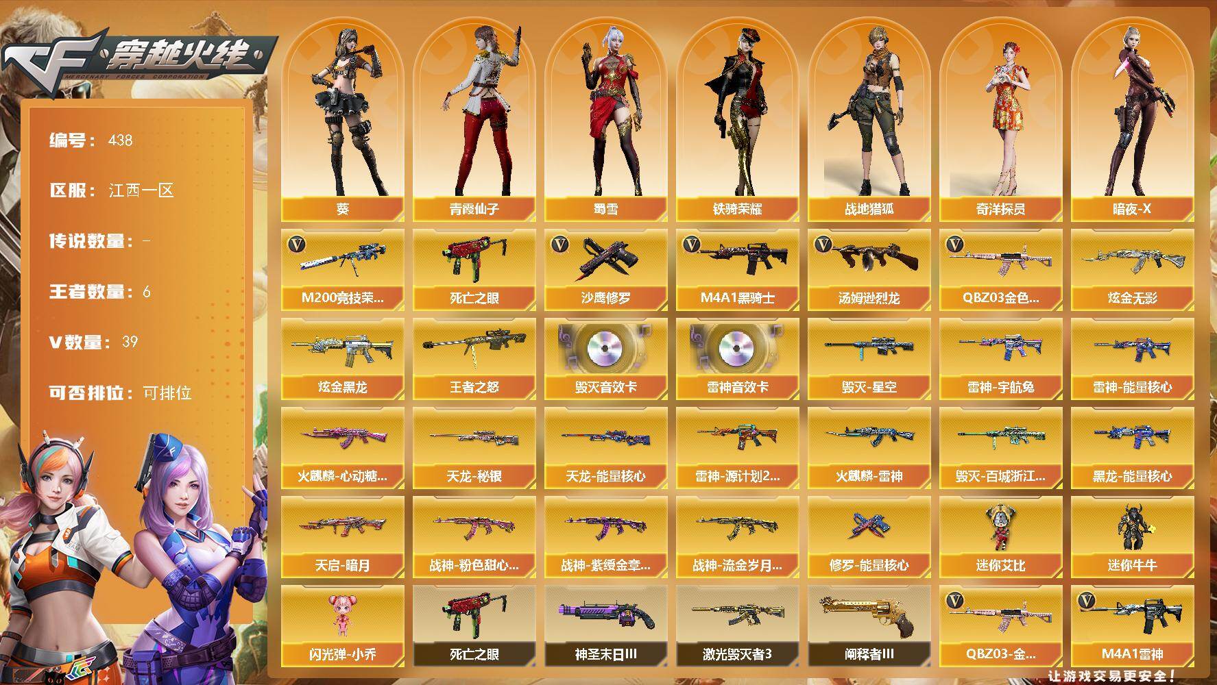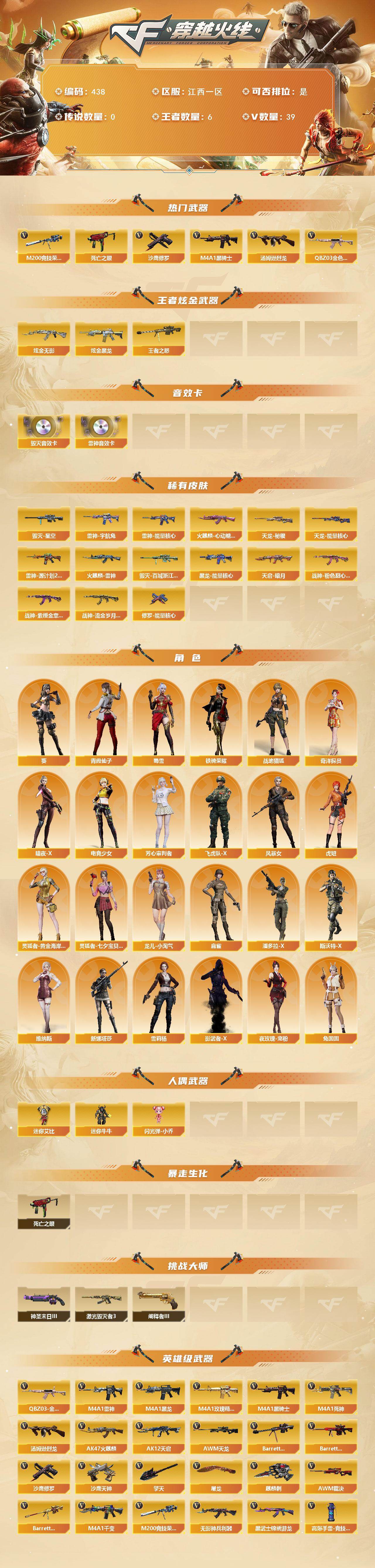 [14645984]江西一区-39V-6王者-3炫金 【热门武器】:QBZ03-金色蔷薇,M200-竞技荣光,死亡之眼,M4A1-黑骑士,汤姆逊-烈龙*2,沙鹰-修罗*2 【王者炫金武器】:王者之怒*2,炫金无影*2,炫金黑龙 【音效卡】:M4A1-雷神音效卡,Barrett-毁灭音效卡 【皮肤】:雷神-能量核心,雷神-宇航兔皮肤,雷神-源计划2.0专属 皮肤,火麒麟-雷神,火麒麟-心动糖果,毁灭-星空,毁灭-百城浙江 皮肤,黑龙-能量核心,天启-暗月*2,战神-粉色甜心皮肤,战神-紫绶金章皮肤,战神-流金岁月皮肤,天龙-秘银,天龙-能量核心,修罗-能量核心 【角色】:葵,战地猎狐,奇洋探员,暗夜-X,电竞少女,芳心审判者,飞虎队-X,风暴女,虎妞,灵狐者-黄金海岸,灵狐者-七夕宝贝,龙儿-小淘气,麻雀,潘多拉-X,青霞仙子,斯沃特-X,蜀雪,铁骑荣耀,兔囡囡,维纳斯,新娜塔莎,雪莉杨,夜玫瑰-宠粉,影武者-X 【人偶武器】:迷你牛牛,闪光弹-小乔,迷你艾比 【暴走生化】:死亡之眼 【挑战大师】:激光毁灭者III,神圣爆裂者-末日III,阐释者III 【英雄级武器】:M4A1-千变,AK47-火麒麟,M4A1-黑龙,M4A1-雷神*2,M4A1-黑骑士,M4A1-死神,AK12-天启,无影-神兵利器,黑武士-锦绣游龙,M4A1-玫瑰精灵,QBZ03-金色蔷薇,王者之魄-觉醒版,AK47-B-战神,黑骑士-海王,QBZ-03-王者蔷薇-觉醒版,AWM-天龙,Barrett-毁灭,Barrett-极光,AWM-裁决,Barrett-朱雀,M200-竞技荣光,汤姆逊-烈龙*2,沙鹰-修罗*2,沙鹰-天神*3,屠龙,擎天,麒麟刺,王者之锋-觉醒版,高爆手雷-竞技荣光*3,高爆手雷-云龙,手雷-热带奇洋,M4A1-赤狱骑士,AWM-昌龙 【道具】:CFS限定背包,亚洲杯纪念炫彩背包,冰冰企鹅背包,奇洋探员-海龟背包,女皇终结者-背包,战舰背包,超级背包,迷你冰龙背包,女皇终结者-魔龙之吻,救世主-黑桃战神,绿色巨人,灵魂忍者*2,变异宝贝,迷雾幽灵*2,夺命之镰,防化服*3,金色流光-枪王排位*2,星辰流光-枪王排位,巅峰赛先锋-金色流光,枪王排位28赛季金色流光,枪王排位29赛季金色流光,EP战队名片,EP战队喷图,防弹头盔*8,防弹衣*6,C4工具钳*4,手雷包*6 【特殊枪械】:1黑骑士