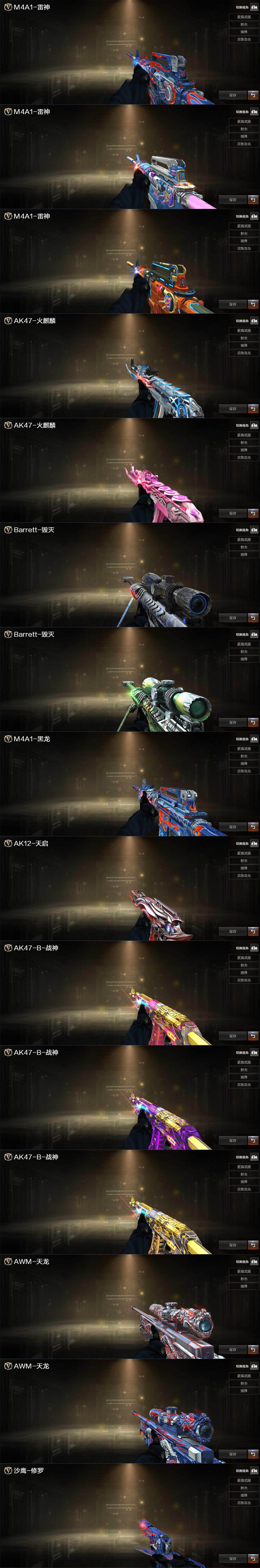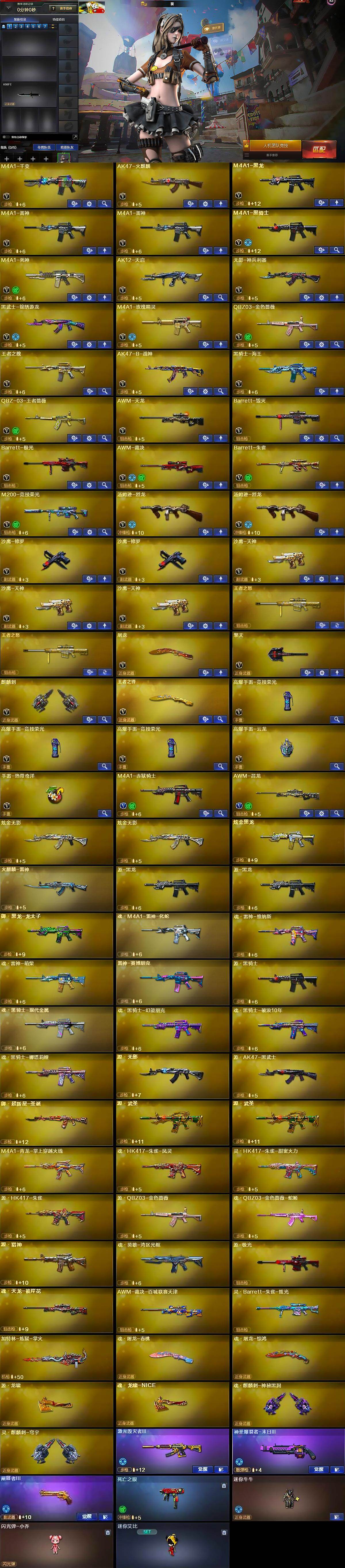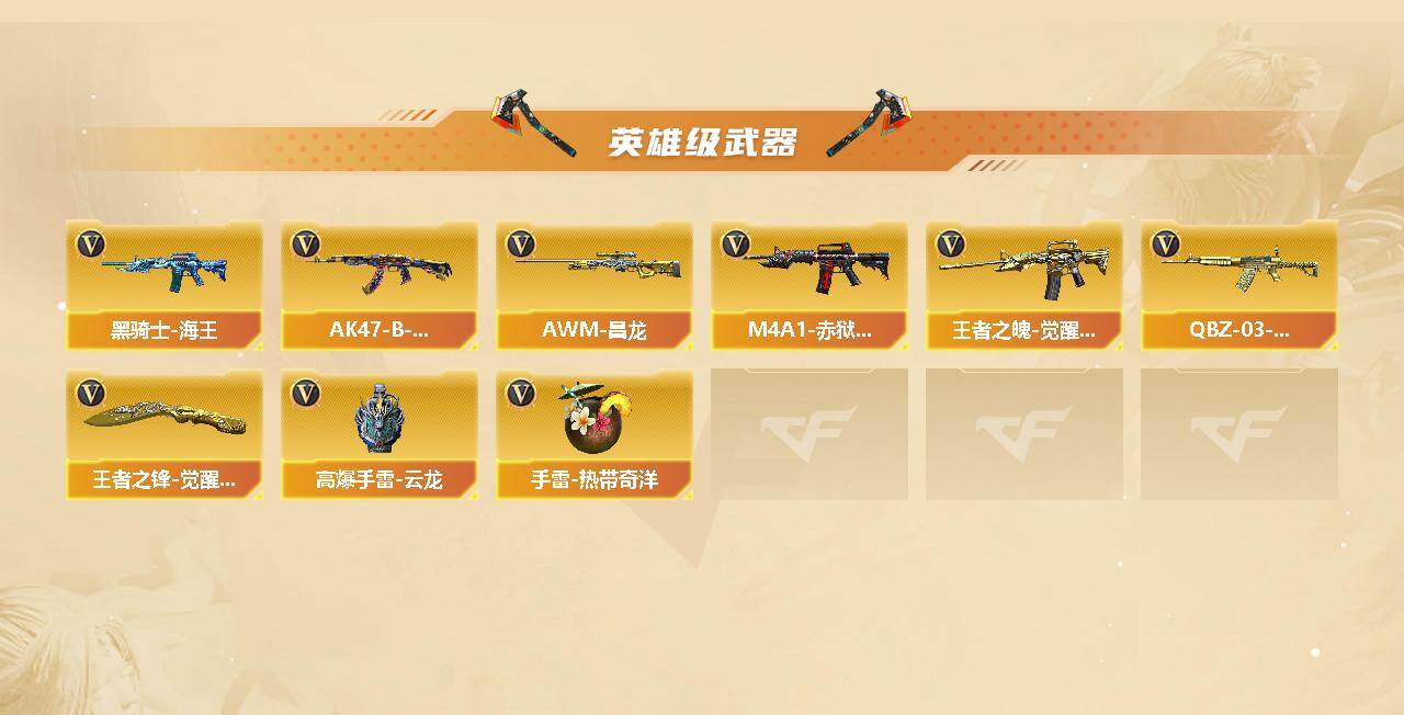 【英雄级武器】:M4A1-千变,AK47-火麒麟,M4A1-黑龙,M4A1-雷神*2,M4A1-黑骑士,M4A1-死神,AK12-天启,无影-神兵利器,黑武士-锦绣游龙,M4A1-玫瑰精灵,QBZ03-金色蔷薇,王者之魄-觉醒版,AK47-B-战神,黑骑士-海王,QBZ-03-王者蔷薇-觉醒版,AWM-天龙,Barrett-毁灭,Barrett-极光,AWM-裁决,Barrett-朱雀,M200-竞技荣光,汤姆逊-烈龙*2,沙鹰-修罗*2,沙鹰-天神*3,屠龙,擎天,麒麟刺,王者之锋-觉醒版,高爆手雷-竞技荣光*3,高爆手雷-云龙,手雷-热带奇洋,M4A1-赤狱骑士,AWM-昌龙