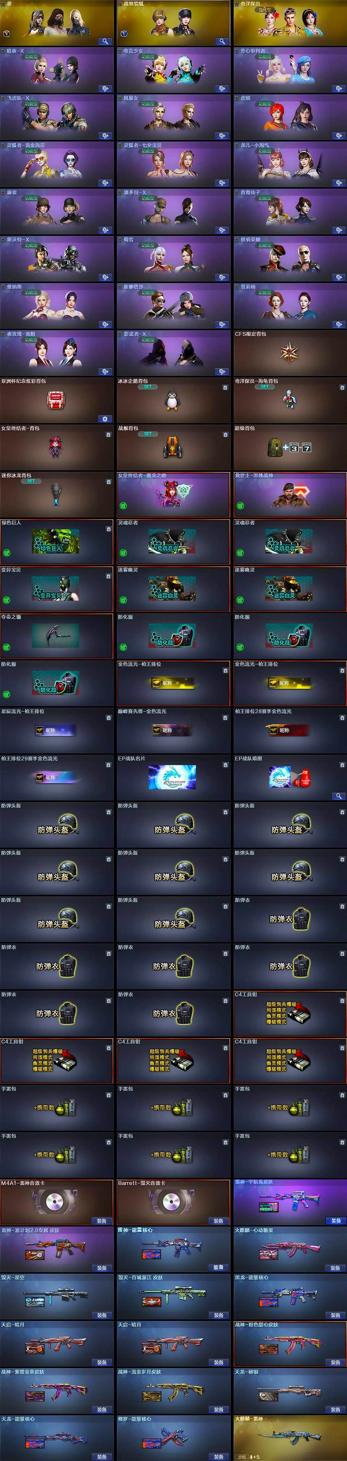 【道具】:CFS限定背包,亚洲杯纪念炫彩背包,冰冰企鹅背包,奇洋探员-海龟背包,女皇终结者-背包,战舰背包,超级背包,迷你冰龙背包,女皇终结者-魔龙之吻,救世主-黑桃战神,绿色巨人,灵魂忍者*2,变异宝贝,迷雾幽灵*2,夺命之镰,防化服*3,金色流光-枪王排位*2,星辰流光-枪王排位,巅峰赛先锋-金色流光,枪王排位28赛季金色流光,枪王排位29赛季金色流光,EP战队名片,EP战队喷图,防弹头盔*8,防弹衣*6,C4工具钳*4,手雷包*6