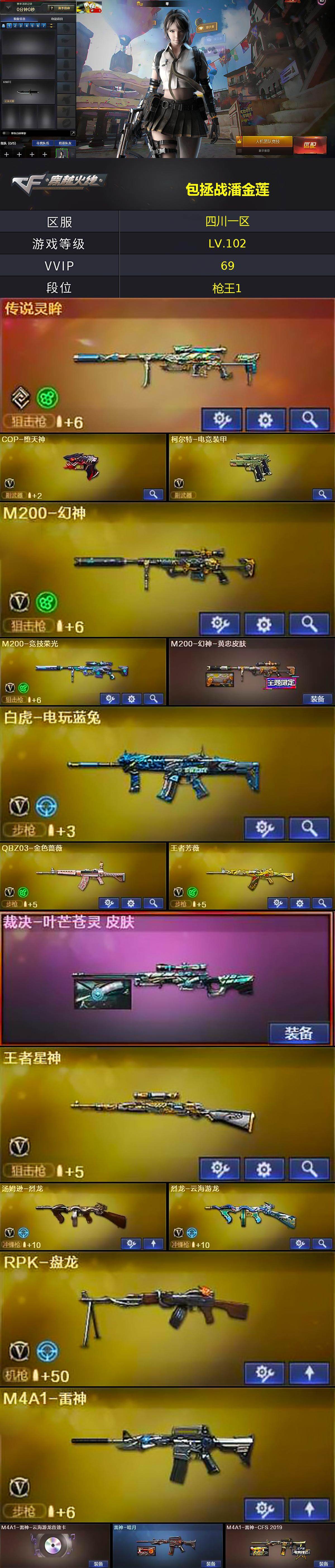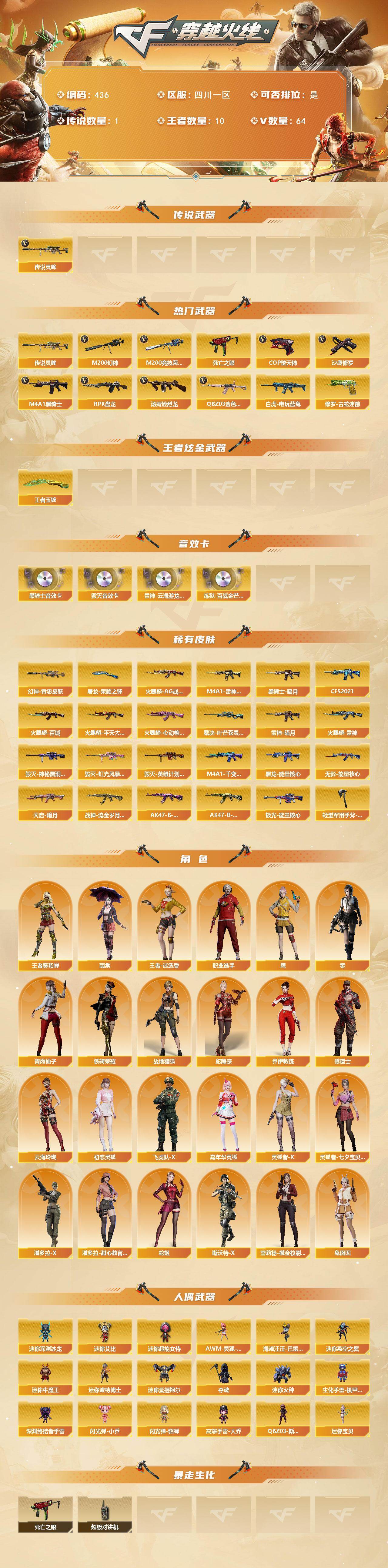 [14645785]四川一区-64V-10王者-0炫金 【传说武器】:传说灵眸 【热门武器】:传说灵眸,QBZ03-金色蔷薇,M200-幻神,修罗-古蛇迷踪,M200-竞技荣光,死亡之眼,白虎-电玩蓝兔,M4A1-黑骑士,汤姆逊-烈龙,RPK-盘龙,COP-堕天神,沙鹰-修罗*3 【王者炫金武器】:王者玉锋 【音效卡】:M4A1-雷神-云海游龙音效卡,M4A1-黑骑士音效卡,Barrett-毁灭音效卡,炼狱-百战金芒-庆典舞曲音效卡 【皮肤】:M200-幻神-黄忠皮肤,裁决-叶芒苍灵 皮肤,雷神-暗月,M4A1-雷神-CFS 2019,火麒麟-AG战队皮肤,火麒麟-雷神,火麒麟-平天大圣,火麒麟-百城,火麒麟-心动糖果,毁灭-神秘黑洞皮肤,毁灭-虹光风暴 皮肤,毁灭-英雄计划 皮肤,M4A1-千变-孔明皮肤,黑龙-能量核心,黑骑士-暗月,黑骑士-CFS2021,无影-能量核心,天启-暗月*2,战神-流金岁月皮肤*2,AK47-B-常胜将军-曹操*3,AK47-B-常胜将军-孙权,极光-能量核心,屠龙-荣耀之锋,轻型军用手斧-再燃火线 【角色】:零,雨棠,鹰,战地猎狐,王者-葵-貂蝉,王者-迷迭香,蛇隐宗,乔伊教练,修道士,云海玲珑,初恋灵狐,飞虎队-X,嘉年华灵狐,灵狐者-X,灵狐者-七夕宝贝,潘多拉-X,潘多拉-甜心教官,青霞仙子,蛇姬,斯沃特-X,铁骑荣耀,兔囡囡,雪莉杨-摸金校尉,职业选手 【人偶武器】:迷你宝贝,AWM-灵狐-15周年嘉年华,海滩汪汪-巴雷特,迷你深渊冰龙,迷你裂空之翼,迷你牛魔王,迷你波特博士,迷你曼提柯尔*2,夺魂*5,迷你火种,生化手雷-机甲核心,深渊终结者手雷,闪光弹-小乔,闪光弹-貂蝉,高爆手雷-大乔,迷你艾比,迷你超能女侍,QBZ03-斯沃特 【暴走生化】:死亡之眼,超级对讲机 【挑战大师】:神圣爆裂者III,冰龙粉碎者-白马银枪,激光毁灭者III-白马银枪,VEPR-12-金魔,激光毁灭者III,机甲撕裂者III,试炼破坏者III,KAC-圣炎切割者III,神圣爆裂者-末日III,阐释者III*2,惩戒者III 【英雄级武器】:AK47-火麒麟,M4A1-黑龙,M4A1-雷神,M4A1-黑骑士,M4A1-死神,无影-神兵利器,黑武士-锦绣游龙,QBZ03-金色蔷薇,烈火-动感闪耀,AK-47-猩红传说*2,AK47-B-常胜将军,白虎-电玩蓝兔,