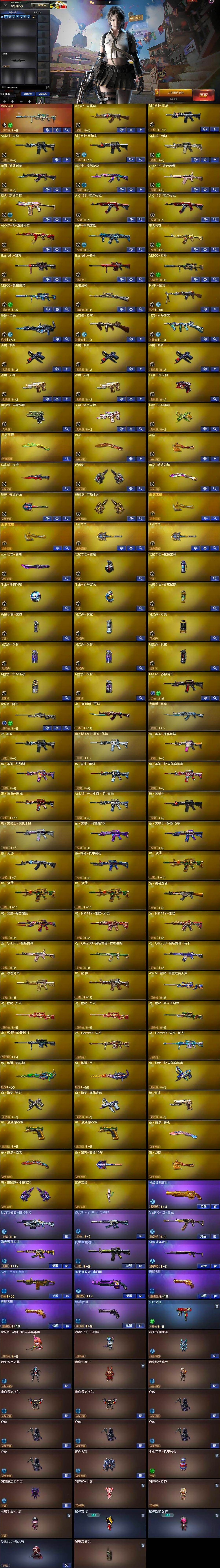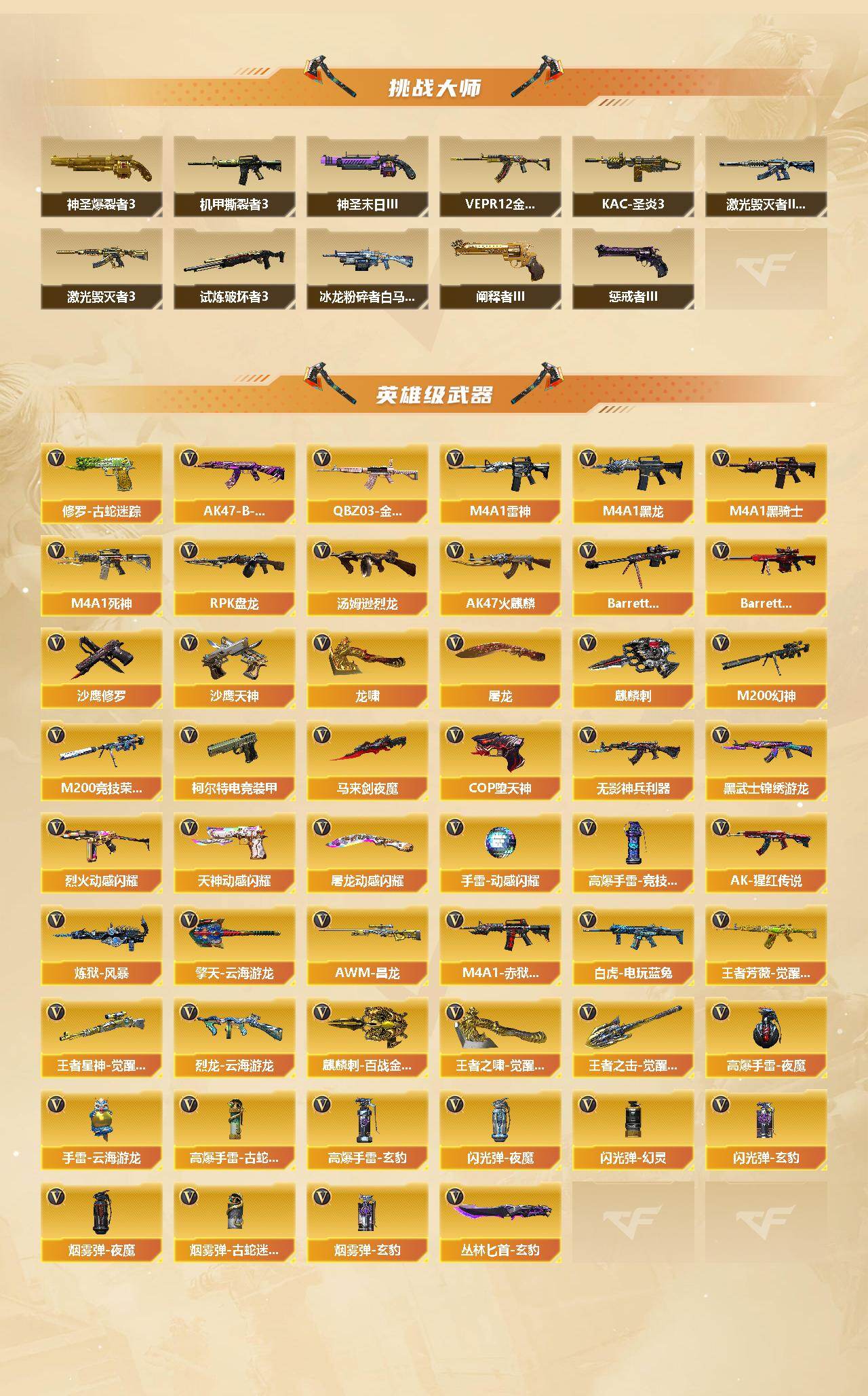 【英雄级武器】:AK47-火麒麟,M4A1-黑龙,M4A1-雷神,M4A1-黑骑士,M4A1-死神,无影-神兵利器,黑武士-锦绣游龙,QBZ03-金色蔷薇,烈火-动感闪耀,AK-47-猩红传说*2,AK47-B-常胜将军,白虎-电玩蓝兔,