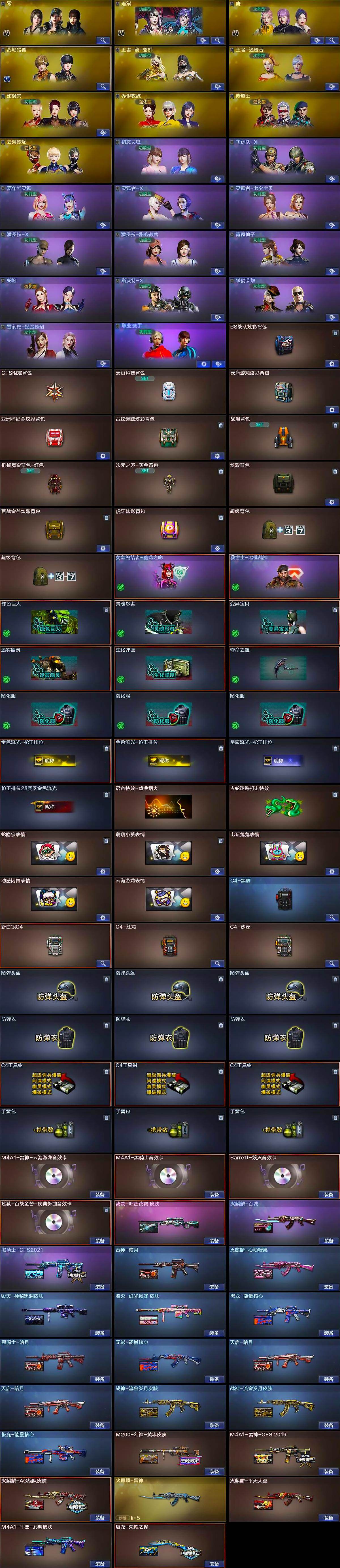 【皮肤】:M200-幻神-黄忠皮肤,裁决-叶芒苍灵 皮肤,雷神-暗月,M4A1-雷神-CFS 2019,火麒麟-AG战队皮肤,火麒麟-雷神,火麒麟-平天大圣,火麒麟-百城,火麒麟-心动糖果,毁灭-神秘黑洞皮肤,毁灭-虹光风暴 皮肤,毁灭-英雄计划 皮肤,M4A1-千变-孔明皮肤,黑龙-能量核心,黑骑士-暗月,黑骑士-CFS2021,无影-能量核心,天启-暗月*2,战神-流金岁月皮肤*2,AK47-B-常胜将军-曹操*3,AK47-B-常胜将军-孙权,极光-能量核心,屠龙-荣耀之锋,轻型军用手斧-再燃火线