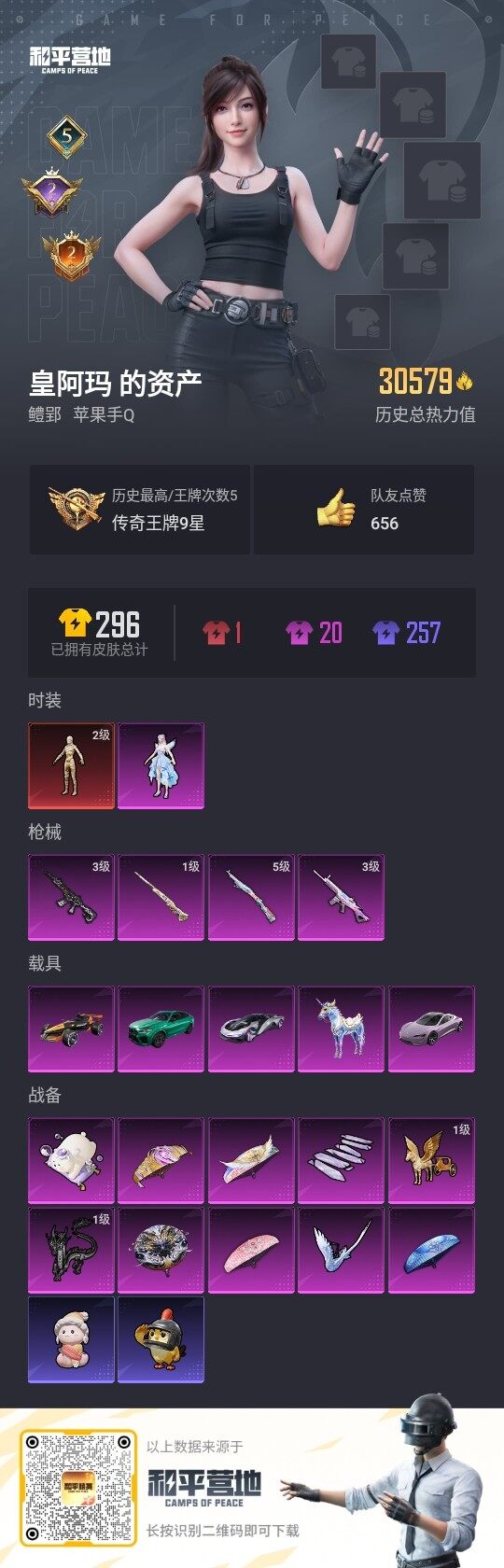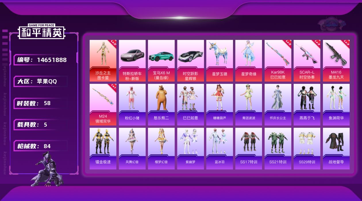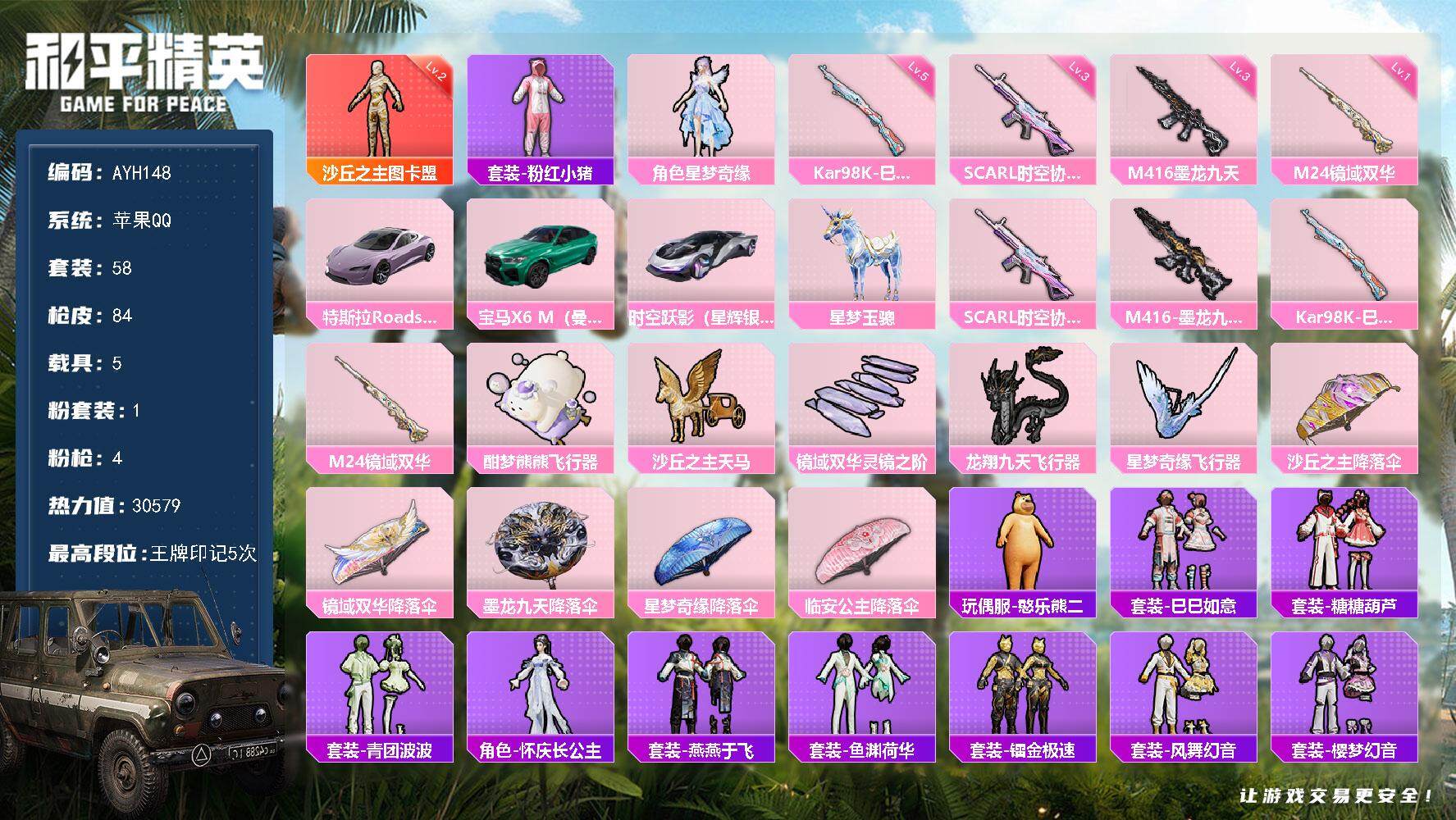 [14651888]苹果 手Q-1神装-1粉装-4特效枪-5载具-5粉色飞行器-30579热力值-5王牌印记-58套装-84枪皮【红色神装等级】:沙丘之主-图卡盟(二级)【红色角色神装】:沙丘之主-图卡盟【热门品类】:套装-粉红小猪【粉色套装】:角色-星梦奇缘【粉色枪皮等级】:SCAR-L-时空协奏(三级),M416-墨龙九天(三级),Kar98K-巳巳如意(五级),M24-镜域双华(一级)【粉色载具】:特斯拉Roadster(沁心粉),宝马X6 M(曼岛绿),时空跃影(星辉银),星梦玉骢【粉色枪皮】:SCAR-L-时空协奏,M416-墨龙九天,Kar98K-巳巳如意,M24-镜域双华【粉色飞行器】:酣梦熊熊飞行器,沙丘之主天马,镜域双华-灵镜之阶,龙翔九天飞行器,星梦奇缘飞行器