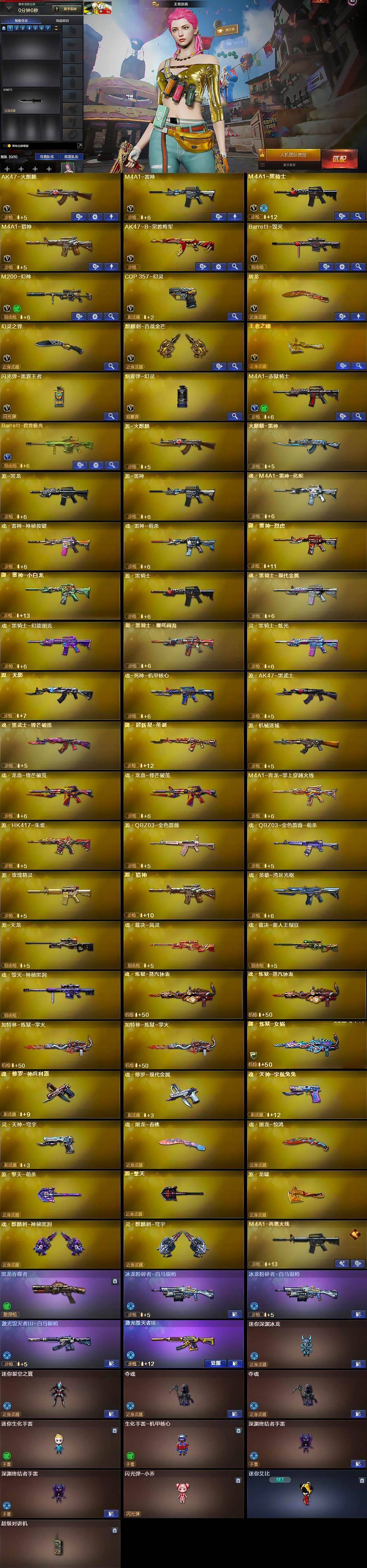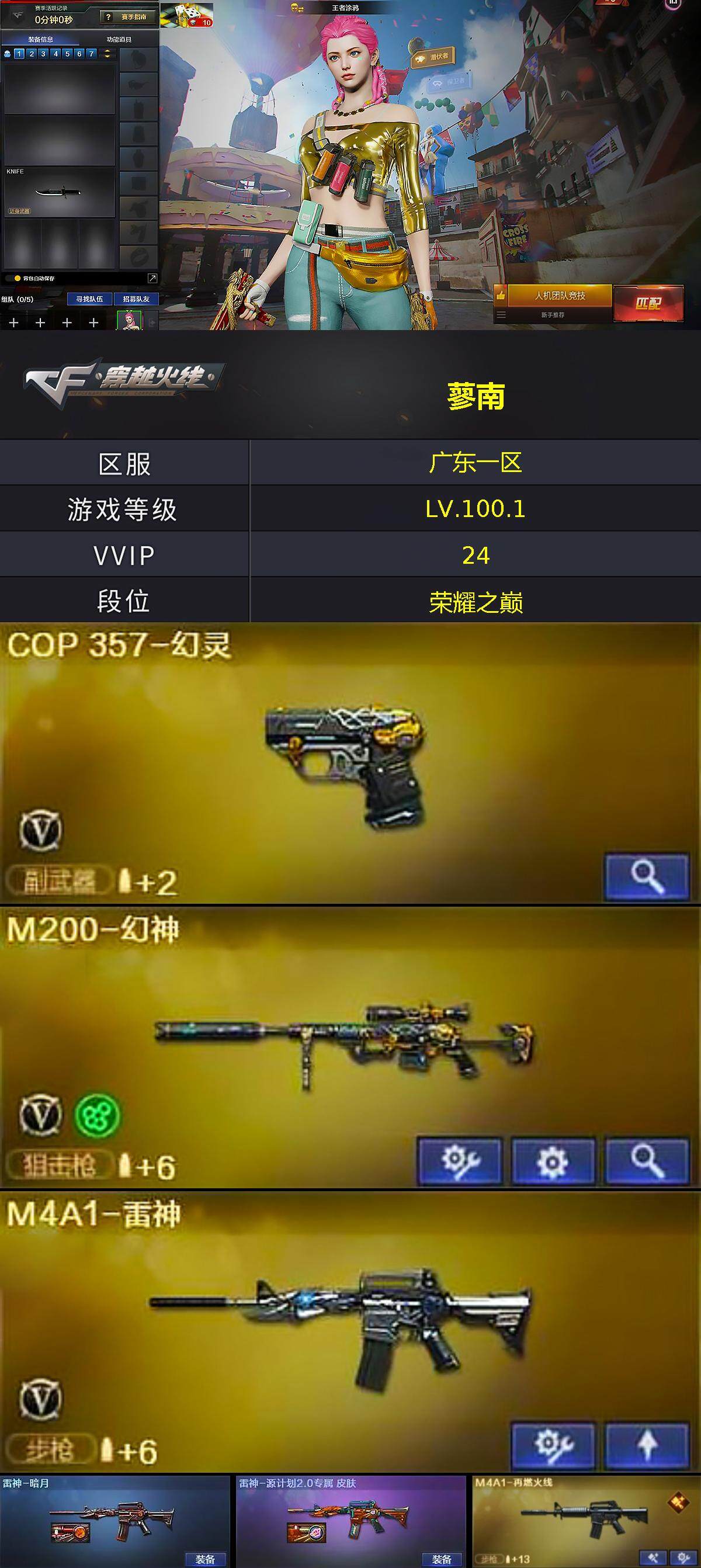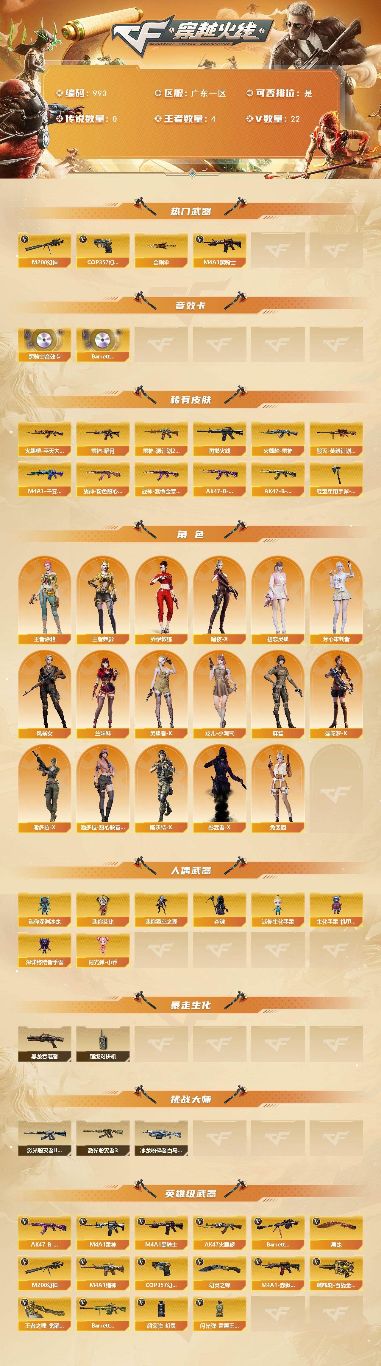 [14659196]广东一区-22V-4王者-0炫金 【热门武器】:M200-幻神,M4A1-黑骑士,COP 357-幻灵,金刚伞 【音效卡】:M4A1-黑骑士音效卡,Barrett-碧霄极光音效卡 【皮肤】:雷神-暗月,雷神-源计划2.0专属 皮肤,M4A1-再燃火线,火麒麟-雷神,火麒麟-平天大圣,毁灭-英雄计划 皮肤,M4A1-千变-孔明皮肤,战神-粉色甜心皮肤,战神-紫绶金章皮肤,AK47-B-常胜将军-曹操,AK47-B-常胜将军-孙权,轻型军用手斧-再燃火线 【角色】:王者涂鸦,王者-魅影,乔伊教练,暗夜-X,初恋灵狐,芳心审判者,风暴女,兰妹妹,灵狐者-X,龙儿-小淘气,麻雀,曼陀罗-X,潘多拉-X,潘多拉-甜心教官,斯沃特-X,兔囡囡,影武者-X 【人偶武器】:迷你深渊冰龙,迷你裂空之翼,夺魂*2,迷你生化手雷,生化手雷-机甲核心,深渊终结者手雷*2,闪光弹-小乔,迷你艾比 【暴走生化】:黑龙吞噬者,超级对讲机 【挑战大师】:冰龙粉碎者-白马银枪*2,激光毁灭者III-白马银枪,激光毁灭者III 【英雄级武器】:AK47-火麒麟,M4A1-雷神,M4A1-黑骑士,M4A1-猎神,AK47-B-常胜将军,Barrett-毁灭,M200-幻神,COP 357-幻灵,屠龙,幻灵之锋,麒麟刺-百战金芒,王者之啸-觉醒版,闪光弹-雷霆王者-觉醒版,烟雾弹-幻灵,M4A1-赤狱骑士,Barrett-碧霄极光 【道具】:BS战队炫彩背包,CFS限定背包,云山科技背包,炫彩背包,百战金芒炫彩背包,虎牙炫彩背包,超级背包,女皇终结者-魔龙之吻,黄金生化钩,绿色巨人,灵魂忍者*3,变异宝贝,迷雾幽灵*2,夺命之镰,防化服*3,星辰流光-枪王排位,流光-鎏金之域,枪王排位28赛季金色流光,萌萌小葵表情,防弹头盔*3,防弹衣*3,C4工具钳*4,手雷包*4 【特殊枪械】:1黑骑士