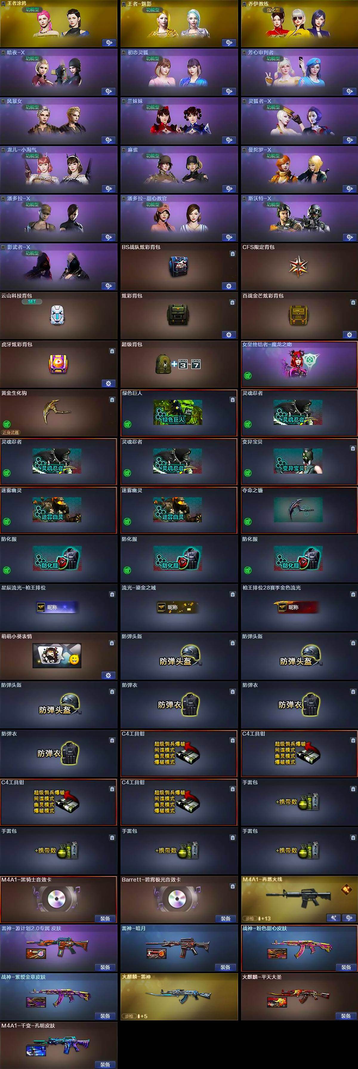 【道具】:BS战队炫彩背包,CFS限定背包,云山科技背包,炫彩背包,百战金芒炫彩背包,虎牙炫彩背包,超级背包,女皇终结者-魔龙之吻,黄金生化钩,绿色巨人,灵魂忍者*3,变异宝贝,迷雾幽灵*2,夺命之镰,防化服*3,星辰流光-枪王排位,流光-鎏金之域,枪王排位28赛季金色流光,萌萌小葵表情,防弹头盔*3,防弹衣*3,C4工具钳*4,手雷包*4