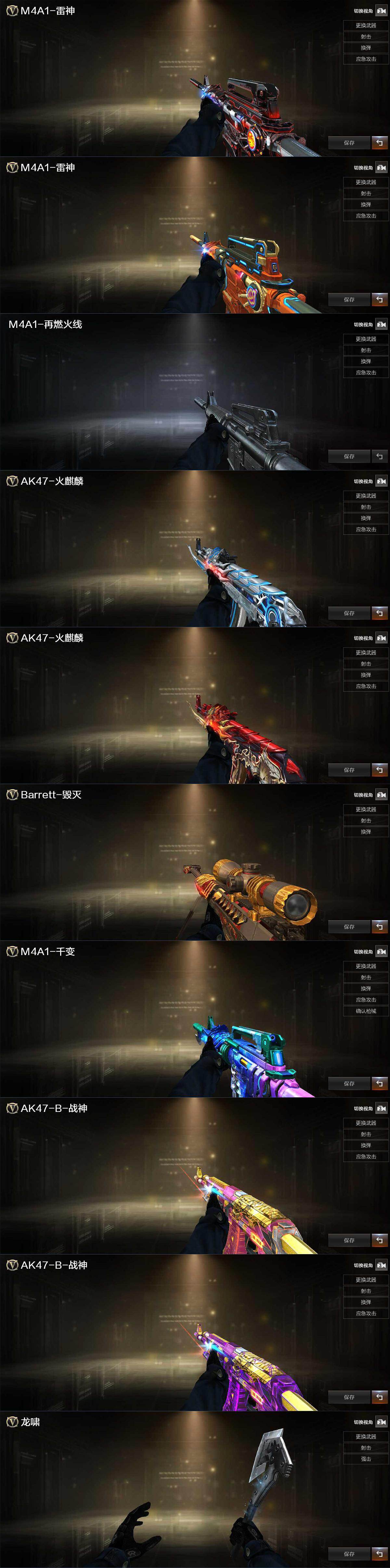 【英雄级武器】:AK47-火麒麟,M4A1-雷神,M4A1-黑骑士,M4A1-猎神,AK47-B-常胜将军,Barrett-毁灭,M200-幻神,COP 357-幻灵,屠龙,幻灵之锋,麒麟刺-百战金芒,王者之啸-觉醒版,闪光弹-雷霆王者-觉醒版,烟雾弹-幻灵,M4A1-赤狱骑士,Barrett-碧霄极光