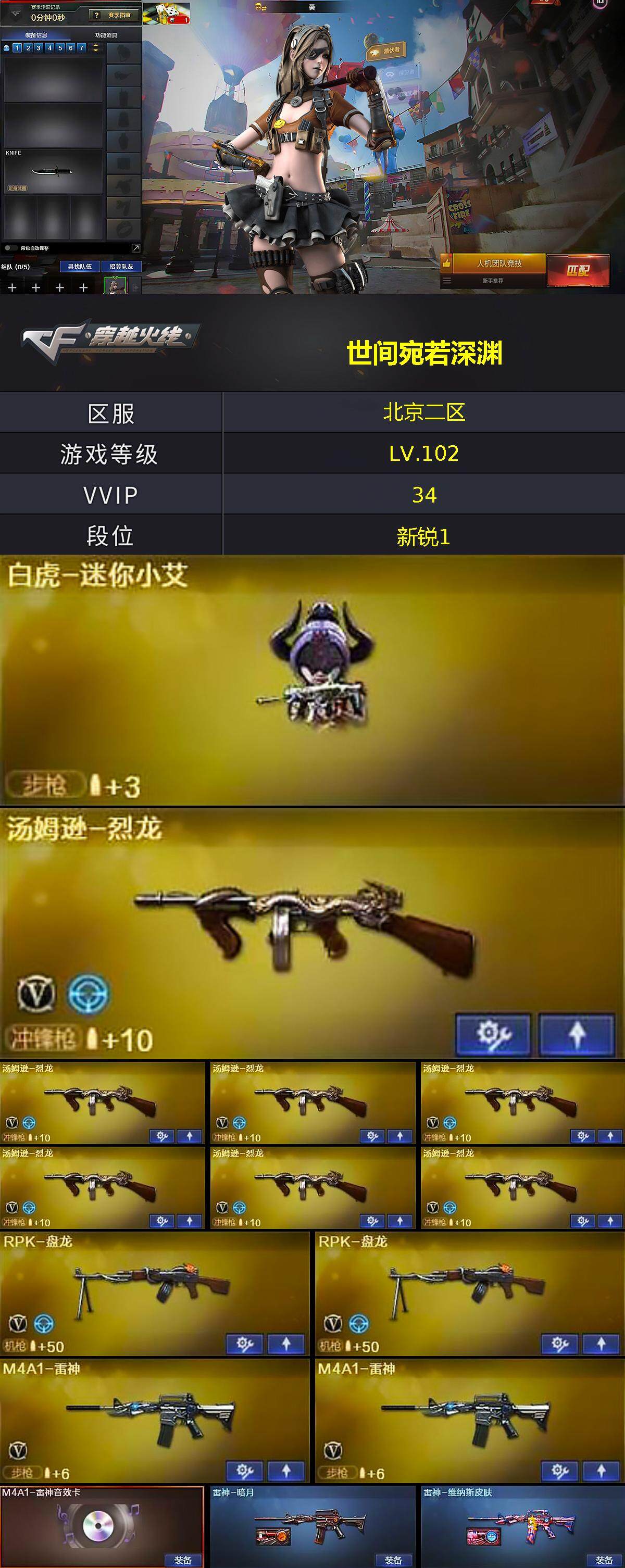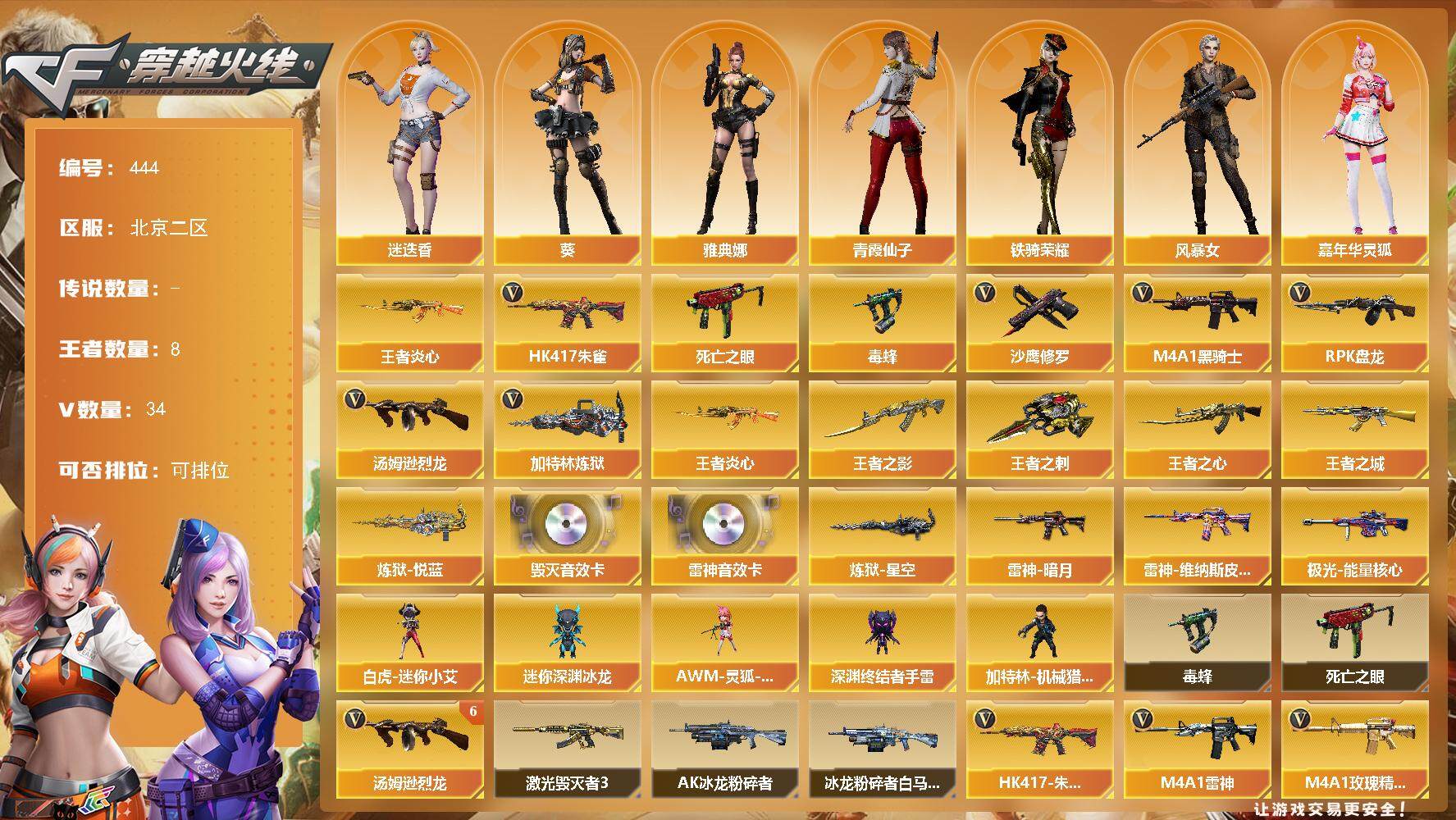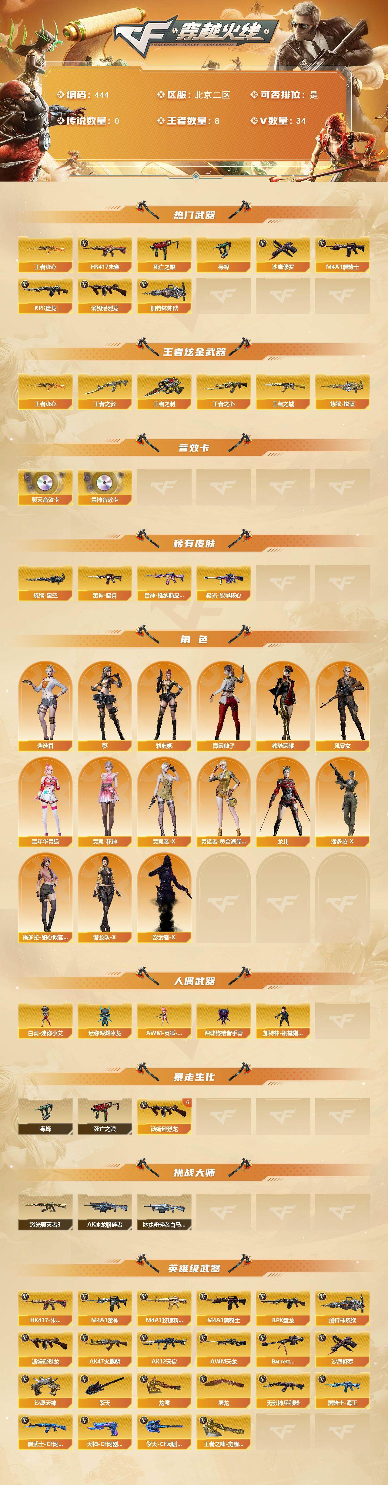 [14659460]北京二区-34V-8王者-0炫金 【热门武器】:HK417-朱雀,死亡之眼*2,王者炎心,毒蜂,M4A1-黑骑士,汤姆逊-烈龙*7,RPK-盘龙*2,加特林-炼狱,沙鹰-修罗*2 【王者炫金武器】:王者之城,王者炎心,王者之影,王者之心,炼狱-悦蓝,王者之刺 【音效卡】:M4A1-雷神音效卡,Barrett-毁灭音效卡 【皮肤】:雷神-暗月,雷神-维纳斯皮肤,极光-能量核心,炼狱-星空 【角色】:葵,迷迭香,风暴女,嘉年华灵狐,灵狐-花神,灵狐者-X,灵狐者-黄金海岸,龙儿,潘多拉-X,潘多拉-甜心教官,潜龙队-X,青霞仙子,铁骑荣耀,影武者-X,雅典娜 【人偶武器】:白虎-迷你小艾,加特林-机械猎手,AWM-灵狐-15周年嘉年华,迷你深渊冰龙,深渊终结者手雷 【暴走生化】:毒蜂,死亡之眼*2 【挑战大师】:AK47-冰龙粉碎者,冰龙粉碎者-白马银枪,激光毁灭者III*3 【英雄级武器】:AK47-火麒麟,M4A1-雷神*2,M4A1-黑骑士,AK12-天启,HK417-朱雀,无影-神兵利器,M4A1-玫瑰精灵,黑骑士-海王,黑武士-CF网剧冠军,AWM-天龙,Barrett-毁灭*3,RPK-盘龙*2,加特林-炼狱,汤姆逊-烈龙*7,沙鹰-修罗*2,沙鹰-天神,天神-CF网剧冠军,屠龙,龙啸,擎天,擎天-CF网剧冠军,王者之啸-觉醒版 【道具】:冰冰企鹅背包-猛男专用,战舰背包,炫彩背包,超级背包,绿色巨人,灵魂忍者,变异宝贝,迷雾幽灵,生化弹匣,夺命之镰,防化服*2,金色流光-枪王排位*2,防弹头盔*4,防弹衣*5,C4工具钳*4,手雷包*4 【特殊枪械】:1黑骑士,6烈龙,2盘龙,1炼狱