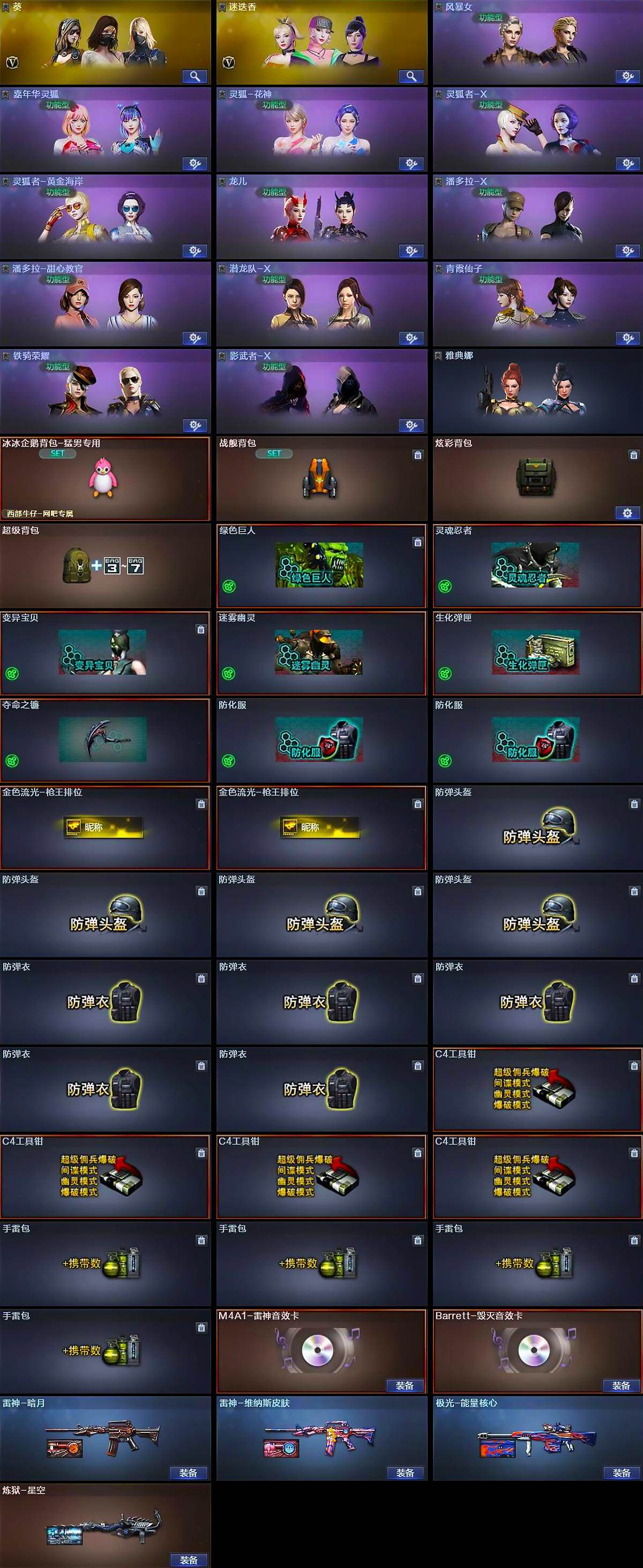 【道具】:冰冰企鹅背包-猛男专用,战舰背包,炫彩背包,超级背包,绿色巨人,灵魂忍者,变异宝贝,迷雾幽灵,生化弹匣,夺命之镰,防化服*2,金色流光-枪王排位*2,防弹头盔*4,防弹衣*5,C4工具钳*4,手雷包*4