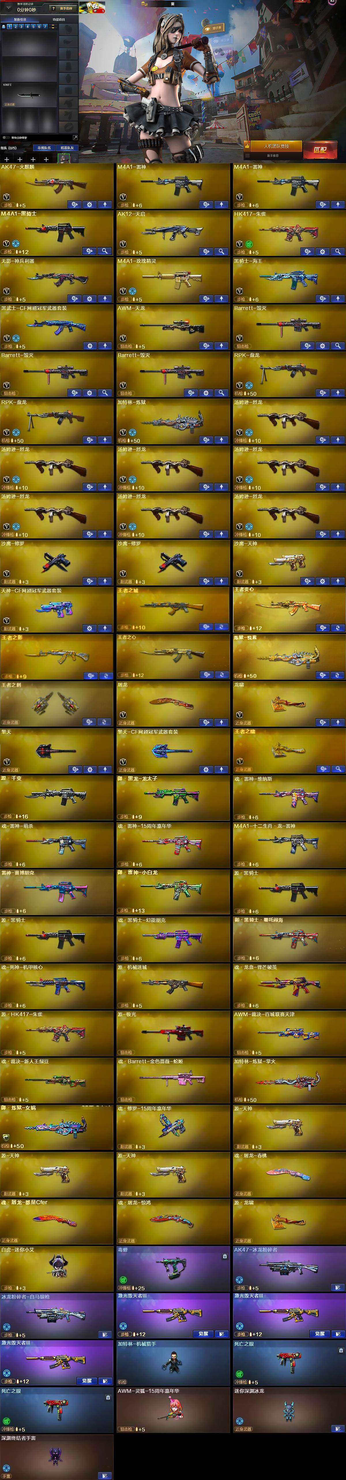 【英雄级武器】:AK47-火麒麟,M4A1-雷神*2,M4A1-黑骑士,AK12-天启,HK417-朱雀,无影-神兵利器,M4A1-玫瑰精灵,黑骑士-海王,黑武士-CF网剧冠军,AWM-天龙,Barrett-毁灭*3,RPK-盘龙*2,加特林-炼狱,汤姆逊-烈龙*7,沙鹰-修罗*2,沙鹰-天神,天神-CF网剧冠军,屠龙,龙啸,擎天,擎天-CF网剧冠军,王者之啸-觉醒版