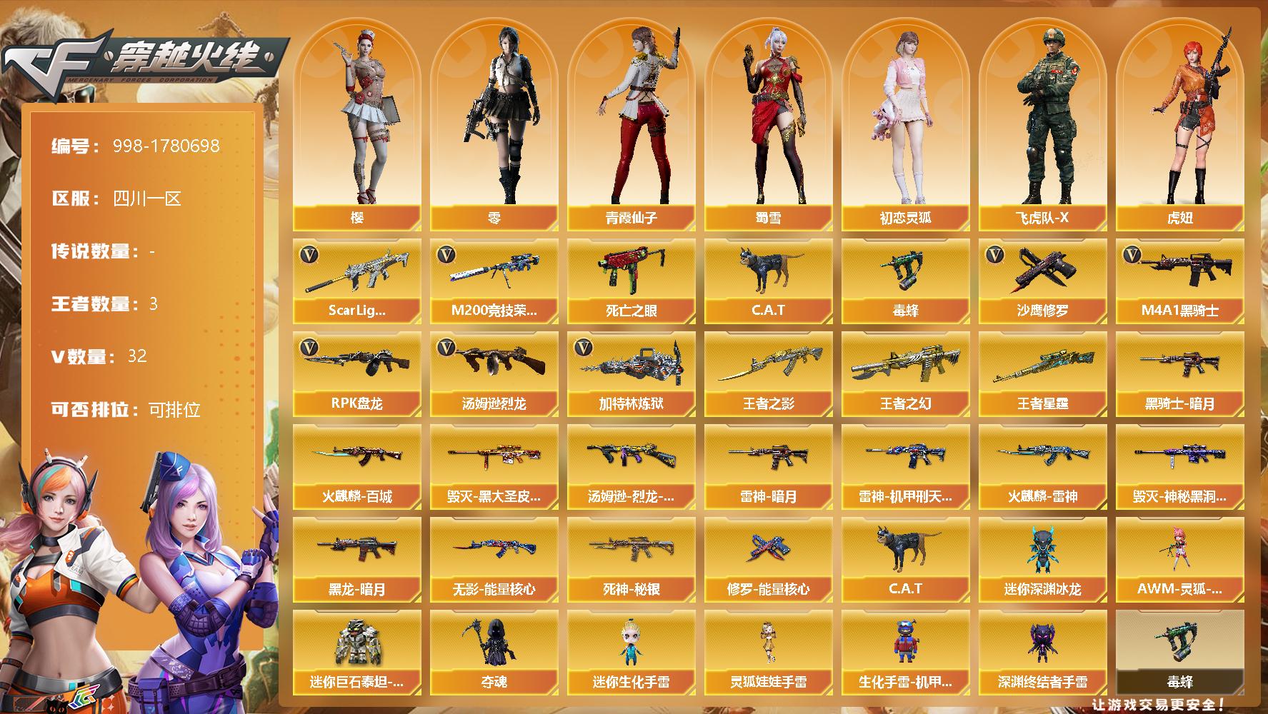 [14661465]30V/100级/元帅/3王者/2英雄/Scar Light-白虎/M200-竞技荣光/死亡之眼/C.A.T/毒蜂/M4A1-黑骑士/汤姆逊-烈龙/RPK-盘龙/加特林-炼狱/沙鹰-修罗/王者之幻/王者之影/王者星霆/汤姆逊-烈龙-末日皮肤/雷神-暗月/雷神-机甲刑天皮肤/火麒麟-雷神/火麒麟-百城/毁灭-黑大圣皮肤/毁灭-神秘黑洞皮肤/黑龙-暗月/黑骑士-暗月/无影-能量核心/死神-秘银/修罗-能量核心/零/樱/初恋灵狐/飞虎队-X/虎妞/嘉年华灵狐/猎狐者-追月/灵狐者-黄金海岸/灵狐者-七夕宝贝/龙儿-小淘气/潘多拉-X/青霞仙子/蜀雪/樱-战斗天使/影武者-X/AWM-灵狐-15周年嘉年华/迷你深渊冰龙/夺魂/迷你生化手雷/生化手雷-机甲核心/深渊终结者手雷/迷你巨石泰坦-魔花研究所/灵狐娃娃手雷/超级对讲机/冰龙粉碎者-白马银枪/激光毁灭者III-白马银枪/激光毁灭者/神圣爆裂者-末日/阐释者/AK47-火麒麟/M4A1-黑龙/M4A1-雷神/AK47-无影/M4A1-死神/QBZ03-云龙/AK47-黑武士-锦绣游龙/AWM-天龙/Barrett-毁灭/AWM-裁决/柯尔特-竞技荣光/COP357-云龙/屠龙/龙啸/擎天/麒麟刺/擎天-竞技荣光/CFS限定背包/全能枪王背包/战舰背包/超级背包/绿色巨人/灵魂忍者/变异宝贝/迷雾幽灵/生化弹匣/夺命之镰/防化服/星辰流光-枪王排位/流光-再燃火线/枪王排位28赛季金色流光/枪王排位29赛季金色流光/EP战队名片/EP战队击杀图标/C4-红龙/防弹头盔/防弹衣/C4工具钳/手雷包