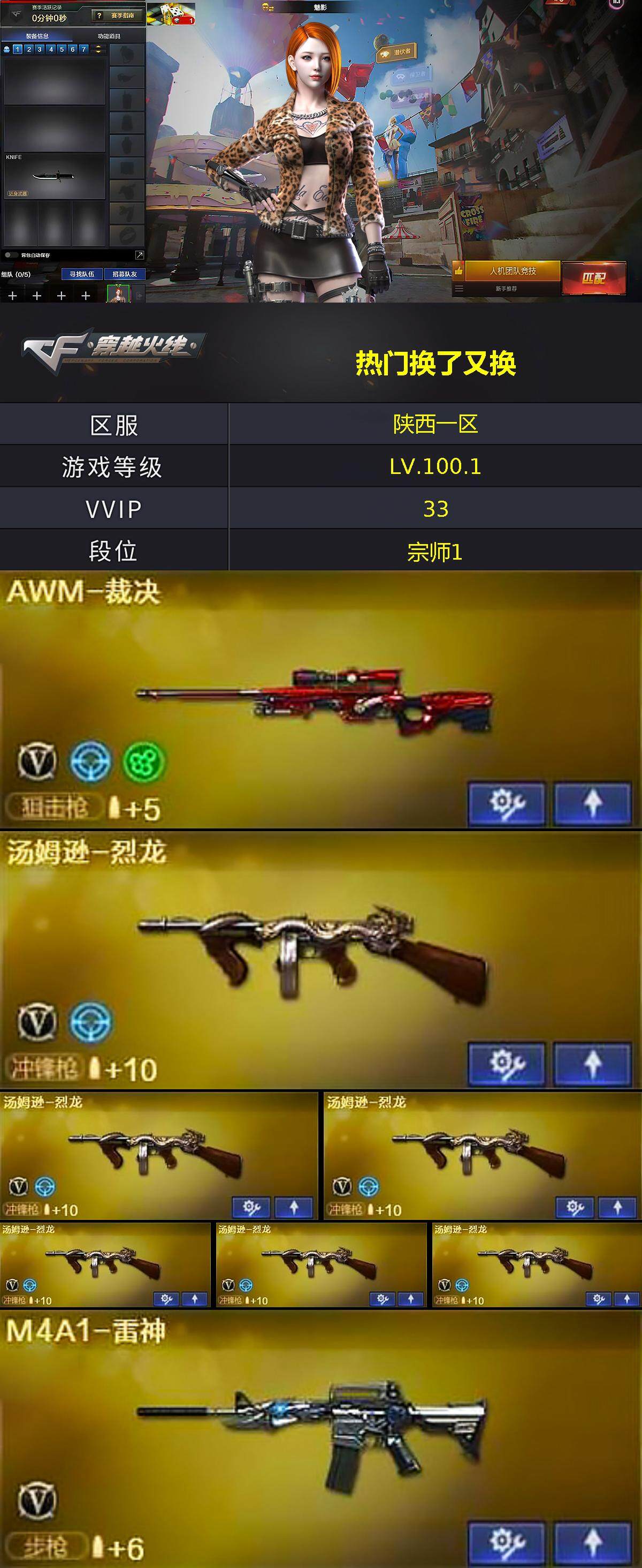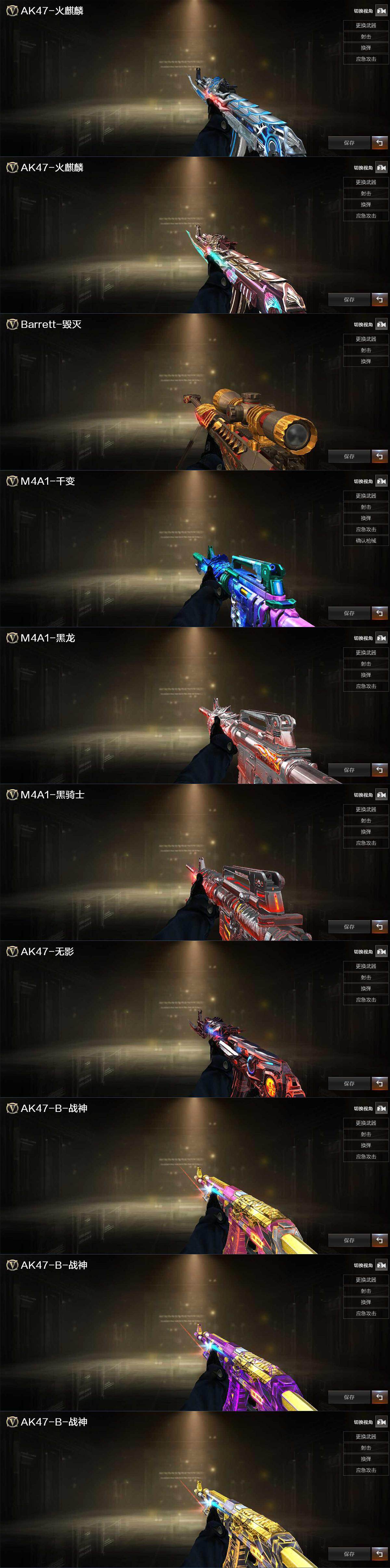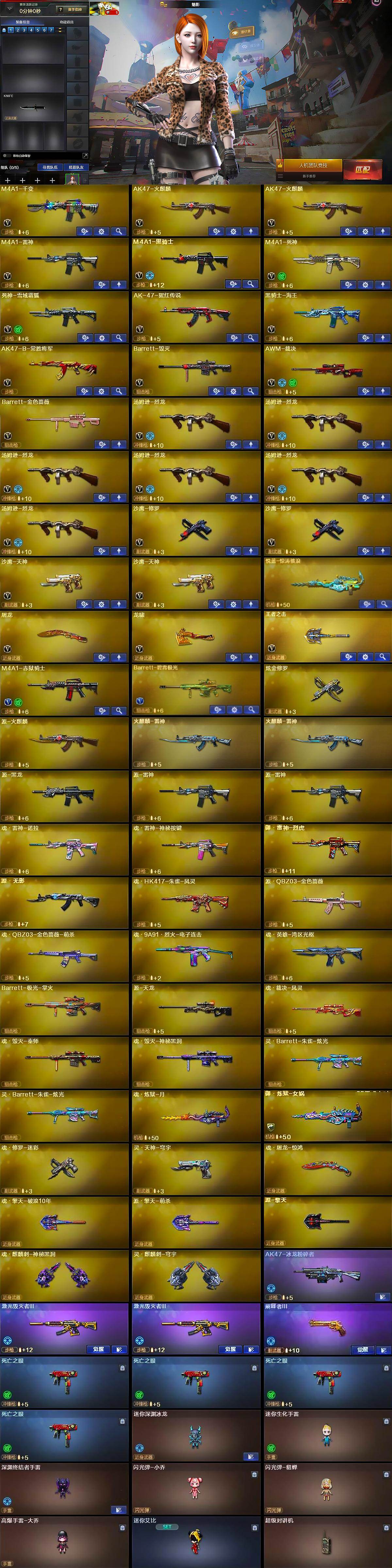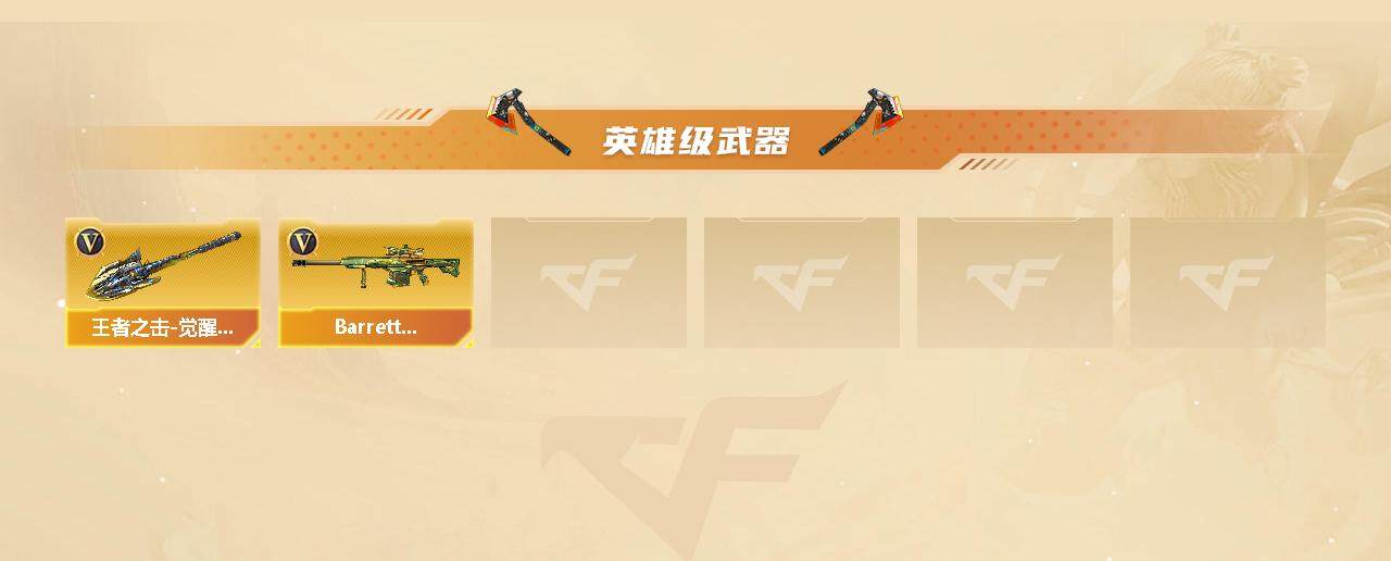 【英雄级武器】:M4A1-千变,AK47-火麒麟*2,M4A1-雷神,M4A1-黑骑士,M4A1-死神,死神-雪域霜狐,AK-47-猩红传说,黑骑士-海王,AK47-B-常胜将军,Barrett-毁灭,AWM-裁决,Barrett-金色蔷薇,汤姆逊-烈龙*6,沙鹰-修罗*2,沙鹰-天神*2,屠龙,龙啸,王者之击-觉醒版,M4A1-赤狱骑士,Barrett-碧霄极光