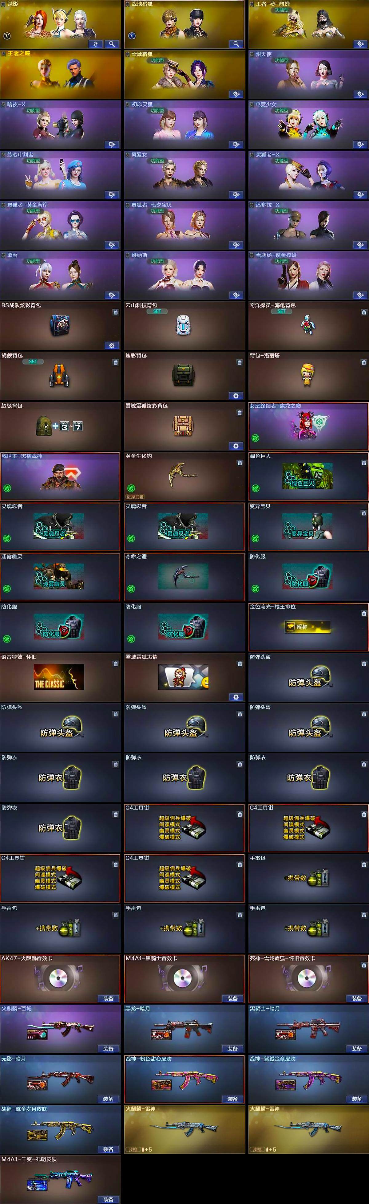 【道具】:BS战队炫彩背包,云山科技背包,奇洋探员-海龟背包,战舰背包,炫彩背包,背包-洛丽塔,超级背包,雪域霜狐炫彩背包,女皇终结者-魔龙之吻,救世主-黑桃战神,黄金生化钩,绿色巨人,灵魂忍者*2,变异宝贝,迷雾幽灵,夺命之镰,防化服*3,金色流光-枪王排位,语音特效-怀旧,雪域霜狐表情,防弹头盔*4,防弹衣*4,C4工具钳*4,手雷包*4