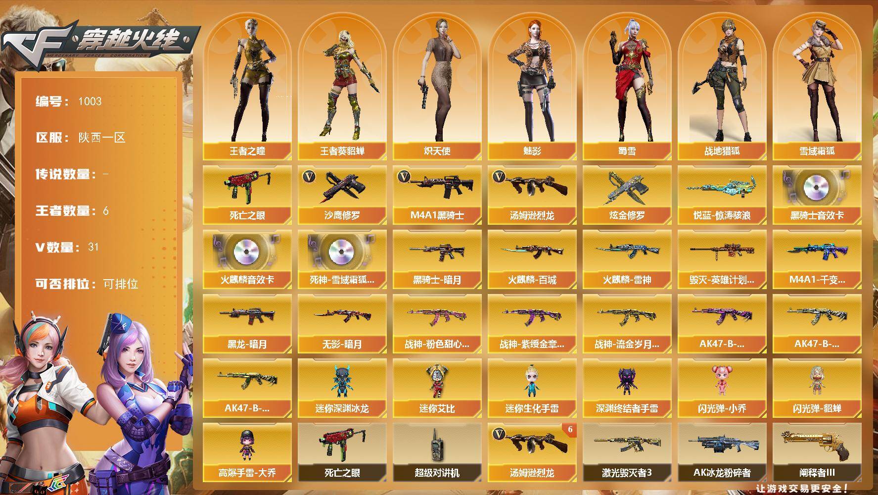 [14664569]陕西一区-31V-6王者-1炫金 【热门武器】:死亡之眼*4,M4A1-黑骑士,汤姆逊-烈龙*6,沙鹰-修罗*2 【王者炫金武器】:悦蓝-惊涛骇浪,炫金修罗 【音效卡】:AK47-火麒麟音效卡,M4A1-黑骑士音效卡,死神-雪域霜狐-怀旧音效卡 【皮肤】:火麒麟-雷神*2,火麒麟-百城,毁灭-英雄计划 皮肤,M4A1-千变-孔明皮肤,黑龙-暗月,黑骑士-暗月,无影-暗月,战神-粉色甜心皮肤,战神-紫绶金章皮肤,战神-流金岁月皮肤,AK47-B-常胜将军-曹操,AK47-B-常胜将军-刘备,AK47-B-常胜将军-孙权 【角色】:魅影,战地猎狐,王者-葵-貂蝉,王者之瞳,雪域霜狐,炽天使,暗夜-X,初恋灵狐,电竞少女,芳心审判者,风暴女,灵狐者-X,灵狐者-黄金海岸,灵狐者-七夕宝贝,流浪蔷薇,潘多拉-X,蜀雪,维纳斯,雪莉杨-摸金校尉,智影 【人偶武器】:迷你深渊冰龙,迷你生化手雷,深渊终结者手雷,闪光弹-小乔,闪光弹-貂蝉,高爆手雷-大乔,迷你艾比 【暴走生化】:死亡之眼*4,超级对讲机 【挑战大师】:AK47-冰龙粉碎者,激光毁灭者III*2,阐释者III 【英雄级武器】:M4A1-千变,AK47-火麒麟*2,M4A1-雷神,M4A1-黑骑士,M4A1-死神,死神-雪域霜狐,AK-47-猩红传说,黑骑士-海王,AK47-B-常胜将军,Barrett-毁灭,AWM-裁决,Barrett-金色蔷薇,汤姆逊-烈龙*6,沙鹰-修罗*2,沙鹰-天神*2,屠龙,龙啸,王者之击-觉醒版,M4A1-赤狱骑士,Barrett-碧霄极光 【道具】:BS战队炫彩背包,云山科技背包,奇洋探员-海龟背包,战舰背包,炫彩背包,背包-洛丽塔,超级背包,雪域霜狐炫彩背包,女皇终结者-魔龙之吻,救世主-黑桃战神,黄金生化钩,绿色巨人,灵魂忍者*2,变异宝贝,迷雾幽灵,夺命之镰,防化服*3,金色流光-枪王排位,语音特效-怀旧,雪域霜狐表情,防弹头盔*4,防弹衣*4,C4工具钳*4,手雷包*4 【特殊枪械】:1黑骑士,6烈龙