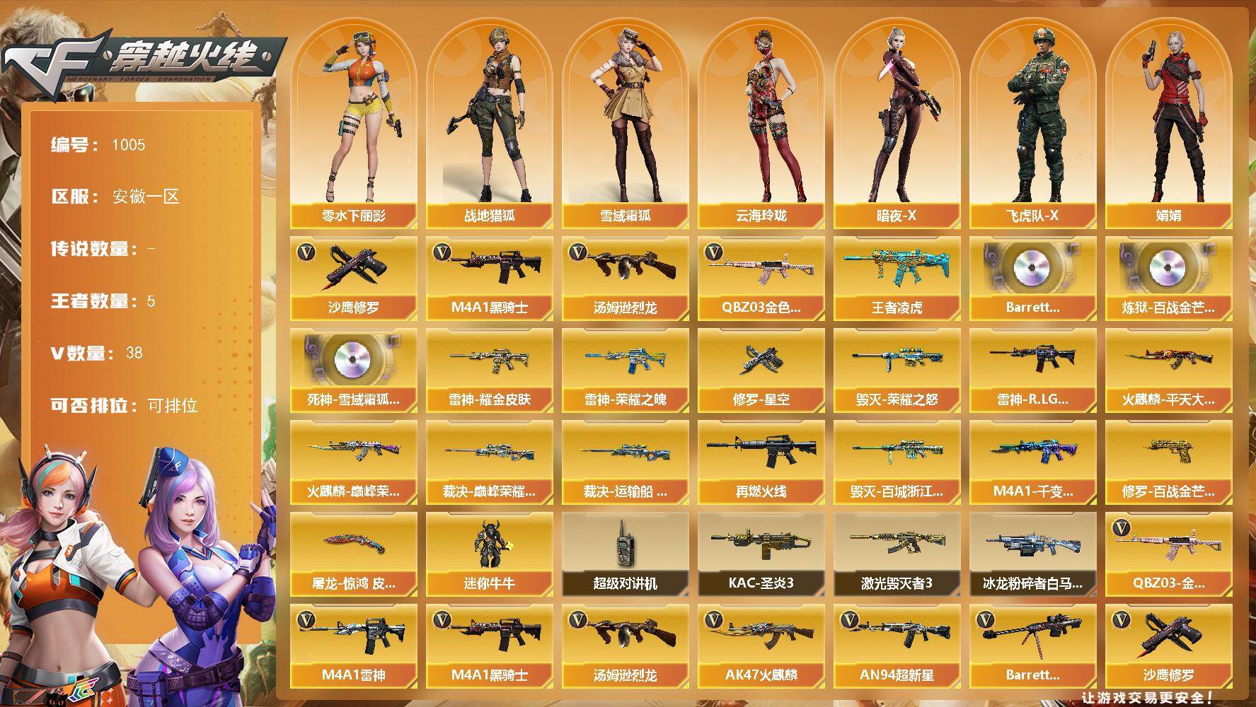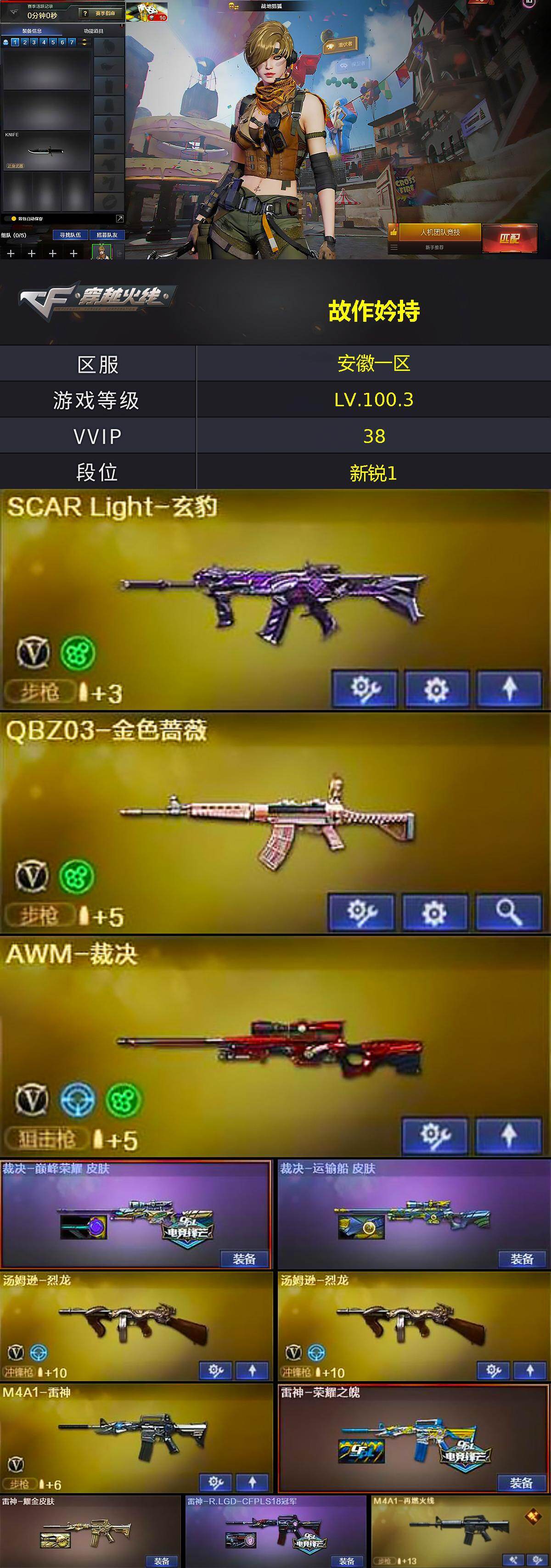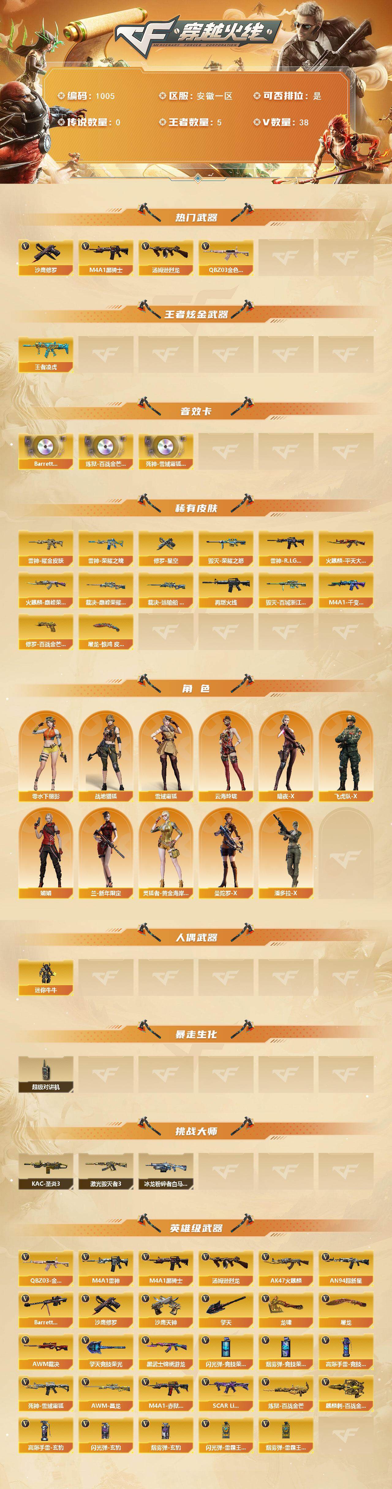 [14665210]安徽一区-38V-5王者-0炫金 【热门武器】:QBZ03-金色蔷薇,M4A1-黑骑士,汤姆逊-烈龙*2,沙鹰-修罗*2 【王者炫金武器】:王者凌虎 【音效卡】:Barrett-碧霄极光音效卡*3,炼狱-百战金芒-庆典舞曲音效卡,死神-雪域霜狐-怀旧音效卡 【皮肤】:裁决-巅峰荣耀 皮肤,裁决-运输船 皮肤,雷神-荣耀之魄,雷神-耀金皮肤,雷神-R.LGD-CFPLS18冠军,M4A1-再燃火线,火麒麟-平天大圣,火麒麟-巅峰荣耀,毁灭-荣耀之怒,毁灭-百城浙江 皮肤,M4A1-千变-孔明皮肤,修罗-星空,修罗-百战金芒 皮肤,屠龙-惊鸿 皮肤 【角色】:战地猎狐,雪域霜狐,云海玲珑,暗夜-X,飞虎队-X,娟娟,兰-新年限定,零-水下丽影,灵狐者-黄金海岸,曼陀罗-X,潘多拉-X 【人偶武器】:迷你牛牛 【暴走生化】:超级对讲机 【挑战大师】:冰龙粉碎者-白马银枪,激光毁灭者III,KAC-圣炎切割者III 【英雄级武器】:AK47-火麒麟*2,M4A1-雷神,M4A1-黑骑士,AN94-超新星,黑武士-锦绣游龙,死神-雪域霜狐,SCAR Light-玄豹,QBZ03-金色蔷薇,Barrett-毁灭,AWM-裁决,炼狱-百战金芒,汤姆逊-烈龙*2,沙鹰-修罗*2,沙鹰-天神*2,屠龙,龙啸,擎天,擎天-竞技荣光,麒麟刺-百战金芒,高爆手雷-竞技荣光,高爆手雷-玄豹*2,闪光弹-竞技荣光,闪光弹-玄豹*2,闪光弹-雷霆王者-觉醒版,烟雾弹-竞技荣光,烟雾弹-玄豹*2,烟雾弹-雷霆王者-觉醒版,M4A1-赤狱骑士,AWM-昌龙 【道具】:BS战队炫彩背包,CFS限定背包,云山科技背包,亚洲杯纪念炫彩背包,炫彩背包-诺拉,百战金芒炫彩背包,雪域霜狐炫彩背包,哔哩哔哩名片,女皇终结者-魔龙之吻,黄金生化钩,绿色巨人,灵魂忍者*2,迷雾幽灵,夺命之镰,防化服*3,流光-鎏金之域,流光-再燃火线,枪王排位28赛季金色流光,枪王排位29赛季金色流光,语音特效-盛典烟火,语音特效-怀旧,雪域霜狐表情,萌萌小葵表情,EP战队击杀图标,C4-沙漠,防弹头盔,防弹衣,C4工具钳,手雷包 【特殊枪械】:1黑骑士,2烈龙