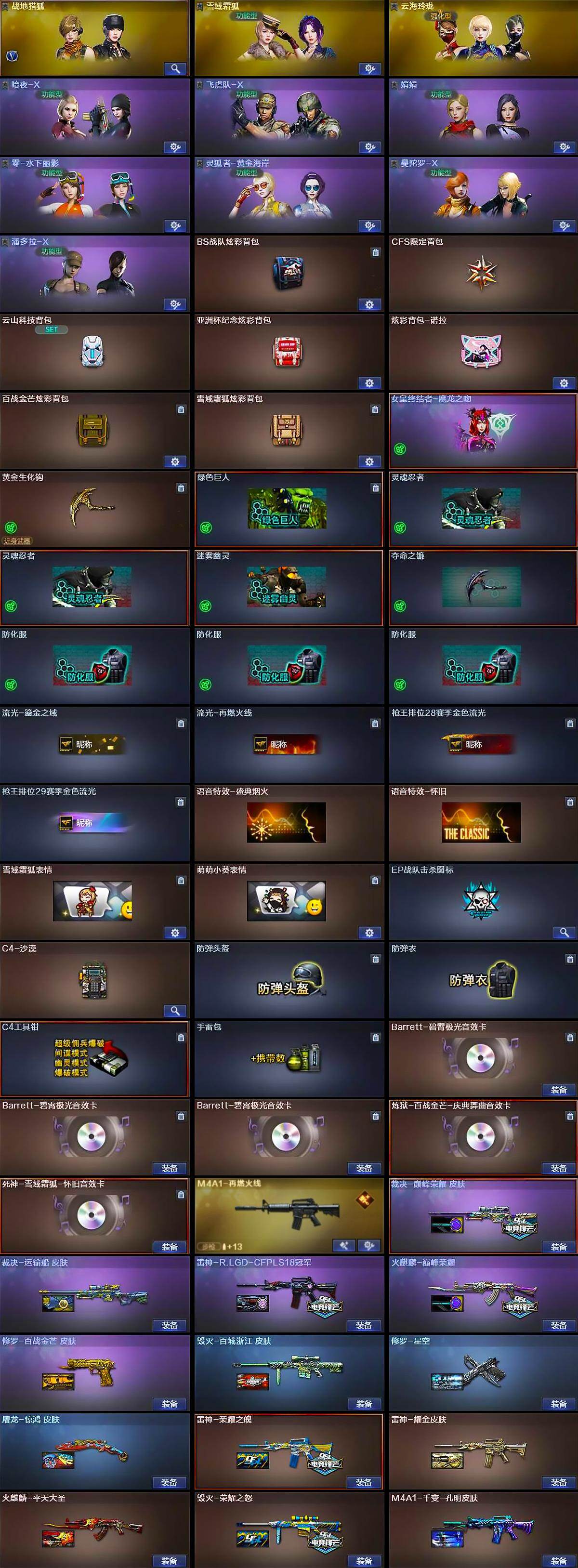 【道具】:BS战队炫彩背包,CFS限定背包,云山科技背包,亚洲杯纪念炫彩背包,炫彩背包-诺拉,百战金芒炫彩背包,雪域霜狐炫彩背包,哔哩哔哩名片,女皇终结者-魔龙之吻,黄金生化钩,绿色巨人,灵魂忍者*2,迷雾幽灵,夺命之镰,防化服*3,流光-鎏金之域,流光-再燃火线,枪王排位28赛季金色流光,枪王排位29赛季金色流光,语音特效-盛典烟火,语音特效-怀旧,雪域霜狐表情,萌萌小葵表情,EP战队击杀图标,C4-沙漠,防弹头盔,防弹衣,C4工具钳,手雷包