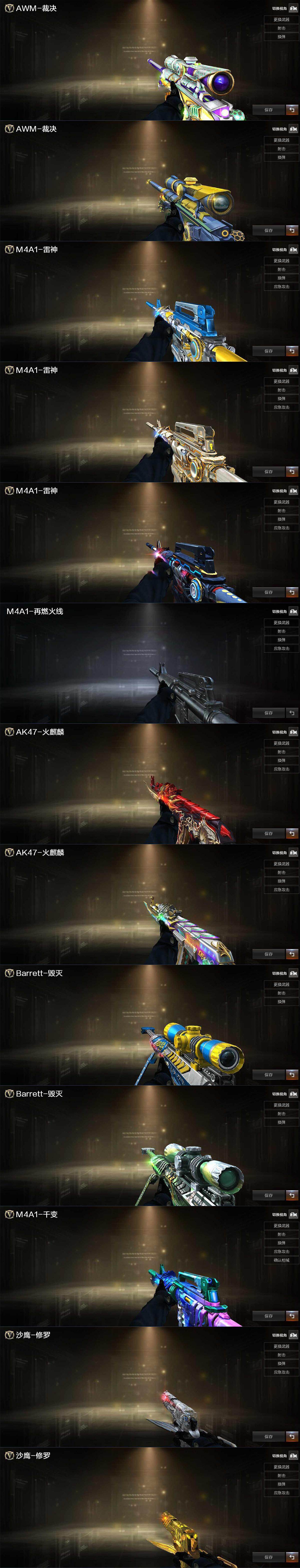 【英雄级武器】:AK47-火麒麟*2,M4A1-雷神,M4A1-黑骑士,AN94-超新星,黑武士-锦绣游龙,死神-雪域霜狐,SCAR Light-玄豹,QBZ03-金色蔷薇,Barrett-毁灭,AWM-裁决,炼狱-百战金芒,汤姆逊-烈龙*2,沙鹰-修罗*2,沙鹰-天神*2,屠龙,龙啸,擎天,擎天-竞技荣光,麒麟刺-百战金芒,高爆手雷-竞技荣光,高爆手雷-玄豹*2,闪光弹-竞技荣光,闪光弹-玄豹*2,闪光弹-雷霆王者-觉醒版,烟雾弹-竞技荣光,烟雾弹-玄豹*2,烟雾弹-雷霆王者-觉醒版,M4A1-赤狱骑士,AWM-昌龙