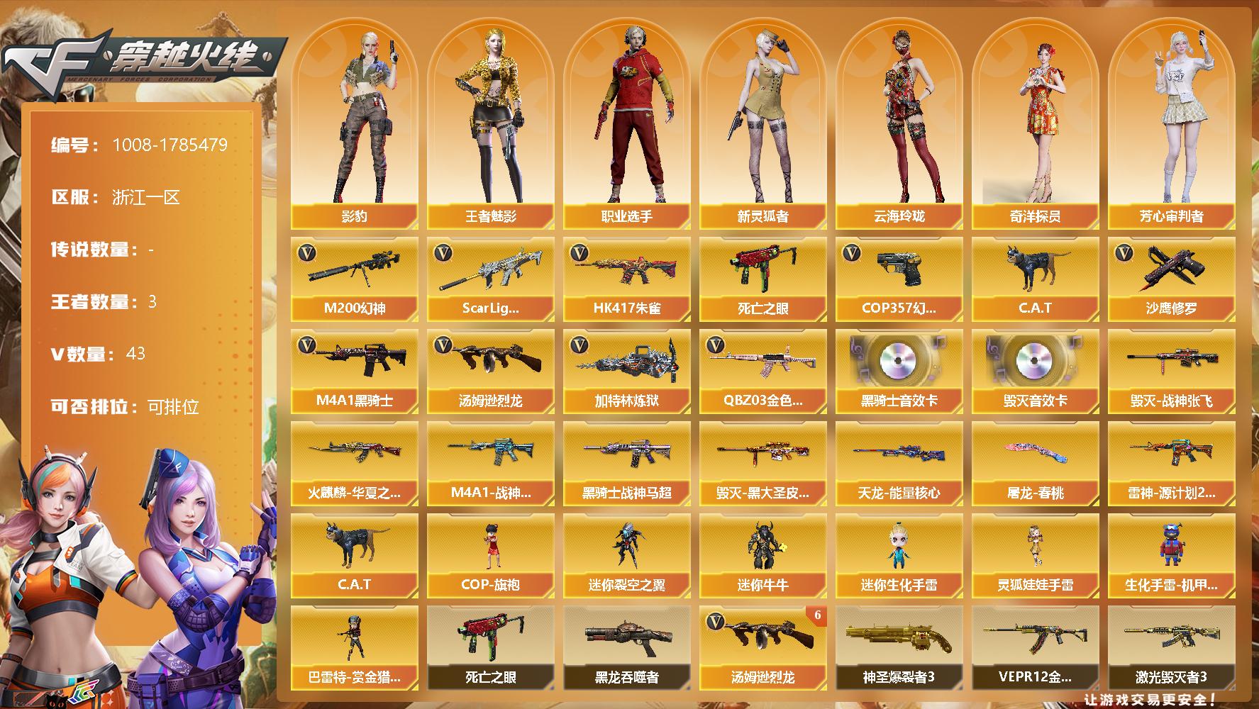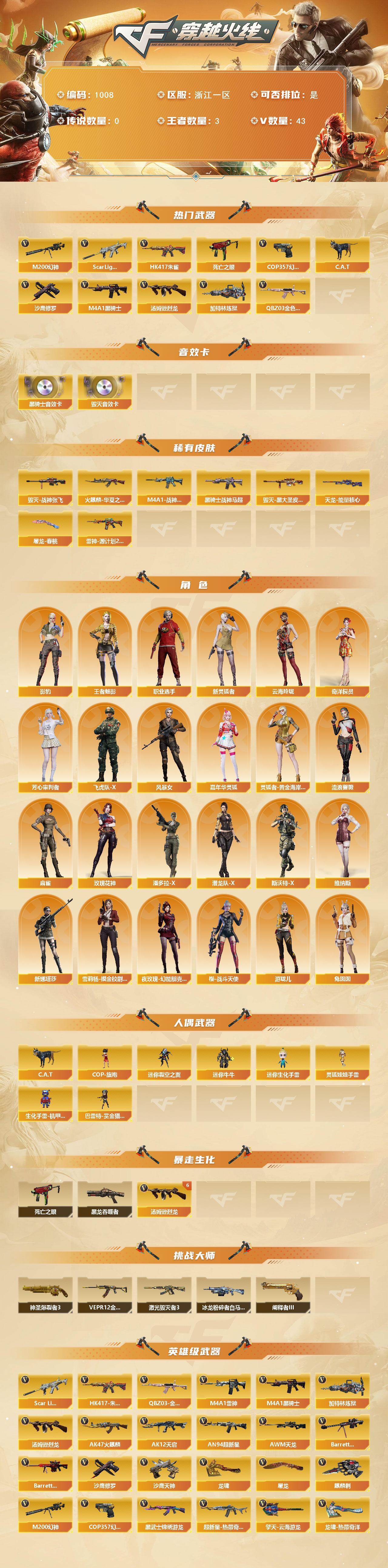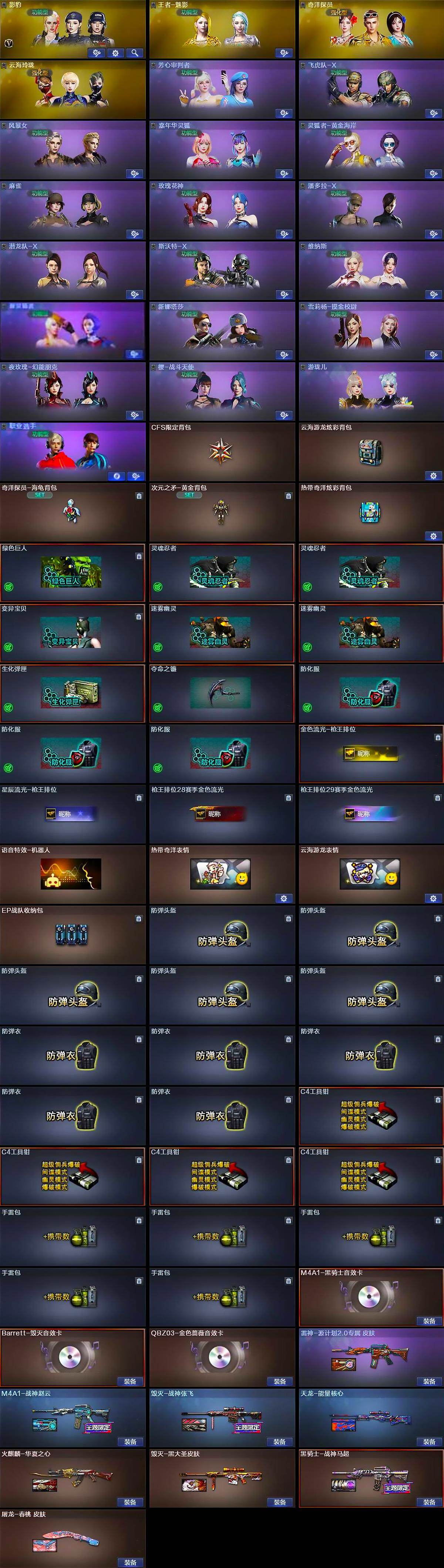 [14665368]42V/100级/元帅/3王者/1英雄/QBZ03-金色蔷薇/Scar Light-白虎/HK417-朱雀/M200-幻神/死亡之眼/C.A.T/M4A1-黑骑士/汤姆逊-烈龙/加特林-炼狱/COP 357-幻灵/沙鹰-修罗/M4A1-黑骑士音效卡/Barrett-毁灭音效卡/M4A1-战神赵云/雷神-源计划2.0专属 皮肤/火麒麟-华夏之心/毁灭-战神张飞/毁灭-黑大圣皮肤/黑骑士-战神马超/天龙-能量核心/屠龙-春桃/影豹/王者-魅影/奇洋探员/云海玲珑/芳心审判者/飞虎队-X/风暴女/嘉年华灵狐/灵狐者-黄金海岸/流浪蔷薇/麻雀/玫瑰花神/潘多拉-X/潜龙队-X/斯沃特-X/兔囡囡/维纳斯/新灵狐者/新娜塔莎/雪莉杨-摸金校尉/夜玫瑰-幻能朋克/樱-战斗天使/游珑儿/职业选手/COP-旗袍/迷你裂空之翼/迷你牛牛/迷你生化手雷/生化手雷-机甲核心/巴雷特-赏金猎人/灵狐娃娃手雷/黑龙吞噬者/6烈龙/神圣爆裂者/冰龙粉碎者-白马银枪/VEPR-12-金魔/激光毁灭者/阐释者/AK47-火麒麟/M4A1-雷神/AK12-天启/AN94-超新星/AK47-黑武士-锦绣游龙/超新星-热带奇洋/AWM-天龙/Barrett-毁灭/Barrett-极光/王者之怒-觉醒版/烈龙-云海游龙/沙鹰-天神/屠龙/龙啸/麒麟刺/擎天-云海游龙/龙啸-热带奇洋/王者之锋-觉醒版/高爆手雷-幻灵/高爆手雷-云龙/手雷-云海游龙/手雷-热带奇洋/闪光弹-幻灵/烟雾弹-幻灵/烟雾弹-云龙/CFS限定背包/云海游龙炫彩背包/奇洋探员-海龟背包/次元之矛-黄金背包/热带奇洋炫彩背包/绿色巨人/灵魂忍者/变异宝贝/迷雾幽灵/生化弹匣/夺命之镰/防化服/金色流光-枪王排位/星辰流光-枪王排位/枪王排位28赛季金色流光/枪王排位29赛季金色流光/语音特效-机器人/热带奇洋表情/云海游龙表情/EP战队收纳包/防弹头盔/防弹衣/C4工具钳/手雷包
