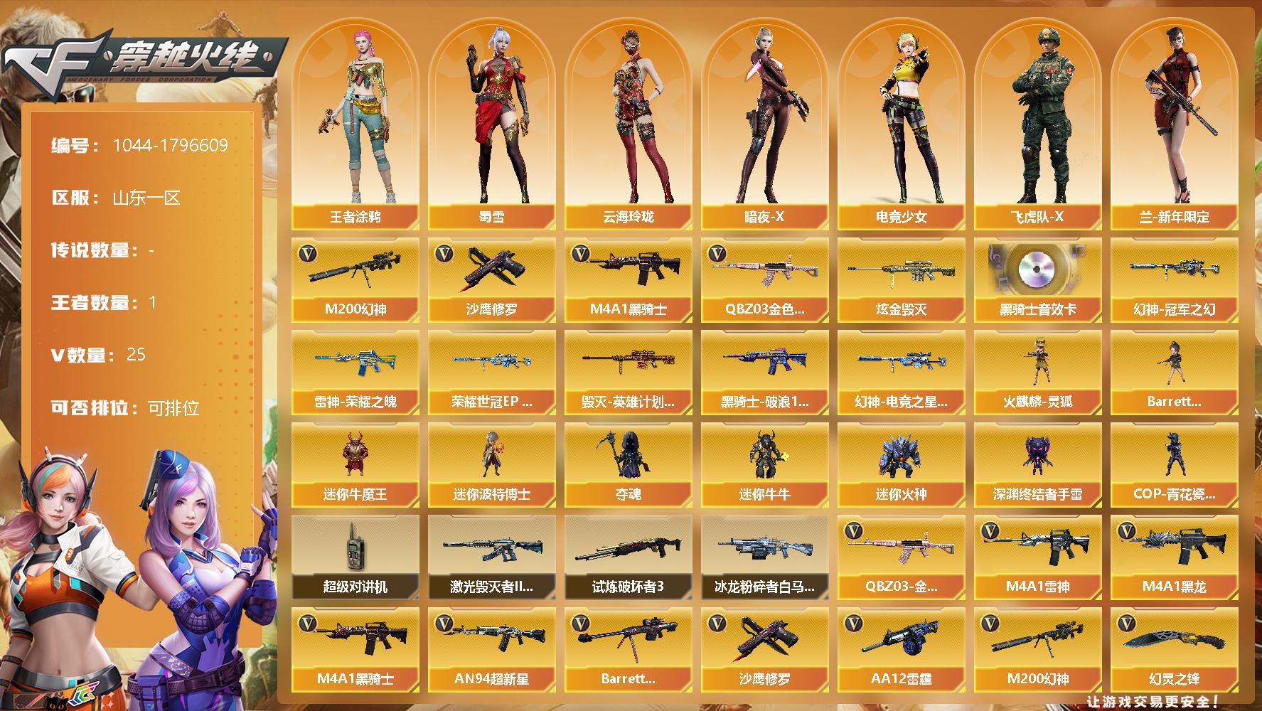 [14665502]23V/100级/元帅/1王者/1炫金/2英雄/QBZ03-金色蔷薇/M200-幻神/M4A1-黑骑士/沙鹰-修罗/炫金毁灭/M4A1-黑骑士音效卡/幻神冠军之幻/幻神-荣耀世冠EP 皮肤/幻神-电竞之星 皮肤/雷神荣耀之魄/毁灭-英雄计划 皮肤/黑骑士-破浪10年皮肤/妮妮/王者涂鸦/云海玲珑/暗夜-X/电竞少女/飞虎队-X/兰-新年限定/灵狐者-黄金海岸/灵狐者-七夕宝贝/曼陀罗-X/潘多拉-甜心教官/蜀雪/兔囡囡/影武者-X/火麒麟-灵狐/迷你牛魔王/迷你波特博士/夺魂/迷你牛牛/迷你火种/深渊终结者手雷/COP-青花瓷-斯沃特精英/Barrett-夜玫瑰/超级对讲机/冰龙粉碎者-白马银枪/激光毁灭者III-白马银枪/试炼破坏者/M4A1-黑龙/M4A1-雷神/AN94-超新星/Barrett-毁灭/烈龙-云海游龙/AA-12-雷霆/幻灵之锋/擎天-云海游龙/高爆手雷-幻灵/手雷-云海游龙/闪光弹-幻灵/烟雾弹-幻灵/烟雾弹-云龙/烟雾弹-荣耀世冠EP/CFS限定背包/云海游龙炫彩背包/次元之矛-黄金背包/绿色巨人/灵魂忍者/迷雾幽灵/生化弹匣/夺命之镰/防化服/金色流光-枪王排位/星辰流光-枪王排位/流光-再燃火线/枪王排位28赛季金色流光/云海游龙表情/C4-沙漠/防弹头盔/防弹衣/C4工具钳/手雷包